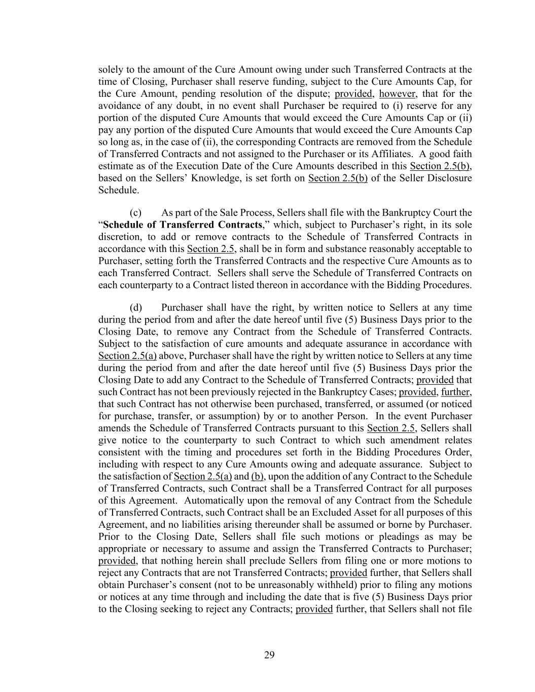 29 solely to the amount of the Cure Amount owing under such Transferred Contracts at the time of Closing, Purchaser shall reserve funding, subject to the Cure Amounts Cap, for the Cure Amount, pending resolution of the dispute; provided, however, that for the avoidance of any doubt, in no event shall Purchaser be required to (i) reserve for any portion of the disputed Cure Amounts that would exceed the Cure Amounts Cap or (ii) pay any portion of the disputed Cure Amounts that would exceed the Cure Amounts Cap so long as, in the case of (ii), the corresponding Contracts are removed from the Schedule of Transferred Contracts and not assigned to the Purchaser or its Affiliates. A good faith estimate as of the Execution Date of the Cure Amounts described in this Section 2.5(b), based on the Sellers’ Knowledge, is set forth on Section 2.5(b) of the Seller Disclosure Schedule. (c) As part of the Sale Process, Sellers shall file with the Bankruptcy Court the “Schedule of Transferred Contracts,” which, subject to Purchaser’s right, in its sole discretion, to add or remove contracts to the Schedule of Transferred Contracts in accordance with this Section 2.5, shall be in form and substance reasonably acceptable to Purchaser, setting forth the Transferred Contracts and the respective Cure Amounts as to each Transferred Contract. Sellers shall serve the Schedule of Transferred Contracts on each counterparty to a Contract listed thereon in accordance with the Bidding Procedures. (d) Purchaser shall have the right, by written notice to Sellers at any time during the period from and after the date hereof until five (5) Business Days prior to the Closing Date, to remove any Contract from the Schedule of Transferred Contracts. Subject to the satisfaction of cure amounts and adequate assurance in accordance with Section 2.5(a) above, Purchaser shall have the right by written notice to Sellers at any time during the period from and after the date hereof until five (5) Business Days prior the Closing Date to add any Contract to the Schedule of Transferred Contracts; provided that such Contract has not been previously rejected in the Bankruptcy Cases; provided, further, that such Contract has not otherwise been purchased, transferred, or assumed (or noticed for purchase, transfer, or assumption) by or to another Person. In the event Purchaser amends the Schedule of Transferred Contracts pursuant to this Section 2.5, Sellers shall give notice to the counterparty to such Contract to which such amendment relates consistent with the timing and procedures set forth in the Bidding Procedures Order, including with respect to any Cure Amounts owing and adequate assurance. Subject to the satisfaction of Section 2.5(a) and (b), upon the addition of any Contract to the Schedule of Transferred Contracts, such Contract shall be a Transferred Contract for all purposes of this Agreement. Automatically upon the removal of any Contract from the Schedule of Transferred Contracts, such Contract shall be an Excluded Asset for all purposes of this Agreement, and no liabilities arising thereunder shall be assumed or borne by Purchaser. Prior to the Closing Date, Sellers shall file such motions or pleadings as may be appropriate or necessary to assume and assign the Transferred Contracts to Purchaser; provided, that nothing herein shall preclude Sellers from filing one or more motions to reject any Contracts that are not Transferred Contracts; provided further, that Sellers shall obtain Purchaser’s consent (not to be unreasonably withheld) prior to filing any motions or notices at any time through and including the date that is five (5) Business Days prior to the Closing seeking to reject any Contracts; provided further, that Sellers shall not file