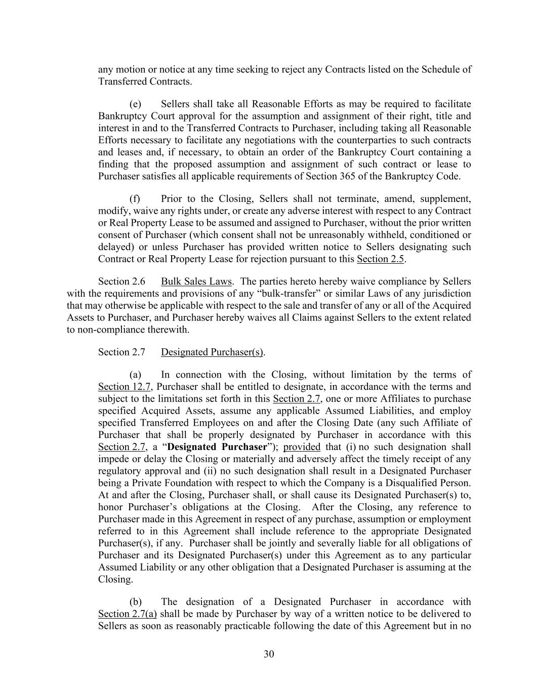 30 any motion or notice at any time seeking to reject any Contracts listed on the Schedule of Transferred Contracts. (e) Sellers shall take all Reasonable Efforts as may be required to facilitate Bankruptcy Court approval for the assumption and assignment of their right, title and interest in and to the Transferred Contracts to Purchaser, including taking all Reasonable Efforts necessary to facilitate any negotiations with the counterparties to such contracts and leases and, if necessary, to obtain an order of the Bankruptcy Court containing a finding that the proposed assumption and assignment of such contract or lease to Purchaser satisfies all applicable requirements of Section 365 of the Bankruptcy Code. (f) Prior to the Closing, Sellers shall not terminate, amend, supplement, modify, waive any rights under, or create any adverse interest with respect to any Contract or Real Property Lease to be assumed and assigned to Purchaser, without the prior written consent of Purchaser (which consent shall not be unreasonably withheld, conditioned or delayed) or unless Purchaser has provided written notice to Sellers designating such Contract or Real Property Lease for rejection pursuant to this Section 2.5. Section 2.6 Bulk Sales Laws. The parties hereto hereby waive compliance by Sellers with the requirements and provisions of any “bulk-transfer” or similar Laws of any jurisdiction that may otherwise be applicable with respect to the sale and transfer of any or all of the Acquired Assets to Purchaser, and Purchaser hereby waives all Claims against Sellers to the extent related to non-compliance therewith. Section 2.7 Designated Purchaser(s). (a) In connection with the Closing, without limitation by the terms of Section 12.7, Purchaser shall be entitled to designate, in accordance with the terms and subject to the limitations set forth in this Section 2.7, one or more Affiliates to purchase specified Acquired Assets, assume any applicable Assumed Liabilities, and employ specified Transferred Employees on and after the Closing Date (any such Affiliate of Purchaser that shall be properly designated by Purchaser in accordance with this Section 2.7, a “Designated Purchaser”); provided that (i) no such designation shall impede or delay the Closing or materially and adversely affect the timely receipt of any regulatory approval and (ii) no such designation shall result in a Designated Purchaser being a Private Foundation with respect to which the Company is a Disqualified Person. At and after the Closing, Purchaser shall, or shall cause its Designated Purchaser(s) to, honor Purchaser’s obligations at the Closing. After the Closing, any reference to Purchaser made in this Agreement in respect of any purchase, assumption or employment referred to in this Agreement shall include reference to the appropriate Designated Purchaser(s), if any. Purchaser shall be jointly and severally liable for all obligations of Purchaser and its Designated Purchaser(s) under this Agreement as to any particular Assumed Liability or any other obligation that a Designated Purchaser is assuming at the Closing. (b) The designation of a Designated Purchaser in accordance with Section 2.7(a) shall be made by Purchaser by way of a written notice to be delivered to Sellers as soon as reasonably practicable following the date of this Agreement but in no