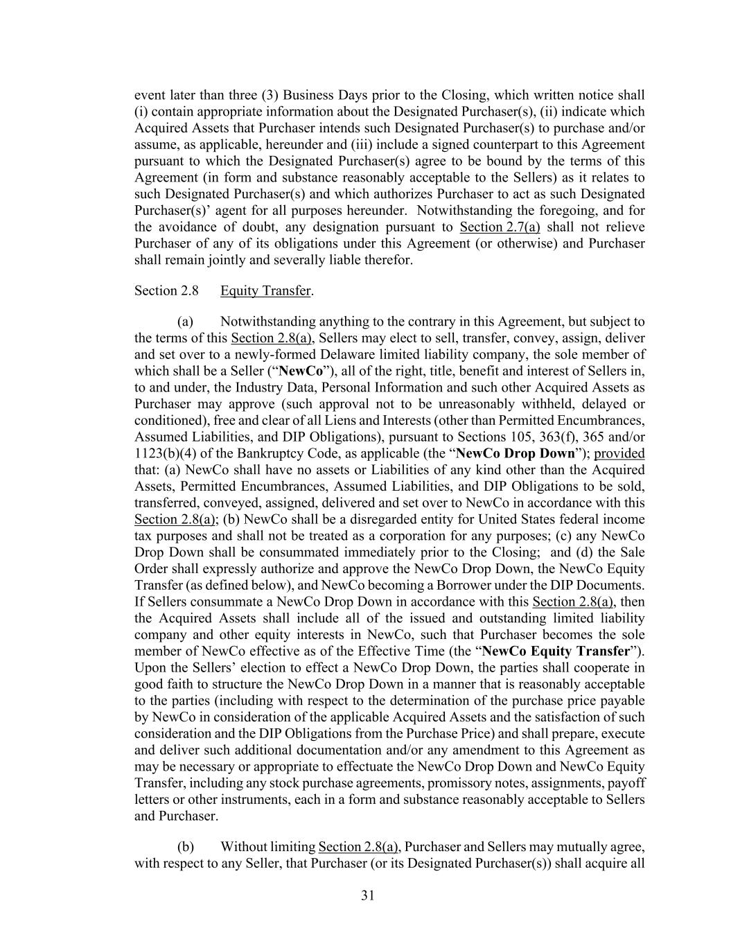 31 event later than three (3) Business Days prior to the Closing, which written notice shall (i) contain appropriate information about the Designated Purchaser(s), (ii) indicate which Acquired Assets that Purchaser intends such Designated Purchaser(s) to purchase and/or assume, as applicable, hereunder and (iii) include a signed counterpart to this Agreement pursuant to which the Designated Purchaser(s) agree to be bound by the terms of this Agreement (in form and substance reasonably acceptable to the Sellers) as it relates to such Designated Purchaser(s) and which authorizes Purchaser to act as such Designated Purchaser(s)’ agent for all purposes hereunder. Notwithstanding the foregoing, and for the avoidance of doubt, any designation pursuant to Section 2.7(a) shall not relieve Purchaser of any of its obligations under this Agreement (or otherwise) and Purchaser shall remain jointly and severally liable therefor. Section 2.8 Equity Transfer. (a) Notwithstanding anything to the contrary in this Agreement, but subject to the terms of this Section 2.8(a), Sellers may elect to sell, transfer, convey, assign, deliver and set over to a newly-formed Delaware limited liability company, the sole member of which shall be a Seller (“NewCo”), all of the right, title, benefit and interest of Sellers in, to and under, the Industry Data, Personal Information and such other Acquired Assets as Purchaser may approve (such approval not to be unreasonably withheld, delayed or conditioned), free and clear of all Liens and Interests (other than Permitted Encumbrances, Assumed Liabilities, and DIP Obligations), pursuant to Sections 105, 363(f), 365 and/or 1123(b)(4) of the Bankruptcy Code, as applicable (the “NewCo Drop Down”); provided that: (a) NewCo shall have no assets or Liabilities of any kind other than the Acquired Assets, Permitted Encumbrances, Assumed Liabilities, and DIP Obligations to be sold, transferred, conveyed, assigned, delivered and set over to NewCo in accordance with this Section 2.8(a); (b) NewCo shall be a disregarded entity for United States federal income tax purposes and shall not be treated as a corporation for any purposes; (c) any NewCo Drop Down shall be consummated immediately prior to the Closing; and (d) the Sale Order shall expressly authorize and approve the NewCo Drop Down, the NewCo Equity Transfer (as defined below), and NewCo becoming a Borrower under the DIP Documents. If Sellers consummate a NewCo Drop Down in accordance with this Section 2.8(a), then the Acquired Assets shall include all of the issued and outstanding limited liability company and other equity interests in NewCo, such that Purchaser becomes the sole member of NewCo effective as of the Effective Time (the “NewCo Equity Transfer”). Upon the Sellers’ election to effect a NewCo Drop Down, the parties shall cooperate in good faith to structure the NewCo Drop Down in a manner that is reasonably acceptable to the parties (including with respect to the determination of the purchase price payable by NewCo in consideration of the applicable Acquired Assets and the satisfaction of such consideration and the DIP Obligations from the Purchase Price) and shall prepare, execute and deliver such additional documentation and/or any amendment to this Agreement as may be necessary or appropriate to effectuate the NewCo Drop Down and NewCo Equity Transfer, including any stock purchase agreements, promissory notes, assignments, payoff letters or other instruments, each in a form and substance reasonably acceptable to Sellers and Purchaser. (b) Without limiting Section 2.8(a), Purchaser and Sellers may mutually agree, with respect to any Seller, that Purchaser (or its Designated Purchaser(s)) shall acquire all