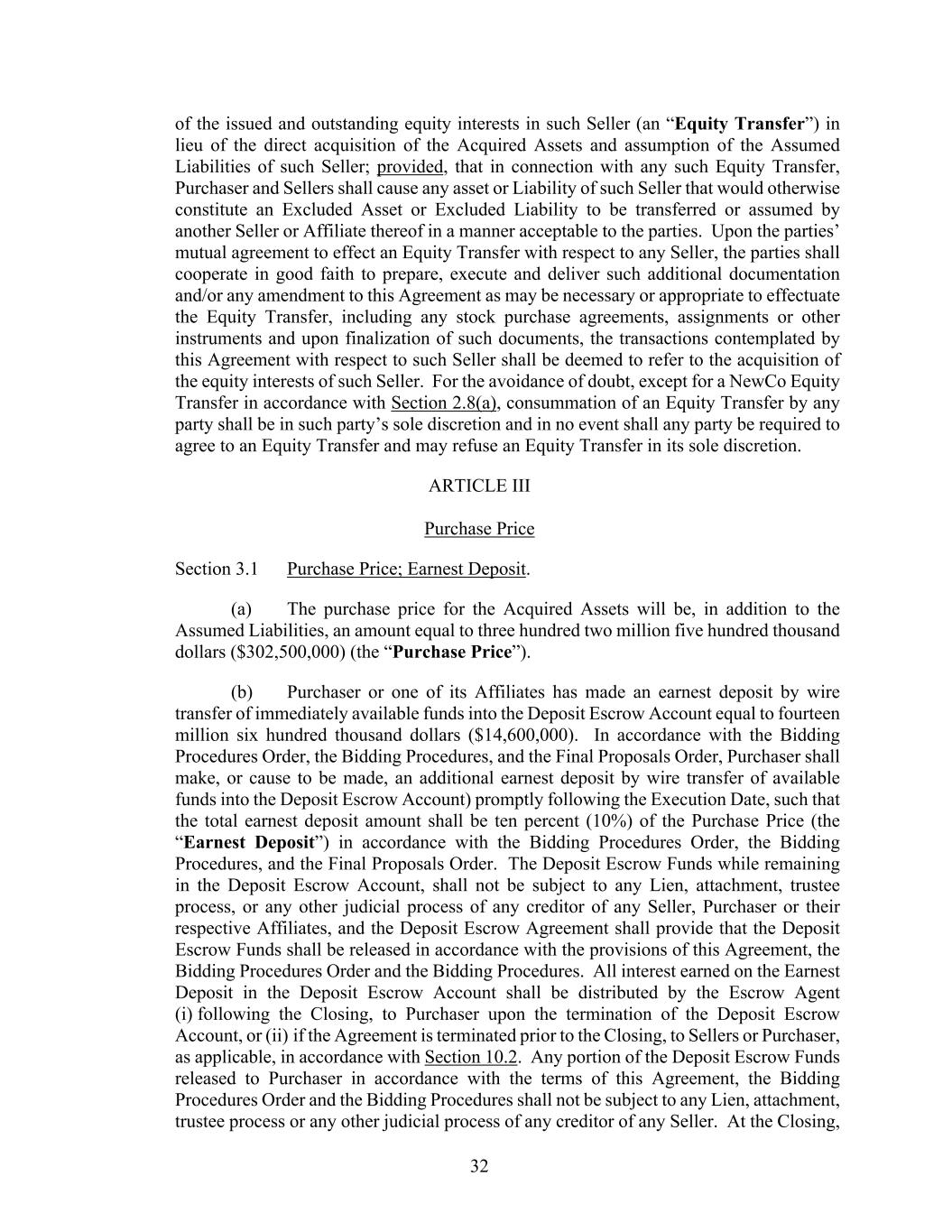 32 of the issued and outstanding equity interests in such Seller (an “Equity Transfer”) in lieu of the direct acquisition of the Acquired Assets and assumption of the Assumed Liabilities of such Seller; provided, that in connection with any such Equity Transfer, Purchaser and Sellers shall cause any asset or Liability of such Seller that would otherwise constitute an Excluded Asset or Excluded Liability to be transferred or assumed by another Seller or Affiliate thereof in a manner acceptable to the parties. Upon the parties’ mutual agreement to effect an Equity Transfer with respect to any Seller, the parties shall cooperate in good faith to prepare, execute and deliver such additional documentation and/or any amendment to this Agreement as may be necessary or appropriate to effectuate the Equity Transfer, including any stock purchase agreements, assignments or other instruments and upon finalization of such documents, the transactions contemplated by this Agreement with respect to such Seller shall be deemed to refer to the acquisition of the equity interests of such Seller. For the avoidance of doubt, except for a NewCo Equity Transfer in accordance with Section 2.8(a), consummation of an Equity Transfer by any party shall be in such party’s sole discretion and in no event shall any party be required to agree to an Equity Transfer and may refuse an Equity Transfer in its sole discretion. ARTICLE III Purchase Price Section 3.1 Purchase Price; Earnest Deposit. (a) The purchase price for the Acquired Assets will be, in addition to the Assumed Liabilities, an amount equal to three hundred two million five hundred thousand dollars ($302,500,000) (the “Purchase Price”). (b) Purchaser or one of its Affiliates has made an earnest deposit by wire transfer of immediately available funds into the Deposit Escrow Account equal to fourteen million six hundred thousand dollars ($14,600,000). In accordance with the Bidding Procedures Order, the Bidding Procedures, and the Final Proposals Order, Purchaser shall make, or cause to be made, an additional earnest deposit by wire transfer of available funds into the Deposit Escrow Account) promptly following the Execution Date, such that the total earnest deposit amount shall be ten percent (10%) of the Purchase Price (the “Earnest Deposit”) in accordance with the Bidding Procedures Order, the Bidding Procedures, and the Final Proposals Order. The Deposit Escrow Funds while remaining in the Deposit Escrow Account, shall not be subject to any Lien, attachment, trustee process, or any other judicial process of any creditor of any Seller, Purchaser or their respective Affiliates, and the Deposit Escrow Agreement shall provide that the Deposit Escrow Funds shall be released in accordance with the provisions of this Agreement, the Bidding Procedures Order and the Bidding Procedures. All interest earned on the Earnest Deposit in the Deposit Escrow Account shall be distributed by the Escrow Agent (i) following the Closing, to Purchaser upon the termination of the Deposit Escrow Account, or (ii) if the Agreement is terminated prior to the Closing, to Sellers or Purchaser, as applicable, in accordance with Section 10.2. Any portion of the Deposit Escrow Funds released to Purchaser in accordance with the terms of this Agreement, the Bidding Procedures Order and the Bidding Procedures shall not be subject to any Lien, attachment, trustee process or any other judicial process of any creditor of any Seller. At the Closing,
