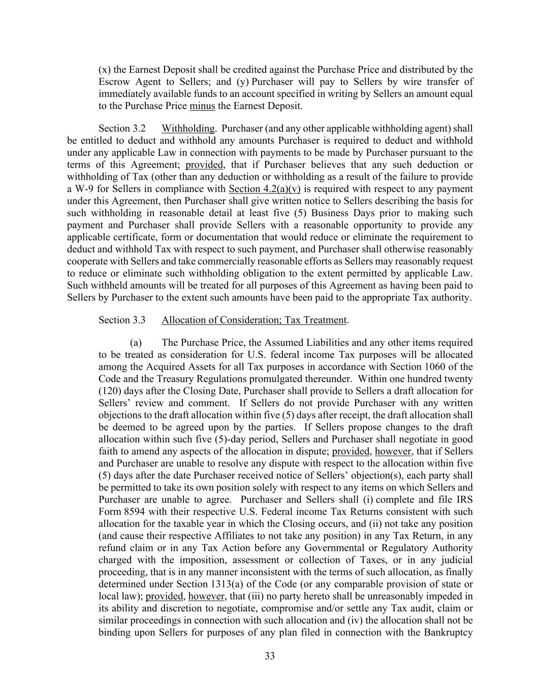 33 (x) the Earnest Deposit shall be credited against the Purchase Price and distributed by the Escrow Agent to Sellers; and (y) Purchaser will pay to Sellers by wire transfer of immediately available funds to an account specified in writing by Sellers an amount equal to the Purchase Price minus the Earnest Deposit. Section 3.2 Withholding. Purchaser (and any other applicable withholding agent) shall be entitled to deduct and withhold any amounts Purchaser is required to deduct and withhold under any applicable Law in connection with payments to be made by Purchaser pursuant to the terms of this Agreement; provided, that if Purchaser believes that any such deduction or withholding of Tax (other than any deduction or withholding as a result of the failure to provide a W-9 for Sellers in compliance with Section 4.2(a)(v) is required with respect to any payment under this Agreement, then Purchaser shall give written notice to Sellers describing the basis for such withholding in reasonable detail at least five (5) Business Days prior to making such payment and Purchaser shall provide Sellers with a reasonable opportunity to provide any applicable certificate, form or documentation that would reduce or eliminate the requirement to deduct and withhold Tax with respect to such payment, and Purchaser shall otherwise reasonably cooperate with Sellers and take commercially reasonable efforts as Sellers may reasonably request to reduce or eliminate such withholding obligation to the extent permitted by applicable Law. Such withheld amounts will be treated for all purposes of this Agreement as having been paid to Sellers by Purchaser to the extent such amounts have been paid to the appropriate Tax authority. Section 3.3 Allocation of Consideration; Tax Treatment. (a) The Purchase Price, the Assumed Liabilities and any other items required to be treated as consideration for U.S. federal income Tax purposes will be allocated among the Acquired Assets for all Tax purposes in accordance with Section 1060 of the Code and the Treasury Regulations promulgated thereunder. Within one hundred twenty (120) days after the Closing Date, Purchaser shall provide to Sellers a draft allocation for Sellers’ review and comment. If Sellers do not provide Purchaser with any written objections to the draft allocation within five (5) days after receipt, the draft allocation shall be deemed to be agreed upon by the parties. If Sellers propose changes to the draft allocation within such five (5)-day period, Sellers and Purchaser shall negotiate in good faith to amend any aspects of the allocation in dispute; provided, however, that if Sellers and Purchaser are unable to resolve any dispute with respect to the allocation within five (5) days after the date Purchaser received notice of Sellers’ objection(s), each party shall be permitted to take its own position solely with respect to any items on which Sellers and Purchaser are unable to agree. Purchaser and Sellers shall (i) complete and file IRS Form 8594 with their respective U.S. Federal income Tax Returns consistent with such allocation for the taxable year in which the Closing occurs, and (ii) not take any position (and cause their respective Affiliates to not take any position) in any Tax Return, in any refund claim or in any Tax Action before any Governmental or Regulatory Authority charged with the imposition, assessment or collection of Taxes, or in any judicial proceeding, that is in any manner inconsistent with the terms of such allocation, as finally determined under Section 1313(a) of the Code (or any comparable provision of state or local law); provided, however, that (iii) no party hereto shall be unreasonably impeded in its ability and discretion to negotiate, compromise and/or settle any Tax audit, claim or similar proceedings in connection with such allocation and (iv) the allocation shall not be binding upon Sellers for purposes of any plan filed in connection with the Bankruptcy