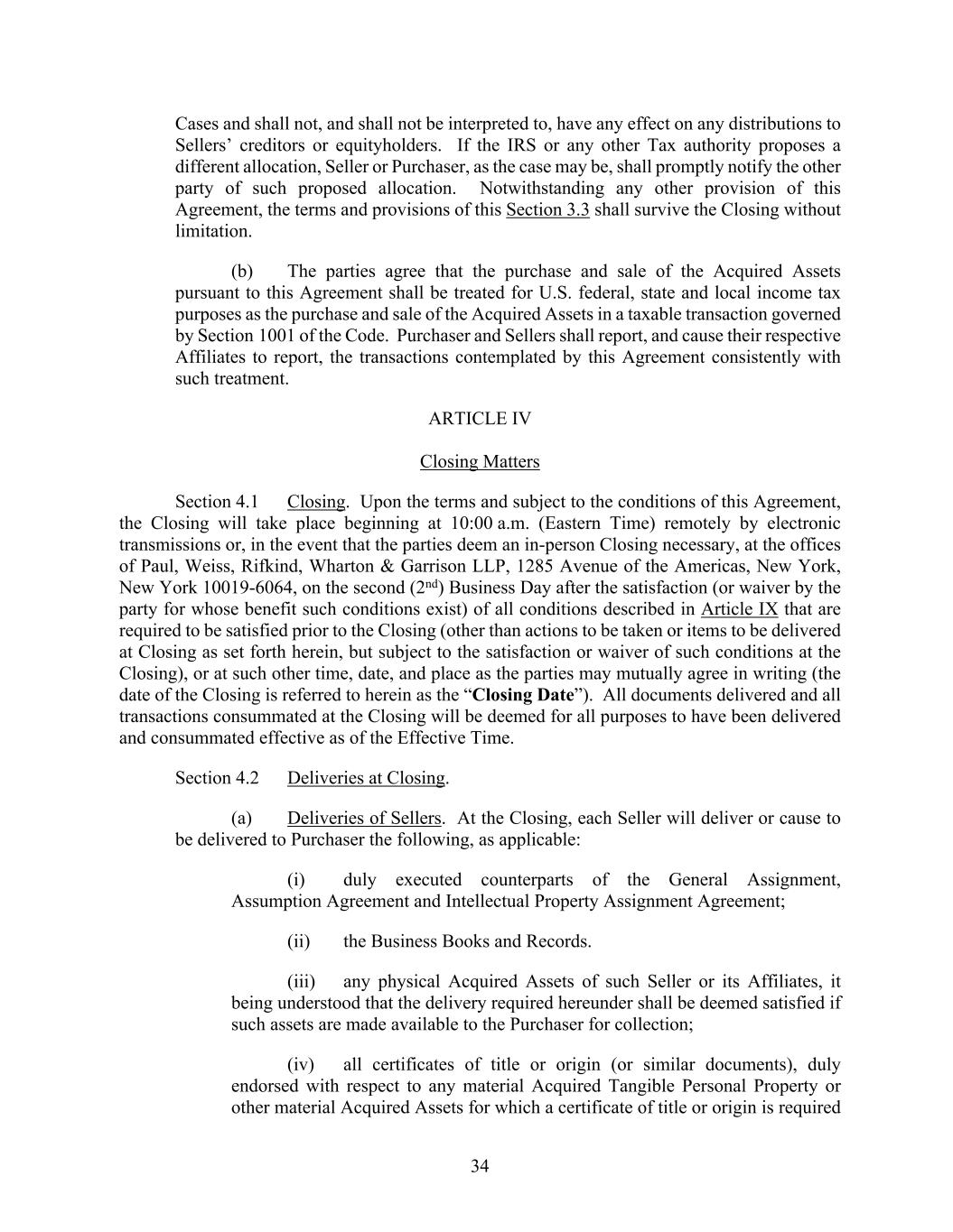 34 Cases and shall not, and shall not be interpreted to, have any effect on any distributions to Sellers’ creditors or equityholders. If the IRS or any other Tax authority proposes a different allocation, Seller or Purchaser, as the case may be, shall promptly notify the other party of such proposed allocation. Notwithstanding any other provision of this Agreement, the terms and provisions of this Section 3.3 shall survive the Closing without limitation. (b) The parties agree that the purchase and sale of the Acquired Assets pursuant to this Agreement shall be treated for U.S. federal, state and local income tax purposes as the purchase and sale of the Acquired Assets in a taxable transaction governed by Section 1001 of the Code. Purchaser and Sellers shall report, and cause their respective Affiliates to report, the transactions contemplated by this Agreement consistently with such treatment. ARTICLE IV Closing Matters Section 4.1 Closing. Upon the terms and subject to the conditions of this Agreement, the Closing will take place beginning at 10:00 a.m. (Eastern Time) remotely by electronic transmissions or, in the event that the parties deem an in-person Closing necessary, at the offices of Paul, Weiss, Rifkind, Wharton & Garrison LLP, 1285 Avenue of the Americas, New York, New York 10019-6064, on the second (2nd) Business Day after the satisfaction (or waiver by the party for whose benefit such conditions exist) of all conditions described in Article IX that are required to be satisfied prior to the Closing (other than actions to be taken or items to be delivered at Closing as set forth herein, but subject to the satisfaction or waiver of such conditions at the Closing), or at such other time, date, and place as the parties may mutually agree in writing (the date of the Closing is referred to herein as the “Closing Date”). All documents delivered and all transactions consummated at the Closing will be deemed for all purposes to have been delivered and consummated effective as of the Effective Time. Section 4.2 Deliveries at Closing. (a) Deliveries of Sellers. At the Closing, each Seller will deliver or cause to be delivered to Purchaser the following, as applicable: (i) duly executed counterparts of the General Assignment, Assumption Agreement and Intellectual Property Assignment Agreement; (ii) the Business Books and Records. (iii) any physical Acquired Assets of such Seller or its Affiliates, it being understood that the delivery required hereunder shall be deemed satisfied if such assets are made available to the Purchaser for collection; (iv) all certificates of title or origin (or similar documents), duly endorsed with respect to any material Acquired Tangible Personal Property or other material Acquired Assets for which a certificate of title or origin is required
