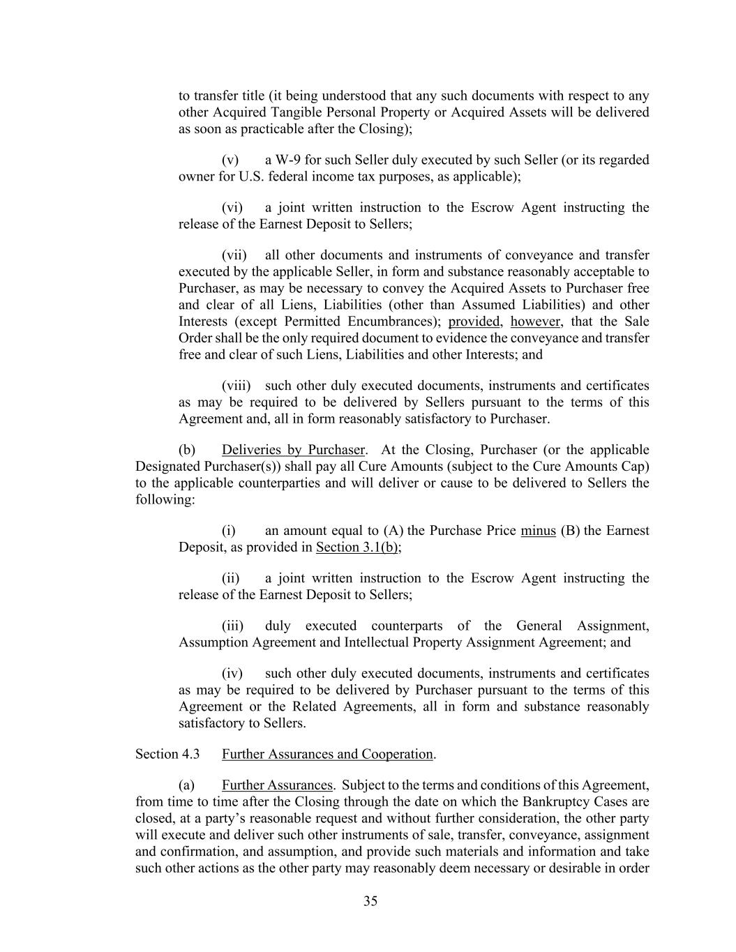 35 to transfer title (it being understood that any such documents with respect to any other Acquired Tangible Personal Property or Acquired Assets will be delivered as soon as practicable after the Closing); (v) a W-9 for such Seller duly executed by such Seller (or its regarded owner for U.S. federal income tax purposes, as applicable); (vi) a joint written instruction to the Escrow Agent instructing the release of the Earnest Deposit to Sellers; (vii) all other documents and instruments of conveyance and transfer executed by the applicable Seller, in form and substance reasonably acceptable to Purchaser, as may be necessary to convey the Acquired Assets to Purchaser free and clear of all Liens, Liabilities (other than Assumed Liabilities) and other Interests (except Permitted Encumbrances); provided, however, that the Sale Order shall be the only required document to evidence the conveyance and transfer free and clear of such Liens, Liabilities and other Interests; and (viii) such other duly executed documents, instruments and certificates as may be required to be delivered by Sellers pursuant to the terms of this Agreement and, all in form reasonably satisfactory to Purchaser. (b) Deliveries by Purchaser. At the Closing, Purchaser (or the applicable Designated Purchaser(s)) shall pay all Cure Amounts (subject to the Cure Amounts Cap) to the applicable counterparties and will deliver or cause to be delivered to Sellers the following: (i) an amount equal to (A) the Purchase Price minus (B) the Earnest Deposit, as provided in Section 3.1(b); (ii) a joint written instruction to the Escrow Agent instructing the release of the Earnest Deposit to Sellers; (iii) duly executed counterparts of the General Assignment, Assumption Agreement and Intellectual Property Assignment Agreement; and (iv) such other duly executed documents, instruments and certificates as may be required to be delivered by Purchaser pursuant to the terms of this Agreement or the Related Agreements, all in form and substance reasonably satisfactory to Sellers. Section 4.3 Further Assurances and Cooperation. (a) Further Assurances. Subject to the terms and conditions of this Agreement, from time to time after the Closing through the date on which the Bankruptcy Cases are closed, at a party’s reasonable request and without further consideration, the other party will execute and deliver such other instruments of sale, transfer, conveyance, assignment and confirmation, and assumption, and provide such materials and information and take such other actions as the other party may reasonably deem necessary or desirable in order