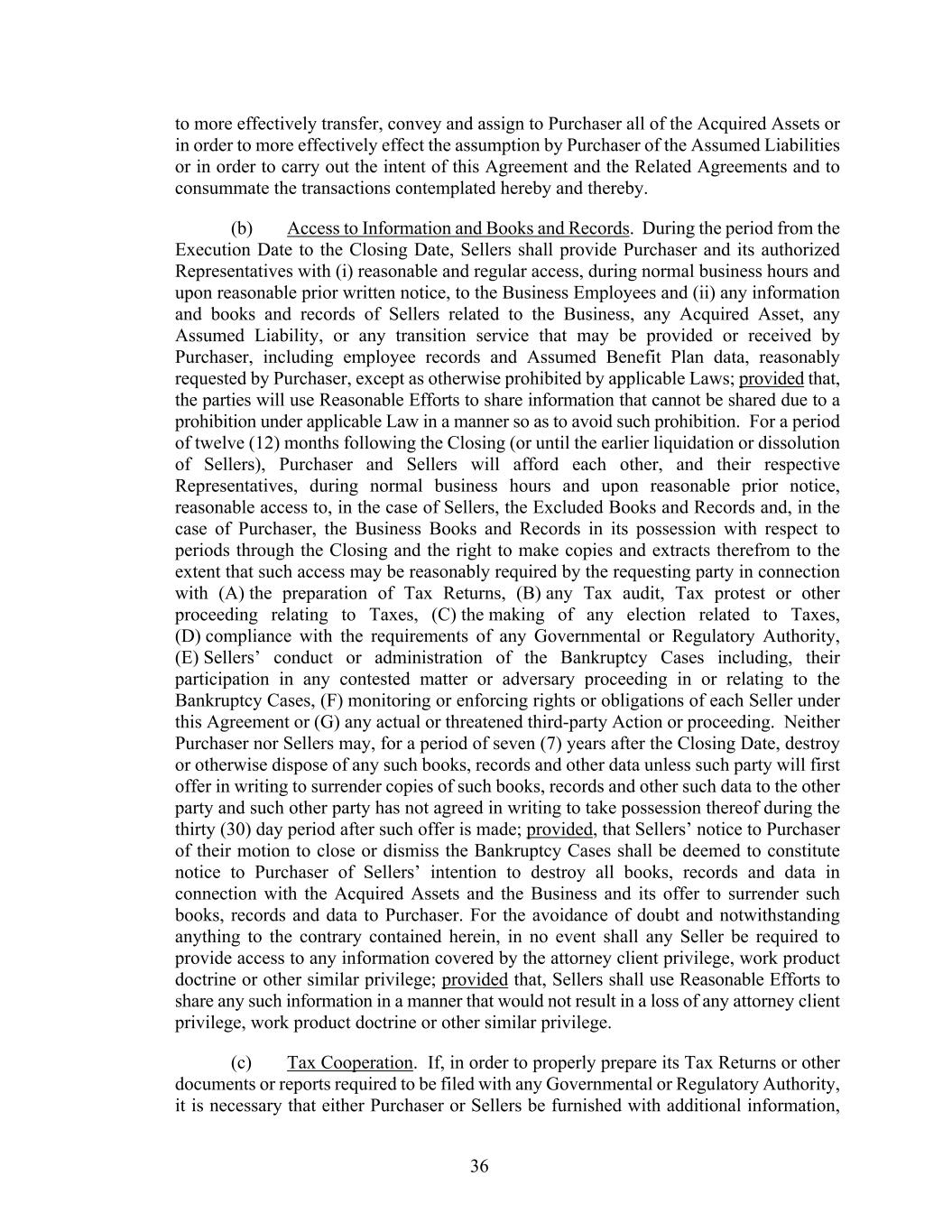 36 to more effectively transfer, convey and assign to Purchaser all of the Acquired Assets or in order to more effectively effect the assumption by Purchaser of the Assumed Liabilities or in order to carry out the intent of this Agreement and the Related Agreements and to consummate the transactions contemplated hereby and thereby. (b) Access to Information and Books and Records. During the period from the Execution Date to the Closing Date, Sellers shall provide Purchaser and its authorized Representatives with (i) reasonable and regular access, during normal business hours and upon reasonable prior written notice, to the Business Employees and (ii) any information and books and records of Sellers related to the Business, any Acquired Asset, any Assumed Liability, or any transition service that may be provided or received by Purchaser, including employee records and Assumed Benefit Plan data, reasonably requested by Purchaser, except as otherwise prohibited by applicable Laws; provided that, the parties will use Reasonable Efforts to share information that cannot be shared due to a prohibition under applicable Law in a manner so as to avoid such prohibition. For a period of twelve (12) months following the Closing (or until the earlier liquidation or dissolution of Sellers), Purchaser and Sellers will afford each other, and their respective Representatives, during normal business hours and upon reasonable prior notice, reasonable access to, in the case of Sellers, the Excluded Books and Records and, in the case of Purchaser, the Business Books and Records in its possession with respect to periods through the Closing and the right to make copies and extracts therefrom to the extent that such access may be reasonably required by the requesting party in connection with (A) the preparation of Tax Returns, (B) any Tax audit, Tax protest or other proceeding relating to Taxes, (C) the making of any election related to Taxes, (D) compliance with the requirements of any Governmental or Regulatory Authority, (E) Sellers’ conduct or administration of the Bankruptcy Cases including, their participation in any contested matter or adversary proceeding in or relating to the Bankruptcy Cases, (F) monitoring or enforcing rights or obligations of each Seller under this Agreement or (G) any actual or threatened third-party Action or proceeding. Neither Purchaser nor Sellers may, for a period of seven (7) years after the Closing Date, destroy or otherwise dispose of any such books, records and other data unless such party will first offer in writing to surrender copies of such books, records and other such data to the other party and such other party has not agreed in writing to take possession thereof during the thirty (30) day period after such offer is made; provided, that Sellers’ notice to Purchaser of their motion to close or dismiss the Bankruptcy Cases shall be deemed to constitute notice to Purchaser of Sellers’ intention to destroy all books, records and data in connection with the Acquired Assets and the Business and its offer to surrender such books, records and data to Purchaser. For the avoidance of doubt and notwithstanding anything to the contrary contained herein, in no event shall any Seller be required to provide access to any information covered by the attorney client privilege, work product doctrine or other similar privilege; provided that, Sellers shall use Reasonable Efforts to share any such information in a manner that would not result in a loss of any attorney client privilege, work product doctrine or other similar privilege. (c) Tax Cooperation. If, in order to properly prepare its Tax Returns or other documents or reports required to be filed with any Governmental or Regulatory Authority, it is necessary that either Purchaser or Sellers be furnished with additional information,