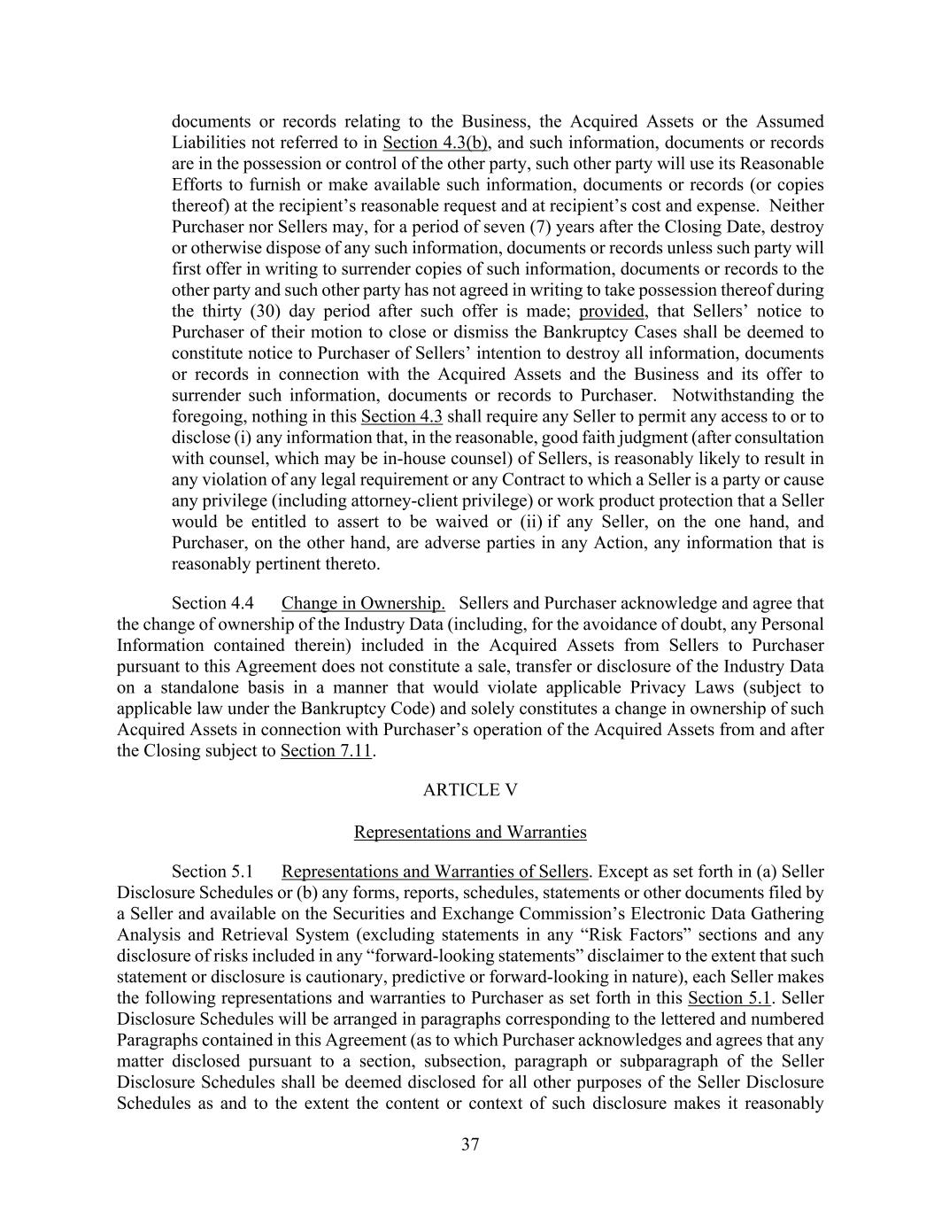 37 documents or records relating to the Business, the Acquired Assets or the Assumed Liabilities not referred to in Section 4.3(b), and such information, documents or records are in the possession or control of the other party, such other party will use its Reasonable Efforts to furnish or make available such information, documents or records (or copies thereof) at the recipient’s reasonable request and at recipient’s cost and expense. Neither Purchaser nor Sellers may, for a period of seven (7) years after the Closing Date, destroy or otherwise dispose of any such information, documents or records unless such party will first offer in writing to surrender copies of such information, documents or records to the other party and such other party has not agreed in writing to take possession thereof during the thirty (30) day period after such offer is made; provided, that Sellers’ notice to Purchaser of their motion to close or dismiss the Bankruptcy Cases shall be deemed to constitute notice to Purchaser of Sellers’ intention to destroy all information, documents or records in connection with the Acquired Assets and the Business and its offer to surrender such information, documents or records to Purchaser. Notwithstanding the foregoing, nothing in this Section 4.3 shall require any Seller to permit any access to or to disclose (i) any information that, in the reasonable, good faith judgment (after consultation with counsel, which may be in-house counsel) of Sellers, is reasonably likely to result in any violation of any legal requirement or any Contract to which a Seller is a party or cause any privilege (including attorney-client privilege) or work product protection that a Seller would be entitled to assert to be waived or (ii) if any Seller, on the one hand, and Purchaser, on the other hand, are adverse parties in any Action, any information that is reasonably pertinent thereto. Section 4.4 Change in Ownership. Sellers and Purchaser acknowledge and agree that the change of ownership of the Industry Data (including, for the avoidance of doubt, any Personal Information contained therein) included in the Acquired Assets from Sellers to Purchaser pursuant to this Agreement does not constitute a sale, transfer or disclosure of the Industry Data on a standalone basis in a manner that would violate applicable Privacy Laws (subject to applicable law under the Bankruptcy Code) and solely constitutes a change in ownership of such Acquired Assets in connection with Purchaser’s operation of the Acquired Assets from and after the Closing subject to Section 7.11. ARTICLE V Representations and Warranties Section 5.1 Representations and Warranties of Sellers. Except as set forth in (a) Seller Disclosure Schedules or (b) any forms, reports, schedules, statements or other documents filed by a Seller and available on the Securities and Exchange Commission’s Electronic Data Gathering Analysis and Retrieval System (excluding statements in any “Risk Factors” sections and any disclosure of risks included in any “forward-looking statements” disclaimer to the extent that such statement or disclosure is cautionary, predictive or forward-looking in nature), each Seller makes the following representations and warranties to Purchaser as set forth in this Section 5.1. Seller Disclosure Schedules will be arranged in paragraphs corresponding to the lettered and numbered Paragraphs contained in this Agreement (as to which Purchaser acknowledges and agrees that any matter disclosed pursuant to a section, subsection, paragraph or subparagraph of the Seller Disclosure Schedules shall be deemed disclosed for all other purposes of the Seller Disclosure Schedules as and to the extent the content or context of such disclosure makes it reasonably