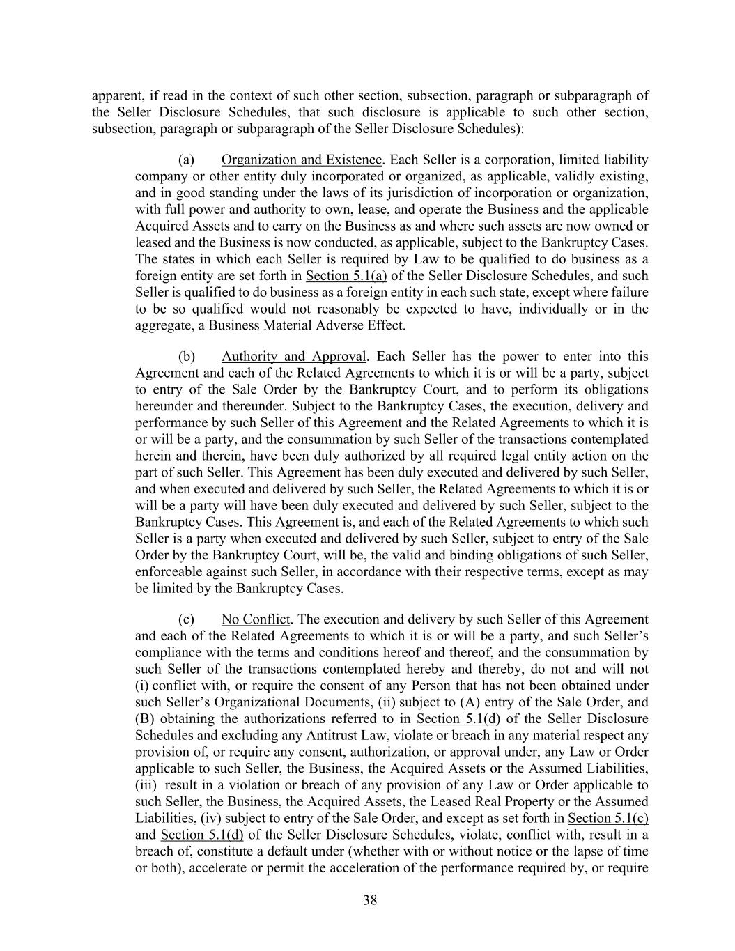 38 apparent, if read in the context of such other section, subsection, paragraph or subparagraph of the Seller Disclosure Schedules, that such disclosure is applicable to such other section, subsection, paragraph or subparagraph of the Seller Disclosure Schedules): (a) Organization and Existence. Each Seller is a corporation, limited liability company or other entity duly incorporated or organized, as applicable, validly existing, and in good standing under the laws of its jurisdiction of incorporation or organization, with full power and authority to own, lease, and operate the Business and the applicable Acquired Assets and to carry on the Business as and where such assets are now owned or leased and the Business is now conducted, as applicable, subject to the Bankruptcy Cases. The states in which each Seller is required by Law to be qualified to do business as a foreign entity are set forth in Section 5.1(a) of the Seller Disclosure Schedules, and such Seller is qualified to do business as a foreign entity in each such state, except where failure to be so qualified would not reasonably be expected to have, individually or in the aggregate, a Business Material Adverse Effect. (b) Authority and Approval. Each Seller has the power to enter into this Agreement and each of the Related Agreements to which it is or will be a party, subject to entry of the Sale Order by the Bankruptcy Court, and to perform its obligations hereunder and thereunder. Subject to the Bankruptcy Cases, the execution, delivery and performance by such Seller of this Agreement and the Related Agreements to which it is or will be a party, and the consummation by such Seller of the transactions contemplated herein and therein, have been duly authorized by all required legal entity action on the part of such Seller. This Agreement has been duly executed and delivered by such Seller, and when executed and delivered by such Seller, the Related Agreements to which it is or will be a party will have been duly executed and delivered by such Seller, subject to the Bankruptcy Cases. This Agreement is, and each of the Related Agreements to which such Seller is a party when executed and delivered by such Seller, subject to entry of the Sale Order by the Bankruptcy Court, will be, the valid and binding obligations of such Seller, enforceable against such Seller, in accordance with their respective terms, except as may be limited by the Bankruptcy Cases. (c) No Conflict. The execution and delivery by such Seller of this Agreement and each of the Related Agreements to which it is or will be a party, and such Seller’s compliance with the terms and conditions hereof and thereof, and the consummation by such Seller of the transactions contemplated hereby and thereby, do not and will not (i) conflict with, or require the consent of any Person that has not been obtained under such Seller’s Organizational Documents, (ii) subject to (A) entry of the Sale Order, and (B) obtaining the authorizations referred to in Section 5.1(d) of the Seller Disclosure Schedules and excluding any Antitrust Law, violate or breach in any material respect any provision of, or require any consent, authorization, or approval under, any Law or Order applicable to such Seller, the Business, the Acquired Assets or the Assumed Liabilities, (iii) result in a violation or breach of any provision of any Law or Order applicable to such Seller, the Business, the Acquired Assets, the Leased Real Property or the Assumed Liabilities, (iv) subject to entry of the Sale Order, and except as set forth in Section 5.1(c) and Section 5.1(d) of the Seller Disclosure Schedules, violate, conflict with, result in a breach of, constitute a default under (whether with or without notice or the lapse of time or both), accelerate or permit the acceleration of the performance required by, or require