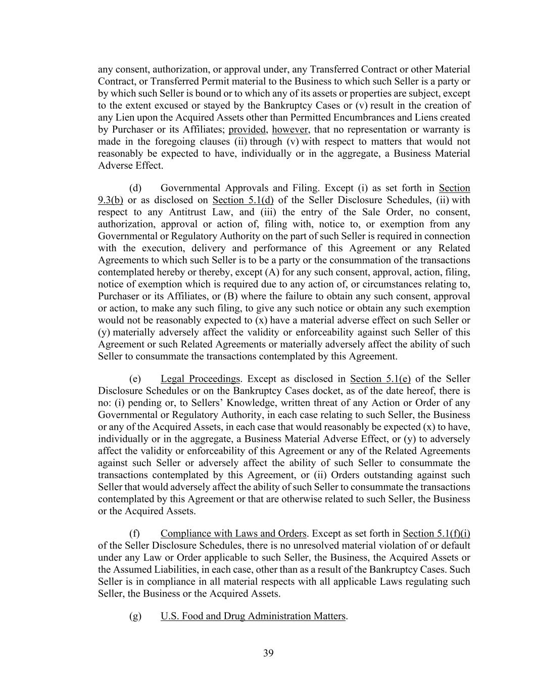 39 any consent, authorization, or approval under, any Transferred Contract or other Material Contract, or Transferred Permit material to the Business to which such Seller is a party or by which such Seller is bound or to which any of its assets or properties are subject, except to the extent excused or stayed by the Bankruptcy Cases or (v) result in the creation of any Lien upon the Acquired Assets other than Permitted Encumbrances and Liens created by Purchaser or its Affiliates; provided, however, that no representation or warranty is made in the foregoing clauses (ii) through (v) with respect to matters that would not reasonably be expected to have, individually or in the aggregate, a Business Material Adverse Effect. (d) Governmental Approvals and Filing. Except (i) as set forth in Section 9.3(b) or as disclosed on Section 5.1(d) of the Seller Disclosure Schedules, (ii) with respect to any Antitrust Law, and (iii) the entry of the Sale Order, no consent, authorization, approval or action of, filing with, notice to, or exemption from any Governmental or Regulatory Authority on the part of such Seller is required in connection with the execution, delivery and performance of this Agreement or any Related Agreements to which such Seller is to be a party or the consummation of the transactions contemplated hereby or thereby, except (A) for any such consent, approval, action, filing, notice of exemption which is required due to any action of, or circumstances relating to, Purchaser or its Affiliates, or (B) where the failure to obtain any such consent, approval or action, to make any such filing, to give any such notice or obtain any such exemption would not be reasonably expected to (x) have a material adverse effect on such Seller or (y) materially adversely affect the validity or enforceability against such Seller of this Agreement or such Related Agreements or materially adversely affect the ability of such Seller to consummate the transactions contemplated by this Agreement. (e) Legal Proceedings. Except as disclosed in Section 5.1(e) of the Seller Disclosure Schedules or on the Bankruptcy Cases docket, as of the date hereof, there is no: (i) pending or, to Sellers’ Knowledge, written threat of any Action or Order of any Governmental or Regulatory Authority, in each case relating to such Seller, the Business or any of the Acquired Assets, in each case that would reasonably be expected (x) to have, individually or in the aggregate, a Business Material Adverse Effect, or (y) to adversely affect the validity or enforceability of this Agreement or any of the Related Agreements against such Seller or adversely affect the ability of such Seller to consummate the transactions contemplated by this Agreement, or (ii) Orders outstanding against such Seller that would adversely affect the ability of such Seller to consummate the transactions contemplated by this Agreement or that are otherwise related to such Seller, the Business or the Acquired Assets. (f) Compliance with Laws and Orders. Except as set forth in Section 5.1(f)(i) of the Seller Disclosure Schedules, there is no unresolved material violation of or default under any Law or Order applicable to such Seller, the Business, the Acquired Assets or the Assumed Liabilities, in each case, other than as a result of the Bankruptcy Cases. Such Seller is in compliance in all material respects with all applicable Laws regulating such Seller, the Business or the Acquired Assets. (g) U.S. Food and Drug Administration Matters.