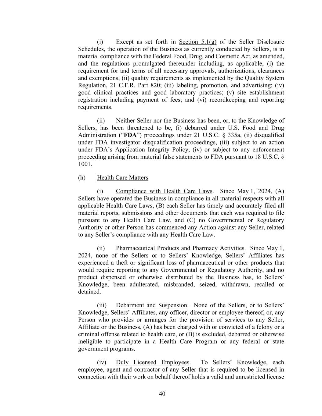 40 (i) Except as set forth in Section 5.1(g) of the Seller Disclosure Schedules, the operation of the Business as currently conducted by Sellers, is in material compliance with the Federal Food, Drug, and Cosmetic Act, as amended, and the regulations promulgated thereunder including, as applicable, (i) the requirement for and terms of all necessary approvals, authorizations, clearances and exemptions; (ii) quality requirements as implemented by the Quality System Regulation, 21 C.F.R. Part 820; (iii) labeling, promotion, and advertising; (iv) good clinical practices and good laboratory practices; (v) site establishment registration including payment of fees; and (vi) recordkeeping and reporting requirements. (ii) Neither Seller nor the Business has been, or, to the Knowledge of Sellers, has been threatened to be, (i) debarred under U.S. Food and Drug Administration (“FDA”) proceedings under 21 U.S.C. § 335a, (ii) disqualified under FDA investigator disqualification proceedings, (iii) subject to an action under FDA’s Application Integrity Policy, (iv) or subject to any enforcement proceeding arising from material false statements to FDA pursuant to 18 U.S.C. § 1001. (h) Health Care Matters (i) Compliance with Health Care Laws. Since May 1, 2024, (A) Sellers have operated the Business in compliance in all material respects with all applicable Health Care Laws, (B) each Seller has timely and accurately filed all material reports, submissions and other documents that each was required to file pursuant to any Health Care Law, and (C) no Governmental or Regulatory Authority or other Person has commenced any Action against any Seller, related to any Seller’s compliance with any Health Care Law. (ii) Pharmaceutical Products and Pharmacy Activities. Since May 1, 2024, none of the Sellers or to Sellers’ Knowledge, Sellers’ Affiliates has experienced a theft or significant loss of pharmaceutical or other products that would require reporting to any Governmental or Regulatory Authority, and no product dispensed or otherwise distributed by the Business has, to Sellers’ Knowledge, been adulterated, misbranded, seized, withdrawn, recalled or detained. (iii) Debarment and Suspension. None of the Sellers, or to Sellers’ Knowledge, Sellers’ Affiliates, any officer, director or employee thereof, or, any Person who provides or arranges for the provision of services to any Seller, Affiliate or the Business, (A) has been charged with or convicted of a felony or a criminal offense related to health care, or (B) is excluded, debarred or otherwise ineligible to participate in a Health Care Program or any federal or state government programs. (iv) Duly Licensed Employees. To Sellers’ Knowledge, each employee, agent and contractor of any Seller that is required to be licensed in connection with their work on behalf thereof holds a valid and unrestricted license