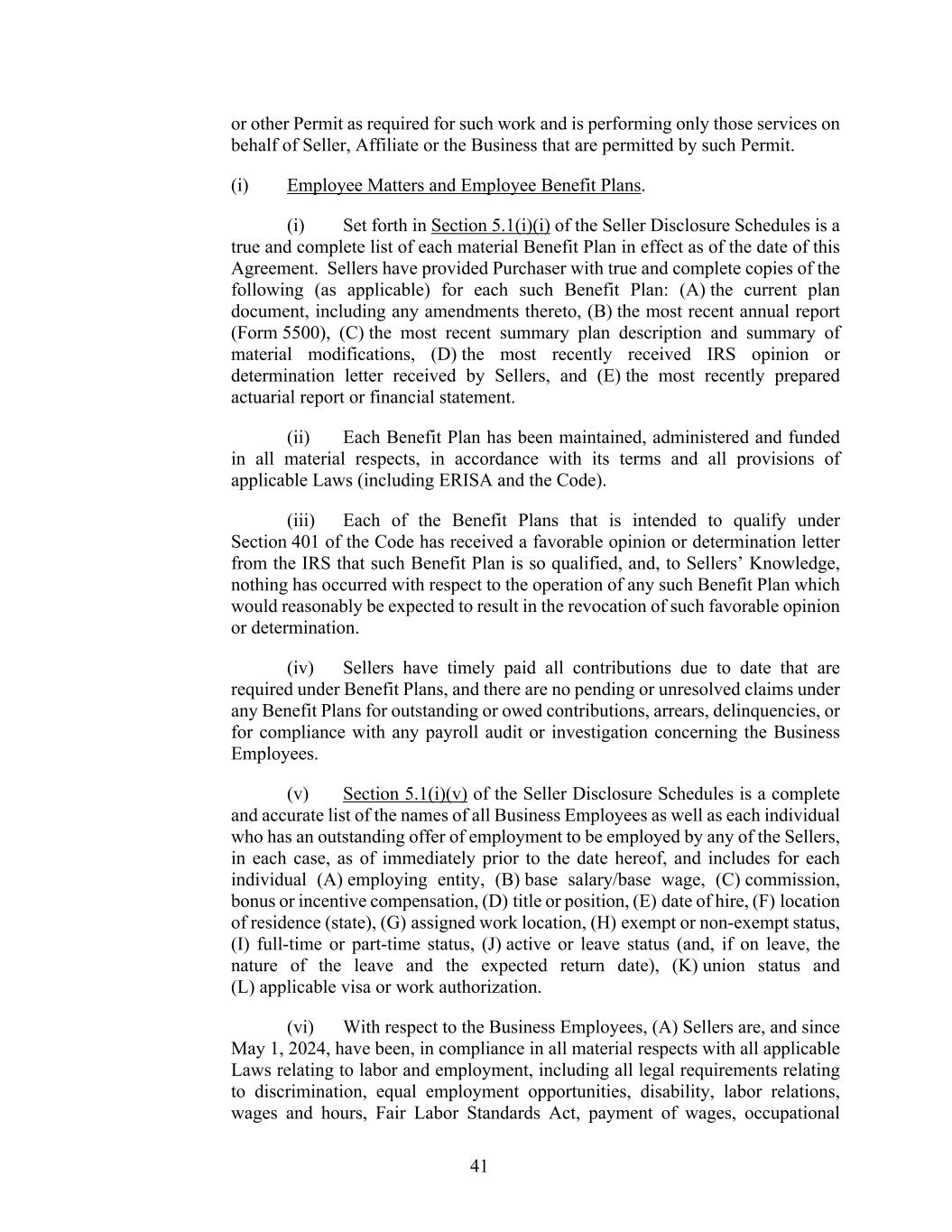 41 or other Permit as required for such work and is performing only those services on behalf of Seller, Affiliate or the Business that are permitted by such Permit. (i) Employee Matters and Employee Benefit Plans. (i) Set forth in Section 5.1(i)(i) of the Seller Disclosure Schedules is a true and complete list of each material Benefit Plan in effect as of the date of this Agreement. Sellers have provided Purchaser with true and complete copies of the following (as applicable) for each such Benefit Plan: (A) the current plan document, including any amendments thereto, (B) the most recent annual report (Form 5500), (C) the most recent summary plan description and summary of material modifications, (D) the most recently received IRS opinion or determination letter received by Sellers, and (E) the most recently prepared actuarial report or financial statement. (ii) Each Benefit Plan has been maintained, administered and funded in all material respects, in accordance with its terms and all provisions of applicable Laws (including ERISA and the Code). (iii) Each of the Benefit Plans that is intended to qualify under Section 401 of the Code has received a favorable opinion or determination letter from the IRS that such Benefit Plan is so qualified, and, to Sellers’ Knowledge, nothing has occurred with respect to the operation of any such Benefit Plan which would reasonably be expected to result in the revocation of such favorable opinion or determination. (iv) Sellers have timely paid all contributions due to date that are required under Benefit Plans, and there are no pending or unresolved claims under any Benefit Plans for outstanding or owed contributions, arrears, delinquencies, or for compliance with any payroll audit or investigation concerning the Business Employees. (v) Section 5.1(i)(v) of the Seller Disclosure Schedules is a complete and accurate list of the names of all Business Employees as well as each individual who has an outstanding offer of employment to be employed by any of the Sellers, in each case, as of immediately prior to the date hereof, and includes for each individual (A) employing entity, (B) base salary/base wage, (C) commission, bonus or incentive compensation, (D) title or position, (E) date of hire, (F) location of residence (state), (G) assigned work location, (H) exempt or non-exempt status, (I) full-time or part-time status, (J) active or leave status (and, if on leave, the nature of the leave and the expected return date), (K) union status and (L) applicable visa or work authorization. (vi) With respect to the Business Employees, (A) Sellers are, and since May 1, 2024, have been, in compliance in all material respects with all applicable Laws relating to labor and employment, including all legal requirements relating to discrimination, equal employment opportunities, disability, labor relations, wages and hours, Fair Labor Standards Act, payment of wages, occupational