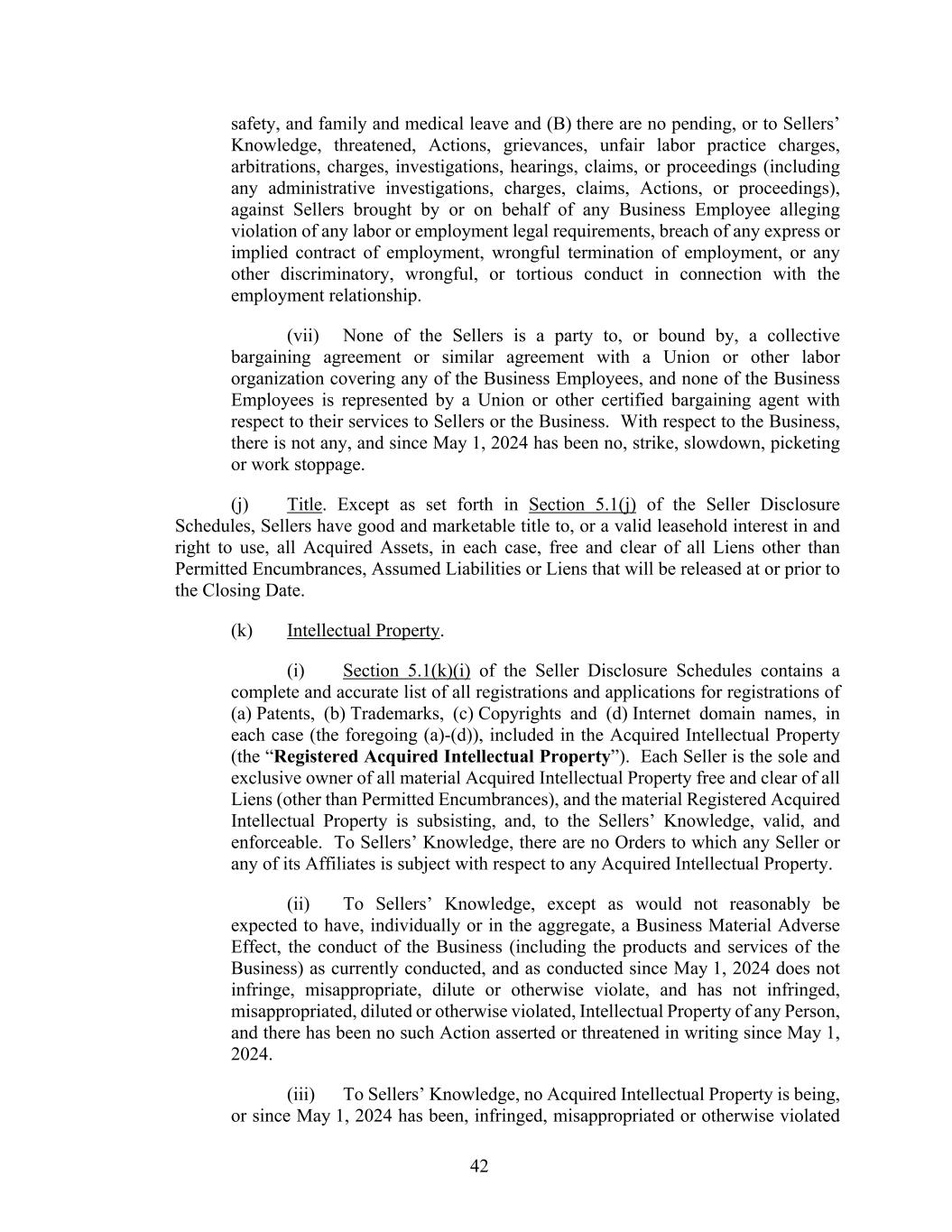 42 safety, and family and medical leave and (B) there are no pending, or to Sellers’ Knowledge, threatened, Actions, grievances, unfair labor practice charges, arbitrations, charges, investigations, hearings, claims, or proceedings (including any administrative investigations, charges, claims, Actions, or proceedings), against Sellers brought by or on behalf of any Business Employee alleging violation of any labor or employment legal requirements, breach of any express or implied contract of employment, wrongful termination of employment, or any other discriminatory, wrongful, or tortious conduct in connection with the employment relationship. (vii) None of the Sellers is a party to, or bound by, a collective bargaining agreement or similar agreement with a Union or other labor organization covering any of the Business Employees, and none of the Business Employees is represented by a Union or other certified bargaining agent with respect to their services to Sellers or the Business. With respect to the Business, there is not any, and since May 1, 2024 has been no, strike, slowdown, picketing or work stoppage. (j) Title. Except as set forth in Section 5.1(j) of the Seller Disclosure Schedules, Sellers have good and marketable title to, or a valid leasehold interest in and right to use, all Acquired Assets, in each case, free and clear of all Liens other than Permitted Encumbrances, Assumed Liabilities or Liens that will be released at or prior to the Closing Date. (k) Intellectual Property. (i) Section 5.1(k)(i) of the Seller Disclosure Schedules contains a complete and accurate list of all registrations and applications for registrations of (a) Patents, (b) Trademarks, (c) Copyrights and (d) Internet domain names, in each case (the foregoing (a)-(d)), included in the Acquired Intellectual Property (the “Registered Acquired Intellectual Property”). Each Seller is the sole and exclusive owner of all material Acquired Intellectual Property free and clear of all Liens (other than Permitted Encumbrances), and the material Registered Acquired Intellectual Property is subsisting, and, to the Sellers’ Knowledge, valid, and enforceable. To Sellers’ Knowledge, there are no Orders to which any Seller or any of its Affiliates is subject with respect to any Acquired Intellectual Property. (ii) To Sellers’ Knowledge, except as would not reasonably be expected to have, individually or in the aggregate, a Business Material Adverse Effect, the conduct of the Business (including the products and services of the Business) as currently conducted, and as conducted since May 1, 2024 does not infringe, misappropriate, dilute or otherwise violate, and has not infringed, misappropriated, diluted or otherwise violated, Intellectual Property of any Person, and there has been no such Action asserted or threatened in writing since May 1, 2024. (iii) To Sellers’ Knowledge, no Acquired Intellectual Property is being, or since May 1, 2024 has been, infringed, misappropriated or otherwise violated