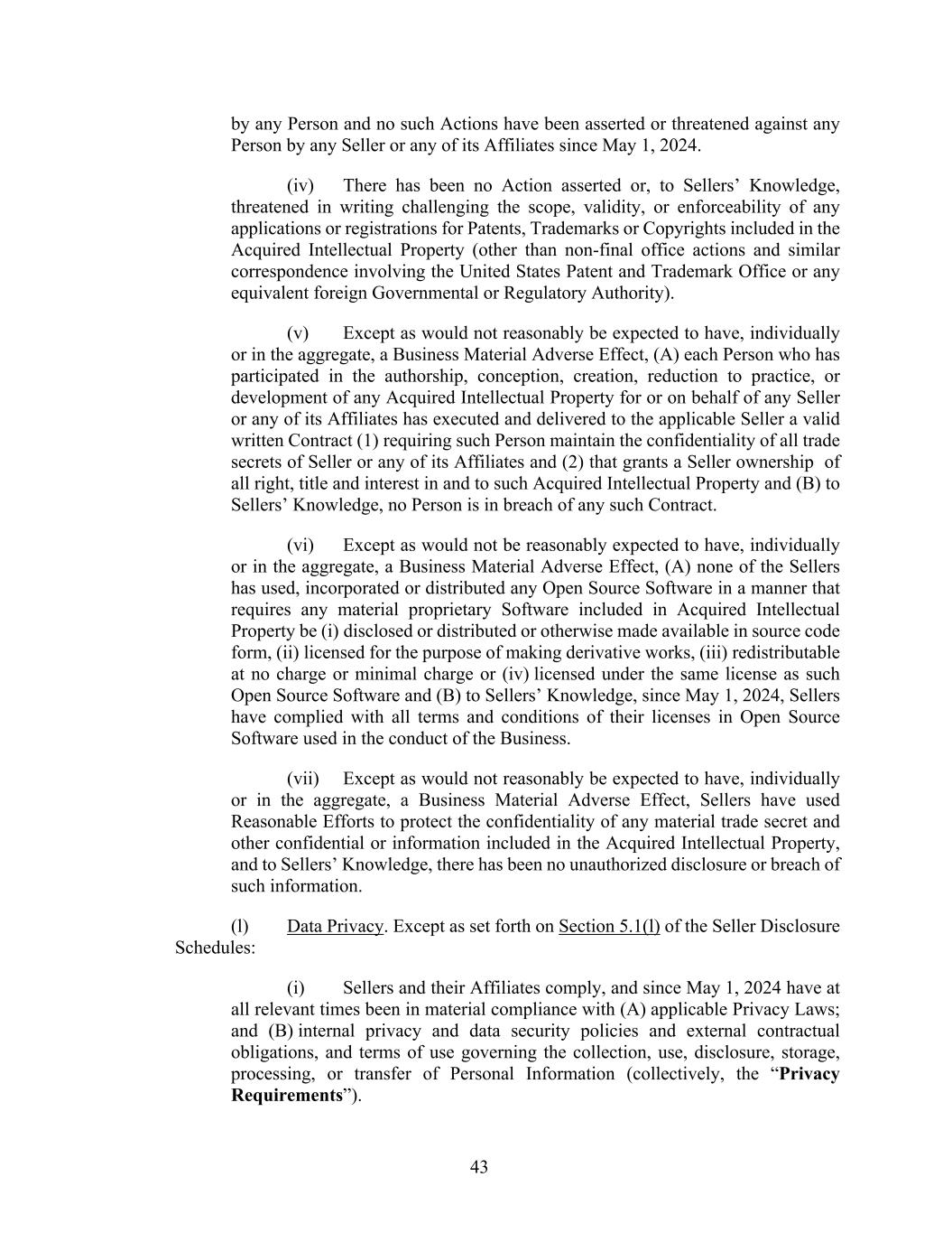 43 by any Person and no such Actions have been asserted or threatened against any Person by any Seller or any of its Affiliates since May 1, 2024. (iv) There has been no Action asserted or, to Sellers’ Knowledge, threatened in writing challenging the scope, validity, or enforceability of any applications or registrations for Patents, Trademarks or Copyrights included in the Acquired Intellectual Property (other than non-final office actions and similar correspondence involving the United States Patent and Trademark Office or any equivalent foreign Governmental or Regulatory Authority). (v) Except as would not reasonably be expected to have, individually or in the aggregate, a Business Material Adverse Effect, (A) each Person who has participated in the authorship, conception, creation, reduction to practice, or development of any Acquired Intellectual Property for or on behalf of any Seller or any of its Affiliates has executed and delivered to the applicable Seller a valid written Contract (1) requiring such Person maintain the confidentiality of all trade secrets of Seller or any of its Affiliates and (2) that grants a Seller ownership of all right, title and interest in and to such Acquired Intellectual Property and (B) to Sellers’ Knowledge, no Person is in breach of any such Contract. (vi) Except as would not be reasonably expected to have, individually or in the aggregate, a Business Material Adverse Effect, (A) none of the Sellers has used, incorporated or distributed any Open Source Software in a manner that requires any material proprietary Software included in Acquired Intellectual Property be (i) disclosed or distributed or otherwise made available in source code form, (ii) licensed for the purpose of making derivative works, (iii) redistributable at no charge or minimal charge or (iv) licensed under the same license as such Open Source Software and (B) to Sellers’ Knowledge, since May 1, 2024, Sellers have complied with all terms and conditions of their licenses in Open Source Software used in the conduct of the Business. (vii) Except as would not reasonably be expected to have, individually or in the aggregate, a Business Material Adverse Effect, Sellers have used Reasonable Efforts to protect the confidentiality of any material trade secret and other confidential or information included in the Acquired Intellectual Property, and to Sellers’ Knowledge, there has been no unauthorized disclosure or breach of such information. (l) Data Privacy. Except as set forth on Section 5.1(l) of the Seller Disclosure Schedules: (i) Sellers and their Affiliates comply, and since May 1, 2024 have at all relevant times been in material compliance with (A) applicable Privacy Laws; and (B) internal privacy and data security policies and external contractual obligations, and terms of use governing the collection, use, disclosure, storage, processing, or transfer of Personal Information (collectively, the “Privacy Requirements”).