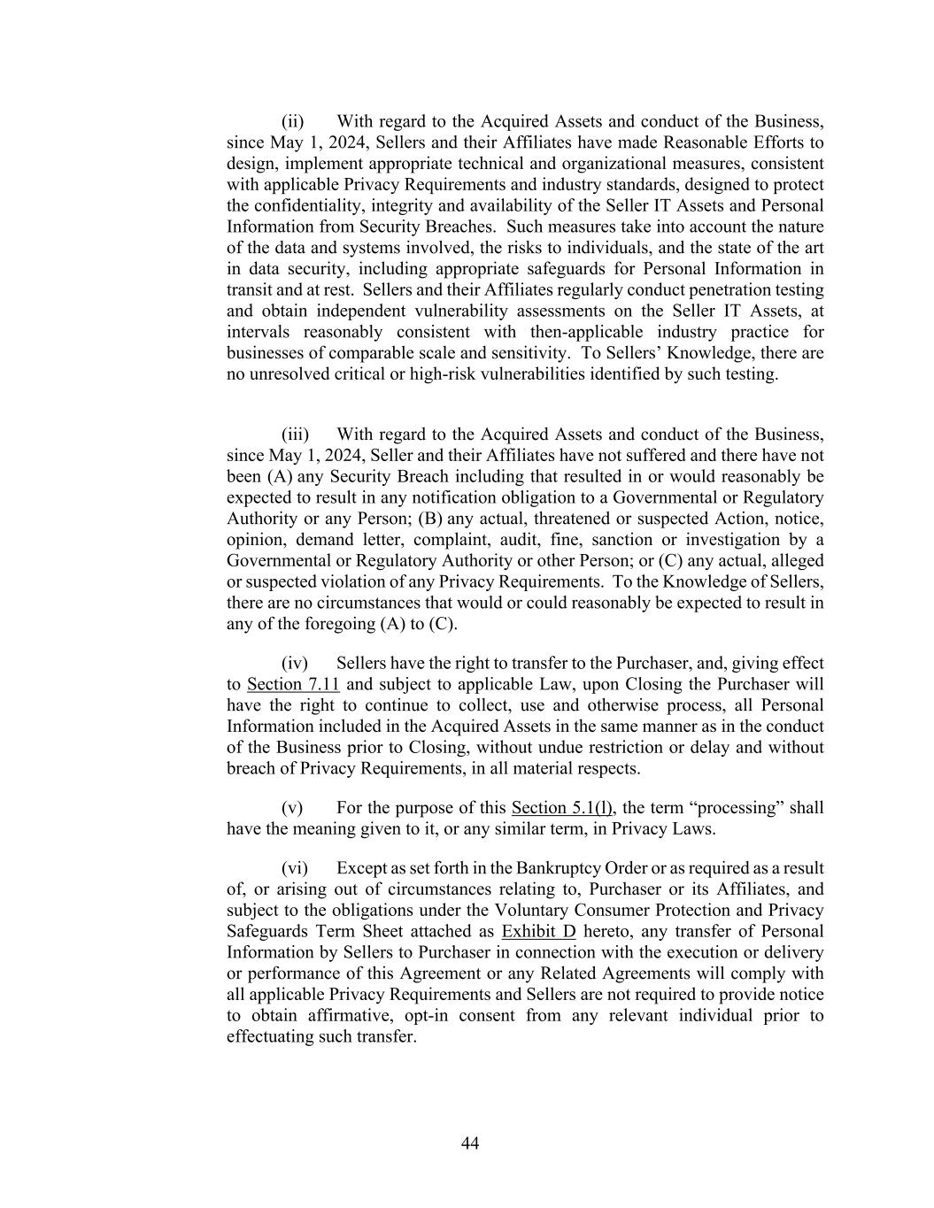 44 (ii) With regard to the Acquired Assets and conduct of the Business, since May 1, 2024, Sellers and their Affiliates have made Reasonable Efforts to design, implement appropriate technical and organizational measures, consistent with applicable Privacy Requirements and industry standards, designed to protect the confidentiality, integrity and availability of the Seller IT Assets and Personal Information from Security Breaches. Such measures take into account the nature of the data and systems involved, the risks to individuals, and the state of the art in data security, including appropriate safeguards for Personal Information in transit and at rest. Sellers and their Affiliates regularly conduct penetration testing and obtain independent vulnerability assessments on the Seller IT Assets, at intervals reasonably consistent with then-applicable industry practice for businesses of comparable scale and sensitivity. To Sellers’ Knowledge, there are no unresolved critical or high-risk vulnerabilities identified by such testing. (iii) With regard to the Acquired Assets and conduct of the Business, since May 1, 2024, Seller and their Affiliates have not suffered and there have not been (A) any Security Breach including that resulted in or would reasonably be expected to result in any notification obligation to a Governmental or Regulatory Authority or any Person; (B) any actual, threatened or suspected Action, notice, opinion, demand letter, complaint, audit, fine, sanction or investigation by a Governmental or Regulatory Authority or other Person; or (C) any actual, alleged or suspected violation of any Privacy Requirements. To the Knowledge of Sellers, there are no circumstances that would or could reasonably be expected to result in any of the foregoing (A) to (C). (iv) Sellers have the right to transfer to the Purchaser, and, giving effect to Section 7.11 and subject to applicable Law, upon Closing the Purchaser will have the right to continue to collect, use and otherwise process, all Personal Information included in the Acquired Assets in the same manner as in the conduct of the Business prior to Closing, without undue restriction or delay and without breach of Privacy Requirements, in all material respects. (v) For the purpose of this Section 5.1(l), the term “processing” shall have the meaning given to it, or any similar term, in Privacy Laws. (vi) Except as set forth in the Bankruptcy Order or as required as a result of, or arising out of circumstances relating to, Purchaser or its Affiliates, and subject to the obligations under the Voluntary Consumer Protection and Privacy Safeguards Term Sheet attached as Exhibit D hereto, any transfer of Personal Information by Sellers to Purchaser in connection with the execution or delivery or performance of this Agreement or any Related Agreements will comply with all applicable Privacy Requirements and Sellers are not required to provide notice to obtain affirmative, opt-in consent from any relevant individual prior to effectuating such transfer.