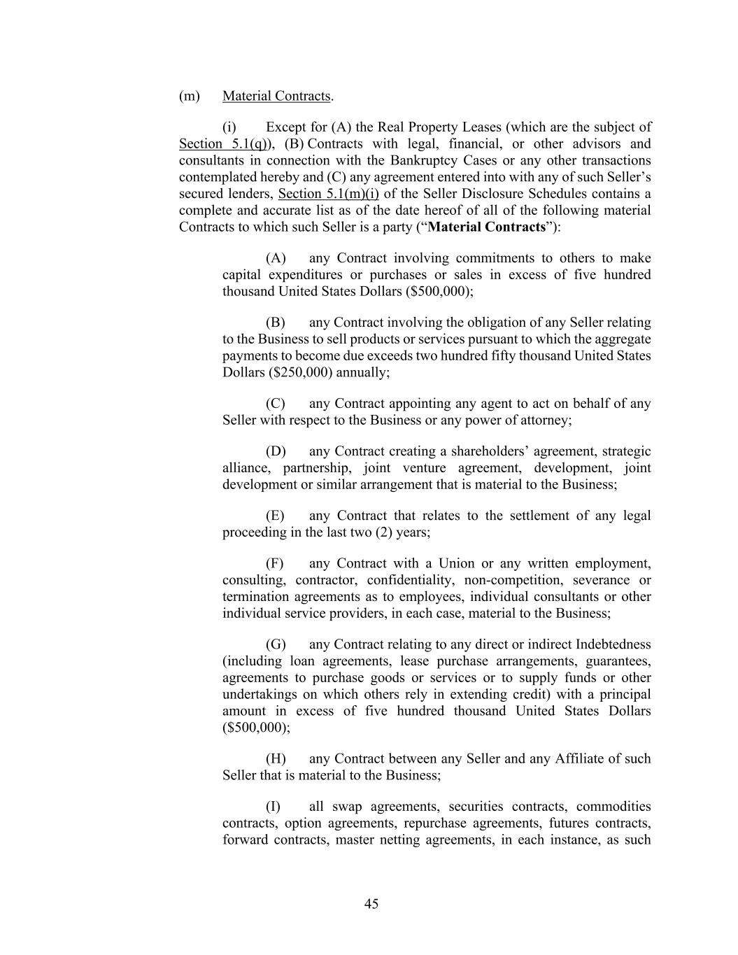 45 (m) Material Contracts. (i) Except for (A) the Real Property Leases (which are the subject of Section 5.1(q)), (B) Contracts with legal, financial, or other advisors and consultants in connection with the Bankruptcy Cases or any other transactions contemplated hereby and (C) any agreement entered into with any of such Seller’s secured lenders, Section 5.1(m)(i) of the Seller Disclosure Schedules contains a complete and accurate list as of the date hereof of all of the following material Contracts to which such Seller is a party (“Material Contracts”): (A) any Contract involving commitments to others to make capital expenditures or purchases or sales in excess of five hundred thousand United States Dollars ($500,000); (B) any Contract involving the obligation of any Seller relating to the Business to sell products or services pursuant to which the aggregate payments to become due exceeds two hundred fifty thousand United States Dollars ($250,000) annually; (C) any Contract appointing any agent to act on behalf of any Seller with respect to the Business or any power of attorney; (D) any Contract creating a shareholders’ agreement, strategic alliance, partnership, joint venture agreement, development, joint development or similar arrangement that is material to the Business; (E) any Contract that relates to the settlement of any legal proceeding in the last two (2) years; (F) any Contract with a Union or any written employment, consulting, contractor, confidentiality, non-competition, severance or termination agreements as to employees, individual consultants or other individual service providers, in each case, material to the Business; (G) any Contract relating to any direct or indirect Indebtedness (including loan agreements, lease purchase arrangements, guarantees, agreements to purchase goods or services or to supply funds or other undertakings on which others rely in extending credit) with a principal amount in excess of five hundred thousand United States Dollars ($500,000); (H) any Contract between any Seller and any Affiliate of such Seller that is material to the Business; (I) all swap agreements, securities contracts, commodities contracts, option agreements, repurchase agreements, futures contracts, forward contracts, master netting agreements, in each instance, as such