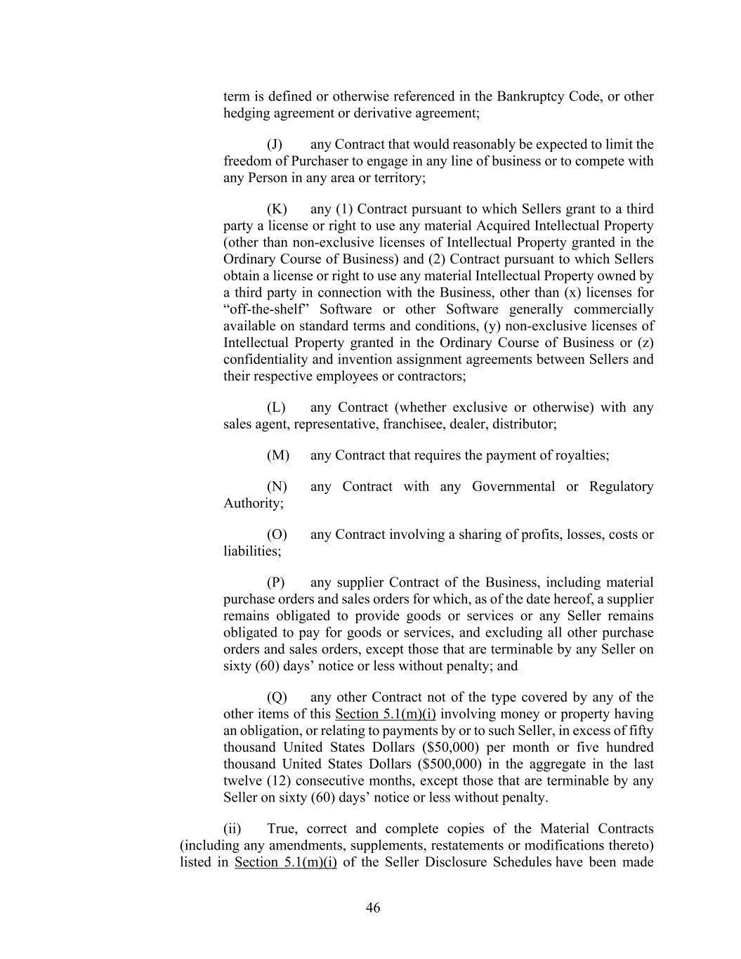 46 term is defined or otherwise referenced in the Bankruptcy Code, or other hedging agreement or derivative agreement; (J) any Contract that would reasonably be expected to limit the freedom of Purchaser to engage in any line of business or to compete with any Person in any area or territory; (K) any (1) Contract pursuant to which Sellers grant to a third party a license or right to use any material Acquired Intellectual Property (other than non-exclusive licenses of Intellectual Property granted in the Ordinary Course of Business) and (2) Contract pursuant to which Sellers obtain a license or right to use any material Intellectual Property owned by a third party in connection with the Business, other than (x) licenses for “off-the-shelf” Software or other Software generally commercially available on standard terms and conditions, (y) non-exclusive licenses of Intellectual Property granted in the Ordinary Course of Business or (z) confidentiality and invention assignment agreements between Sellers and their respective employees or contractors; (L) any Contract (whether exclusive or otherwise) with any sales agent, representative, franchisee, dealer, distributor; (M) any Contract that requires the payment of royalties; (N) any Contract with any Governmental or Regulatory Authority; (O) any Contract involving a sharing of profits, losses, costs or liabilities; (P) any supplier Contract of the Business, including material purchase orders and sales orders for which, as of the date hereof, a supplier remains obligated to provide goods or services or any Seller remains obligated to pay for goods or services, and excluding all other purchase orders and sales orders, except those that are terminable by any Seller on sixty (60) days’ notice or less without penalty; and (Q) any other Contract not of the type covered by any of the other items of this Section 5.1(m)(i) involving money or property having an obligation, or relating to payments by or to such Seller, in excess of fifty thousand United States Dollars ($50,000) per month or five hundred thousand United States Dollars ($500,000) in the aggregate in the last twelve (12) consecutive months, except those that are terminable by any Seller on sixty (60) days’ notice or less without penalty. (ii) True, correct and complete copies of the Material Contracts (including any amendments, supplements, restatements or modifications thereto) listed in Section 5.1(m)(i) of the Seller Disclosure Schedules have been made