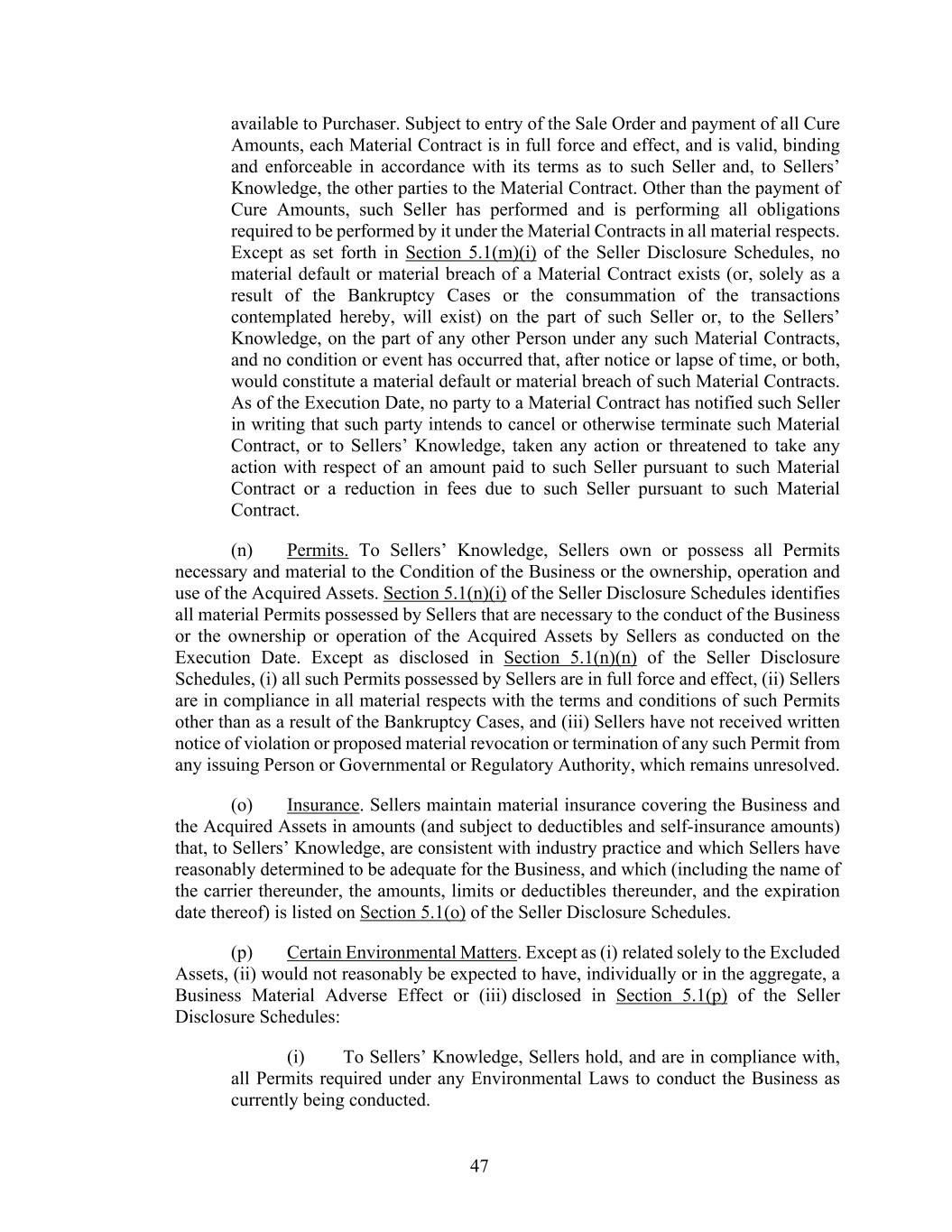 47 available to Purchaser. Subject to entry of the Sale Order and payment of all Cure Amounts, each Material Contract is in full force and effect, and is valid, binding and enforceable in accordance with its terms as to such Seller and, to Sellers’ Knowledge, the other parties to the Material Contract. Other than the payment of Cure Amounts, such Seller has performed and is performing all obligations required to be performed by it under the Material Contracts in all material respects. Except as set forth in Section 5.1(m)(i) of the Seller Disclosure Schedules, no material default or material breach of a Material Contract exists (or, solely as a result of the Bankruptcy Cases or the consummation of the transactions contemplated hereby, will exist) on the part of such Seller or, to the Sellers’ Knowledge, on the part of any other Person under any such Material Contracts, and no condition or event has occurred that, after notice or lapse of time, or both, would constitute a material default or material breach of such Material Contracts. As of the Execution Date, no party to a Material Contract has notified such Seller in writing that such party intends to cancel or otherwise terminate such Material Contract, or to Sellers’ Knowledge, taken any action or threatened to take any action with respect of an amount paid to such Seller pursuant to such Material Contract or a reduction in fees due to such Seller pursuant to such Material Contract. (n) Permits. To Sellers’ Knowledge, Sellers own or possess all Permits necessary and material to the Condition of the Business or the ownership, operation and use of the Acquired Assets. Section 5.1(n)(i) of the Seller Disclosure Schedules identifies all material Permits possessed by Sellers that are necessary to the conduct of the Business or the ownership or operation of the Acquired Assets by Sellers as conducted on the Execution Date. Except as disclosed in Section 5.1(n)(n) of the Seller Disclosure Schedules, (i) all such Permits possessed by Sellers are in full force and effect, (ii) Sellers are in compliance in all material respects with the terms and conditions of such Permits other than as a result of the Bankruptcy Cases, and (iii) Sellers have not received written notice of violation or proposed material revocation or termination of any such Permit from any issuing Person or Governmental or Regulatory Authority, which remains unresolved. (o) Insurance. Sellers maintain material insurance covering the Business and the Acquired Assets in amounts (and subject to deductibles and self-insurance amounts) that, to Sellers’ Knowledge, are consistent with industry practice and which Sellers have reasonably determined to be adequate for the Business, and which (including the name of the carrier thereunder, the amounts, limits or deductibles thereunder, and the expiration date thereof) is listed on Section 5.1(o) of the Seller Disclosure Schedules. (p) Certain Environmental Matters. Except as (i) related solely to the Excluded Assets, (ii) would not reasonably be expected to have, individually or in the aggregate, a Business Material Adverse Effect or (iii) disclosed in Section 5.1(p) of the Seller Disclosure Schedules: (i) To Sellers’ Knowledge, Sellers hold, and are in compliance with, all Permits required under any Environmental Laws to conduct the Business as currently being conducted.