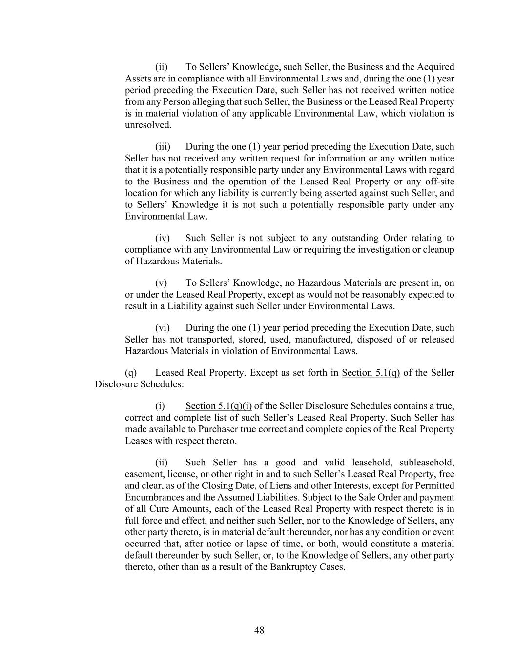48 (ii) To Sellers’ Knowledge, such Seller, the Business and the Acquired Assets are in compliance with all Environmental Laws and, during the one (1) year period preceding the Execution Date, such Seller has not received written notice from any Person alleging that such Seller, the Business or the Leased Real Property is in material violation of any applicable Environmental Law, which violation is unresolved. (iii) During the one (1) year period preceding the Execution Date, such Seller has not received any written request for information or any written notice that it is a potentially responsible party under any Environmental Laws with regard to the Business and the operation of the Leased Real Property or any off-site location for which any liability is currently being asserted against such Seller, and to Sellers’ Knowledge it is not such a potentially responsible party under any Environmental Law. (iv) Such Seller is not subject to any outstanding Order relating to compliance with any Environmental Law or requiring the investigation or cleanup of Hazardous Materials. (v) To Sellers’ Knowledge, no Hazardous Materials are present in, on or under the Leased Real Property, except as would not be reasonably expected to result in a Liability against such Seller under Environmental Laws. (vi) During the one (1) year period preceding the Execution Date, such Seller has not transported, stored, used, manufactured, disposed of or released Hazardous Materials in violation of Environmental Laws. (q) Leased Real Property. Except as set forth in Section 5.1(q) of the Seller Disclosure Schedules: (i) Section 5.1(q)(i) of the Seller Disclosure Schedules contains a true, correct and complete list of such Seller’s Leased Real Property. Such Seller has made available to Purchaser true correct and complete copies of the Real Property Leases with respect thereto. (ii) Such Seller has a good and valid leasehold, subleasehold, easement, license, or other right in and to such Seller’s Leased Real Property, free and clear, as of the Closing Date, of Liens and other Interests, except for Permitted Encumbrances and the Assumed Liabilities. Subject to the Sale Order and payment of all Cure Amounts, each of the Leased Real Property with respect thereto is in full force and effect, and neither such Seller, nor to the Knowledge of Sellers, any other party thereto, is in material default thereunder, nor has any condition or event occurred that, after notice or lapse of time, or both, would constitute a material default thereunder by such Seller, or, to the Knowledge of Sellers, any other party thereto, other than as a result of the Bankruptcy Cases.
