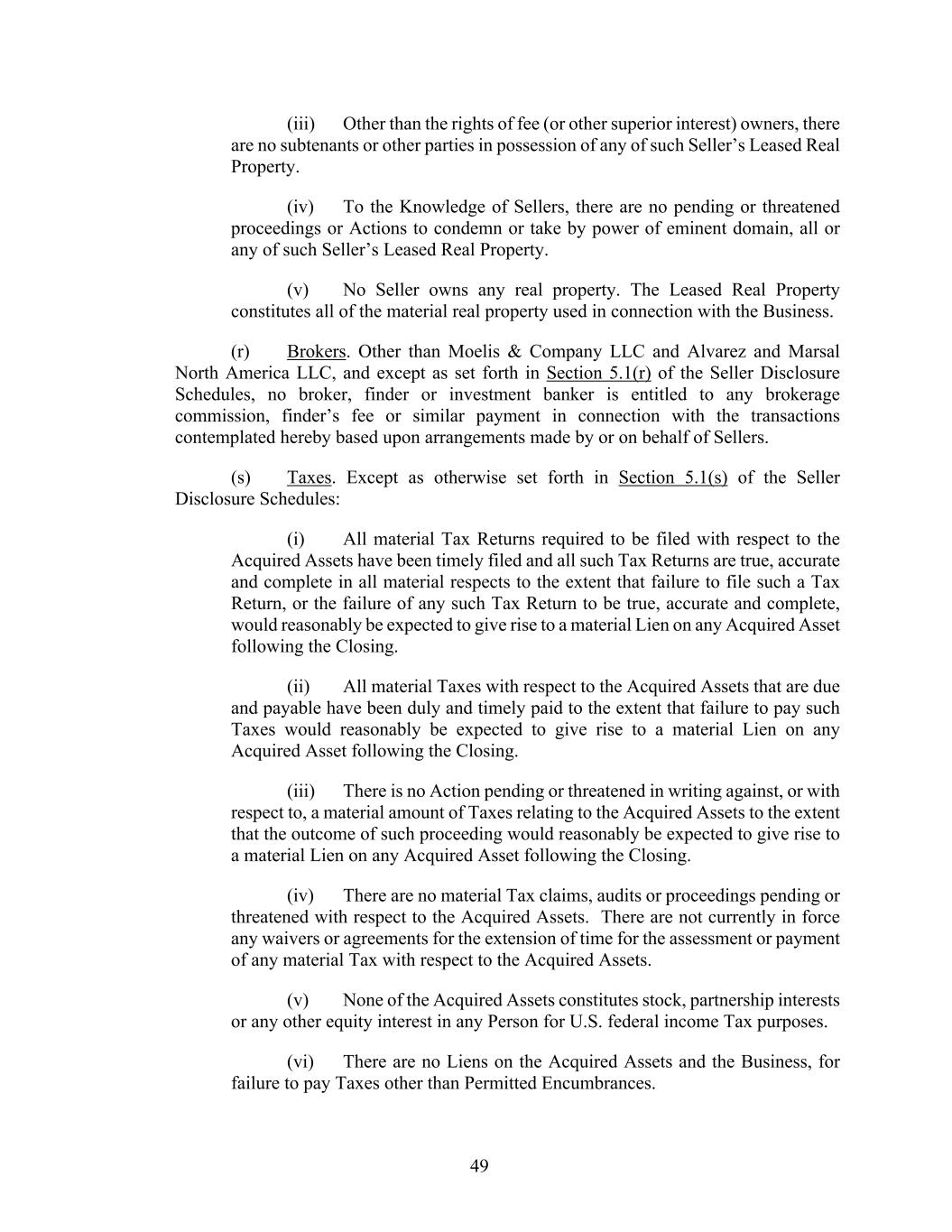 49 (iii) Other than the rights of fee (or other superior interest) owners, there are no subtenants or other parties in possession of any of such Seller’s Leased Real Property. (iv) To the Knowledge of Sellers, there are no pending or threatened proceedings or Actions to condemn or take by power of eminent domain, all or any of such Seller’s Leased Real Property. (v) No Seller owns any real property. The Leased Real Property constitutes all of the material real property used in connection with the Business. (r) Brokers. Other than Moelis & Company LLC and Alvarez and Marsal North America LLC, and except as set forth in Section 5.1(r) of the Seller Disclosure Schedules, no broker, finder or investment banker is entitled to any brokerage commission, finder’s fee or similar payment in connection with the transactions contemplated hereby based upon arrangements made by or on behalf of Sellers. (s) Taxes. Except as otherwise set forth in Section 5.1(s) of the Seller Disclosure Schedules: (i) All material Tax Returns required to be filed with respect to the Acquired Assets have been timely filed and all such Tax Returns are true, accurate and complete in all material respects to the extent that failure to file such a Tax Return, or the failure of any such Tax Return to be true, accurate and complete, would reasonably be expected to give rise to a material Lien on any Acquired Asset following the Closing. (ii) All material Taxes with respect to the Acquired Assets that are due and payable have been duly and timely paid to the extent that failure to pay such Taxes would reasonably be expected to give rise to a material Lien on any Acquired Asset following the Closing. (iii) There is no Action pending or threatened in writing against, or with respect to, a material amount of Taxes relating to the Acquired Assets to the extent that the outcome of such proceeding would reasonably be expected to give rise to a material Lien on any Acquired Asset following the Closing. (iv) There are no material Tax claims, audits or proceedings pending or threatened with respect to the Acquired Assets. There are not currently in force any waivers or agreements for the extension of time for the assessment or payment of any material Tax with respect to the Acquired Assets. (v) None of the Acquired Assets constitutes stock, partnership interests or any other equity interest in any Person for U.S. federal income Tax purposes. (vi) There are no Liens on the Acquired Assets and the Business, for failure to pay Taxes other than Permitted Encumbrances.