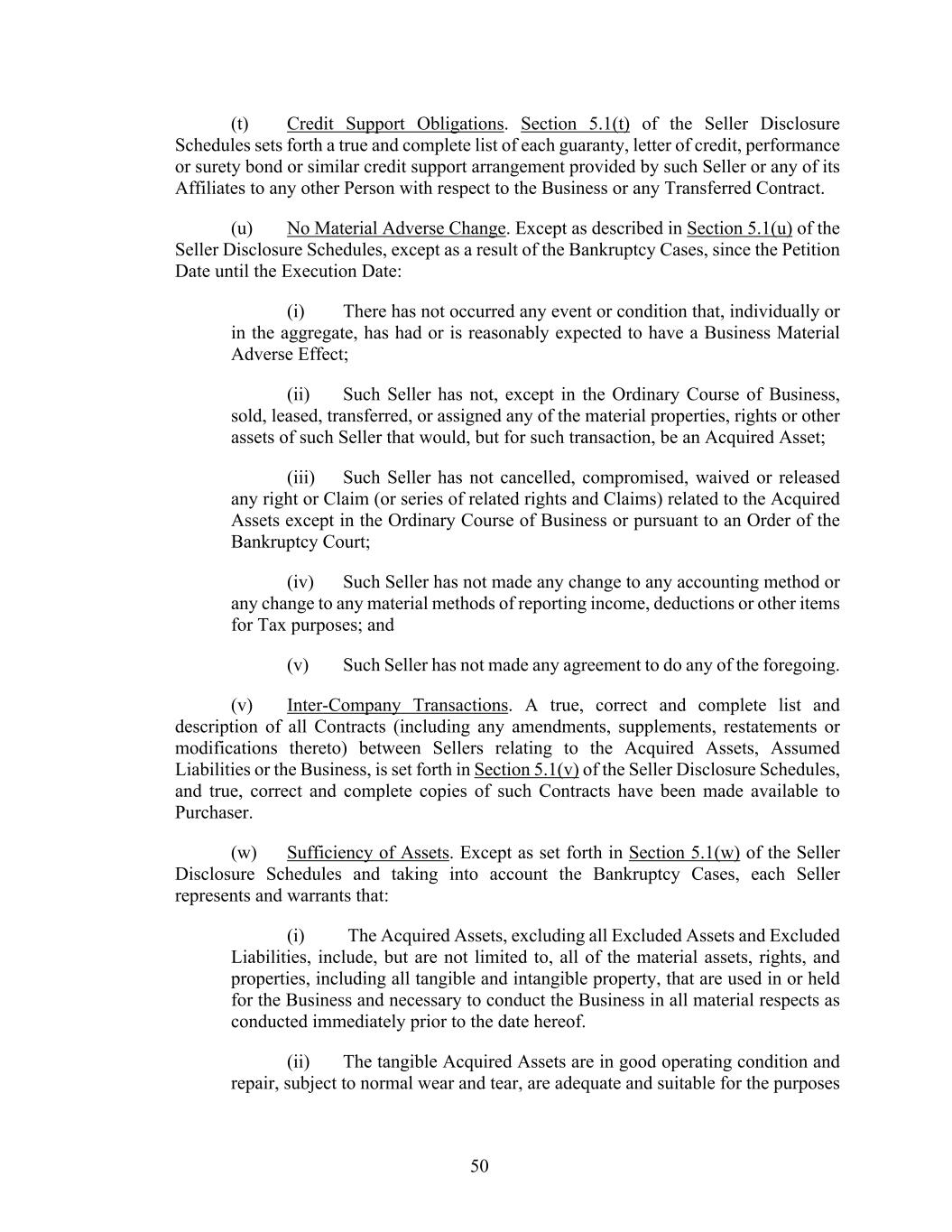50 (t) Credit Support Obligations. Section 5.1(t) of the Seller Disclosure Schedules sets forth a true and complete list of each guaranty, letter of credit, performance or surety bond or similar credit support arrangement provided by such Seller or any of its Affiliates to any other Person with respect to the Business or any Transferred Contract. (u) No Material Adverse Change. Except as described in Section 5.1(u) of the Seller Disclosure Schedules, except as a result of the Bankruptcy Cases, since the Petition Date until the Execution Date: (i) There has not occurred any event or condition that, individually or in the aggregate, has had or is reasonably expected to have a Business Material Adverse Effect; (ii) Such Seller has not, except in the Ordinary Course of Business, sold, leased, transferred, or assigned any of the material properties, rights or other assets of such Seller that would, but for such transaction, be an Acquired Asset; (iii) Such Seller has not cancelled, compromised, waived or released any right or Claim (or series of related rights and Claims) related to the Acquired Assets except in the Ordinary Course of Business or pursuant to an Order of the Bankruptcy Court; (iv) Such Seller has not made any change to any accounting method or any change to any material methods of reporting income, deductions or other items for Tax purposes; and (v) Such Seller has not made any agreement to do any of the foregoing. (v) Inter-Company Transactions. A true, correct and complete list and description of all Contracts (including any amendments, supplements, restatements or modifications thereto) between Sellers relating to the Acquired Assets, Assumed Liabilities or the Business, is set forth in Section 5.1(v) of the Seller Disclosure Schedules, and true, correct and complete copies of such Contracts have been made available to Purchaser. (w) Sufficiency of Assets. Except as set forth in Section 5.1(w) of the Seller Disclosure Schedules and taking into account the Bankruptcy Cases, each Seller represents and warrants that: (i) The Acquired Assets, excluding all Excluded Assets and Excluded Liabilities, include, but are not limited to, all of the material assets, rights, and properties, including all tangible and intangible property, that are used in or held for the Business and necessary to conduct the Business in all material respects as conducted immediately prior to the date hereof. (ii) The tangible Acquired Assets are in good operating condition and repair, subject to normal wear and tear, are adequate and suitable for the purposes