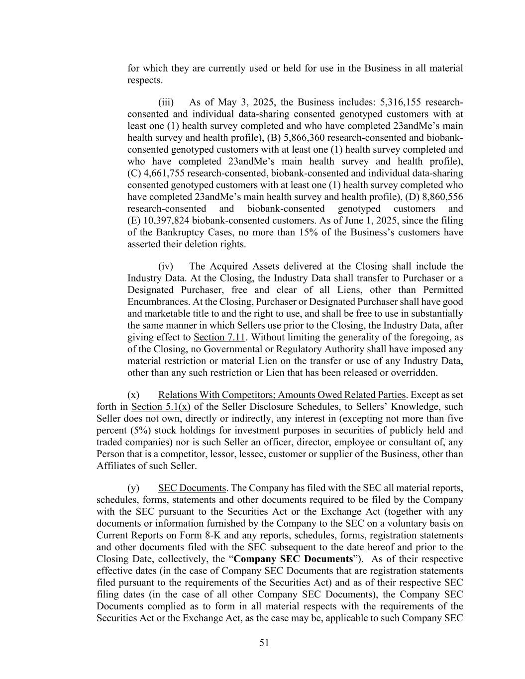 51 for which they are currently used or held for use in the Business in all material respects. (iii) As of May 3, 2025, the Business includes: 5,316,155 research- consented and individual data-sharing consented genotyped customers with at least one (1) health survey completed and who have completed 23andMe’s main health survey and health profile), (B) 5,866,360 research-consented and biobank- consented genotyped customers with at least one (1) health survey completed and who have completed 23andMe’s main health survey and health profile), (C) 4,661,755 research-consented, biobank-consented and individual data-sharing consented genotyped customers with at least one (1) health survey completed who have completed 23andMe’s main health survey and health profile), (D) 8,860,556 research-consented and biobank-consented genotyped customers and (E) 10,397,824 biobank-consented customers. As of June 1, 2025, since the filing of the Bankruptcy Cases, no more than 15% of the Business’s customers have asserted their deletion rights. (iv) The Acquired Assets delivered at the Closing shall include the Industry Data. At the Closing, the Industry Data shall transfer to Purchaser or a Designated Purchaser, free and clear of all Liens, other than Permitted Encumbrances. At the Closing, Purchaser or Designated Purchaser shall have good and marketable title to and the right to use, and shall be free to use in substantially the same manner in which Sellers use prior to the Closing, the Industry Data, after giving effect to Section 7.11. Without limiting the generality of the foregoing, as of the Closing, no Governmental or Regulatory Authority shall have imposed any material restriction or material Lien on the transfer or use of any Industry Data, other than any such restriction or Lien that has been released or overridden. (x) Relations With Competitors; Amounts Owed Related Parties. Except as set forth in Section 5.1(x) of the Seller Disclosure Schedules, to Sellers’ Knowledge, such Seller does not own, directly or indirectly, any interest in (excepting not more than five percent (5%) stock holdings for investment purposes in securities of publicly held and traded companies) nor is such Seller an officer, director, employee or consultant of, any Person that is a competitor, lessor, lessee, customer or supplier of the Business, other than Affiliates of such Seller. (y) SEC Documents. The Company has filed with the SEC all material reports, schedules, forms, statements and other documents required to be filed by the Company with the SEC pursuant to the Securities Act or the Exchange Act (together with any documents or information furnished by the Company to the SEC on a voluntary basis on Current Reports on Form 8-K and any reports, schedules, forms, registration statements and other documents filed with the SEC subsequent to the date hereof and prior to the Closing Date, collectively, the “Company SEC Documents”). As of their respective effective dates (in the case of Company SEC Documents that are registration statements filed pursuant to the requirements of the Securities Act) and as of their respective SEC filing dates (in the case of all other Company SEC Documents), the Company SEC Documents complied as to form in all material respects with the requirements of the Securities Act or the Exchange Act, as the case may be, applicable to such Company SEC