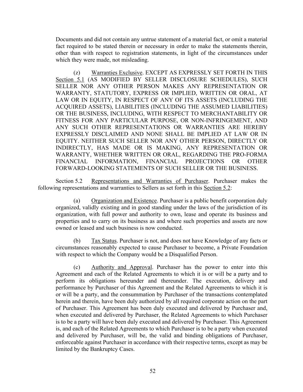 52 Documents and did not contain any untrue statement of a material fact, or omit a material fact required to be stated therein or necessary in order to make the statements therein, other than with respect to registration statements, in light of the circumstances under which they were made, not misleading. (z) Warranties Exclusive. EXCEPT AS EXPRESSLY SET FORTH IN THIS Section 5.1 (AS MODIFIED BY SELLER DISCLOSURE SCHEDULES), SUCH SELLER NOR ANY OTHER PERSON MAKES ANY REPRESENTATION OR WARRANTY, STATUTORY, EXPRESS OR IMPLIED, WRITTEN OR ORAL, AT LAW OR IN EQUITY, IN RESPECT OF ANY OF ITS ASSETS (INCLUDING THE ACQUIRED ASSETS), LIABILITIES (INCLUDING THE ASSUMED LIABILITIES) OR THE BUSINESS, INCLUDING, WITH RESPECT TO MERCHANTABILITY OR FITNESS FOR ANY PARTICULAR PURPOSE, OR NON-INFRINGEMENT, AND ANY SUCH OTHER REPRESENTATIONS OR WARRANTIES ARE HEREBY EXPRESSLY DISCLAIMED AND NONE SHALL BE IMPLIED AT LAW OR IN EQUITY. NEITHER SUCH SELLER NOR ANY OTHER PERSON, DIRECTLY OR INDIRECTLY, HAS MADE OR IS MAKING, ANY REPRESENTATION OR WARRANTY, WHETHER WRITTEN OR ORAL, REGARDING THE PRO-FORMA FINANCIAL INFORMATION, FINANCIAL PROJECTIONS OR OTHER FORWARD-LOOKING STATEMENTS OF SUCH SELLER OR THE BUSINESS. Section 5.2 Representations and Warranties of Purchaser. Purchaser makes the following representations and warranties to Sellers as set forth in this Section 5.2: (a) Organization and Existence. Purchaser is a public benefit corporation duly organized, validly existing and in good standing under the laws of the jurisdiction of its organization, with full power and authority to own, lease and operate its business and properties and to carry on its business as and where such properties and assets are now owned or leased and such business is now conducted. (b) Tax Status. Purchaser is not, and does not have Knowledge of any facts or circumstances reasonably expected to cause Purchaser to become, a Private Foundation with respect to which the Company would be a Disqualified Person. (c) Authority and Approval. Purchaser has the power to enter into this Agreement and each of the Related Agreements to which it is or will be a party and to perform its obligations hereunder and thereunder. The execution, delivery and performance by Purchaser of this Agreement and the Related Agreements to which it is or will be a party, and the consummation by Purchaser of the transactions contemplated herein and therein, have been duly authorized by all required corporate action on the part of Purchaser. This Agreement has been duly executed and delivered by Purchaser and, when executed and delivered by Purchaser, the Related Agreements to which Purchaser is to be a party will have been duly executed and delivered by Purchaser. This Agreement is, and each of the Related Agreements to which Purchaser is to be a party when executed and delivered by Purchaser, will be, the valid and binding obligations of Purchaser, enforceable against Purchaser in accordance with their respective terms, except as may be limited by the Bankruptcy Cases.