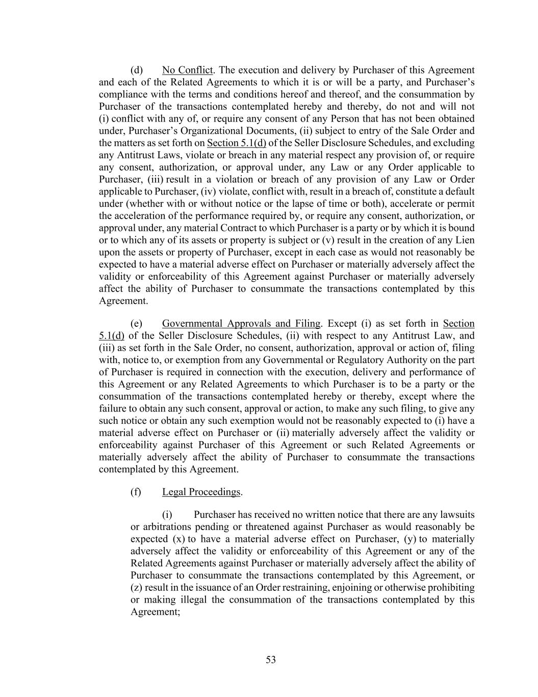 53 (d) No Conflict. The execution and delivery by Purchaser of this Agreement and each of the Related Agreements to which it is or will be a party, and Purchaser’s compliance with the terms and conditions hereof and thereof, and the consummation by Purchaser of the transactions contemplated hereby and thereby, do not and will not (i) conflict with any of, or require any consent of any Person that has not been obtained under, Purchaser’s Organizational Documents, (ii) subject to entry of the Sale Order and the matters as set forth on Section 5.1(d) of the Seller Disclosure Schedules, and excluding any Antitrust Laws, violate or breach in any material respect any provision of, or require any consent, authorization, or approval under, any Law or any Order applicable to Purchaser, (iii) result in a violation or breach of any provision of any Law or Order applicable to Purchaser, (iv) violate, conflict with, result in a breach of, constitute a default under (whether with or without notice or the lapse of time or both), accelerate or permit the acceleration of the performance required by, or require any consent, authorization, or approval under, any material Contract to which Purchaser is a party or by which it is bound or to which any of its assets or property is subject or (v) result in the creation of any Lien upon the assets or property of Purchaser, except in each case as would not reasonably be expected to have a material adverse effect on Purchaser or materially adversely affect the validity or enforceability of this Agreement against Purchaser or materially adversely affect the ability of Purchaser to consummate the transactions contemplated by this Agreement. (e) Governmental Approvals and Filing. Except (i) as set forth in Section 5.1(d) of the Seller Disclosure Schedules, (ii) with respect to any Antitrust Law, and (iii) as set forth in the Sale Order, no consent, authorization, approval or action of, filing with, notice to, or exemption from any Governmental or Regulatory Authority on the part of Purchaser is required in connection with the execution, delivery and performance of this Agreement or any Related Agreements to which Purchaser is to be a party or the consummation of the transactions contemplated hereby or thereby, except where the failure to obtain any such consent, approval or action, to make any such filing, to give any such notice or obtain any such exemption would not be reasonably expected to (i) have a material adverse effect on Purchaser or (ii) materially adversely affect the validity or enforceability against Purchaser of this Agreement or such Related Agreements or materially adversely affect the ability of Purchaser to consummate the transactions contemplated by this Agreement. (f) Legal Proceedings. (i) Purchaser has received no written notice that there are any lawsuits or arbitrations pending or threatened against Purchaser as would reasonably be expected (x) to have a material adverse effect on Purchaser, (y) to materially adversely affect the validity or enforceability of this Agreement or any of the Related Agreements against Purchaser or materially adversely affect the ability of Purchaser to consummate the transactions contemplated by this Agreement, or (z) result in the issuance of an Order restraining, enjoining or otherwise prohibiting or making illegal the consummation of the transactions contemplated by this Agreement;