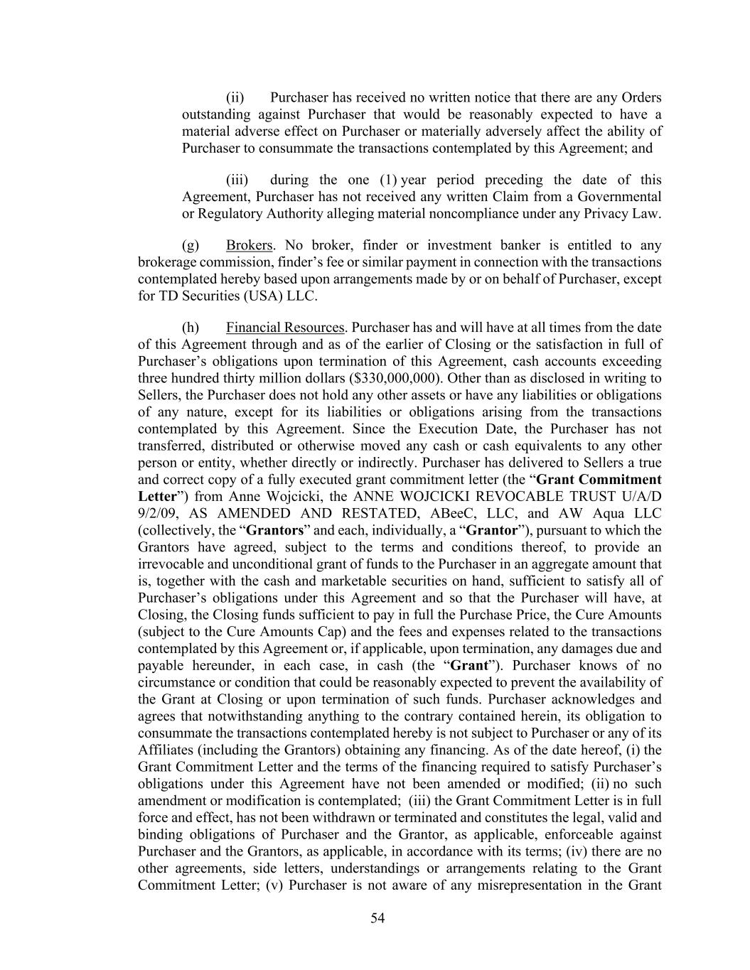 54 (ii) Purchaser has received no written notice that there are any Orders outstanding against Purchaser that would be reasonably expected to have a material adverse effect on Purchaser or materially adversely affect the ability of Purchaser to consummate the transactions contemplated by this Agreement; and (iii) during the one (1) year period preceding the date of this Agreement, Purchaser has not received any written Claim from a Governmental or Regulatory Authority alleging material noncompliance under any Privacy Law. (g) Brokers. No broker, finder or investment banker is entitled to any brokerage commission, finder’s fee or similar payment in connection with the transactions contemplated hereby based upon arrangements made by or on behalf of Purchaser, except for TD Securities (USA) LLC. (h) Financial Resources. Purchaser has and will have at all times from the date of this Agreement through and as of the earlier of Closing or the satisfaction in full of Purchaser’s obligations upon termination of this Agreement, cash accounts exceeding three hundred thirty million dollars ($330,000,000). Other than as disclosed in writing to Sellers, the Purchaser does not hold any other assets or have any liabilities or obligations of any nature, except for its liabilities or obligations arising from the transactions contemplated by this Agreement. Since the Execution Date, the Purchaser has not transferred, distributed or otherwise moved any cash or cash equivalents to any other person or entity, whether directly or indirectly. Purchaser has delivered to Sellers a true and correct copy of a fully executed grant commitment letter (the “Grant Commitment Letter”) from Anne Wojcicki, the ANNE WOJCICKI REVOCABLE TRUST U/A/D 9/2/09, AS AMENDED AND RESTATED, ABeeC, LLC, and AW Aqua LLC (collectively, the “Grantors” and each, individually, a “Grantor”), pursuant to which the Grantors have agreed, subject to the terms and conditions thereof, to provide an irrevocable and unconditional grant of funds to the Purchaser in an aggregate amount that is, together with the cash and marketable securities on hand, sufficient to satisfy all of Purchaser’s obligations under this Agreement and so that the Purchaser will have, at Closing, the Closing funds sufficient to pay in full the Purchase Price, the Cure Amounts (subject to the Cure Amounts Cap) and the fees and expenses related to the transactions contemplated by this Agreement or, if applicable, upon termination, any damages due and payable hereunder, in each case, in cash (the “Grant”). Purchaser knows of no circumstance or condition that could be reasonably expected to prevent the availability of the Grant at Closing or upon termination of such funds. Purchaser acknowledges and agrees that notwithstanding anything to the contrary contained herein, its obligation to consummate the transactions contemplated hereby is not subject to Purchaser or any of its Affiliates (including the Grantors) obtaining any financing. As of the date hereof, (i) the Grant Commitment Letter and the terms of the financing required to satisfy Purchaser’s obligations under this Agreement have not been amended or modified; (ii) no such amendment or modification is contemplated; (iii) the Grant Commitment Letter is in full force and effect, has not been withdrawn or terminated and constitutes the legal, valid and binding obligations of Purchaser and the Grantor, as applicable, enforceable against Purchaser and the Grantors, as applicable, in accordance with its terms; (iv) there are no other agreements, side letters, understandings or arrangements relating to the Grant Commitment Letter; (v) Purchaser is not aware of any misrepresentation in the Grant