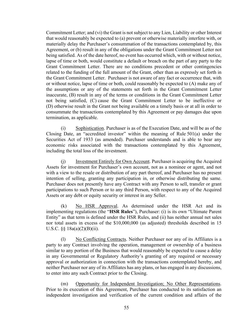 55 Commitment Letter; and (vi) the Grant is not subject to any Lien, Liability or other Interest that would reasonably be expected to (a) prevent or otherwise materially interfere with, or materially delay the Purchaser’s consummation of the transactions contemplated by, this Agreement, or (b) result in any of the obligations under the Grant Commitment Letter not being satisfied. As of the date hereof, no event has occurred which, with or without notice, lapse of time or both, would constitute a default or breach on the part of any party to the Grant Commitment Letter. There are no conditions precedent or other contingencies related to the funding of the full amount of the Grant, other than as expressly set forth in the Grant Commitment Letter. Purchaser is not aware of any fact or occurrence that, with or without notice, lapse of time or both, could reasonably be expected to (A) make any of the assumptions or any of the statements set forth in the Grant Commitment Letter inaccurate, (B) result in any of the terms or conditions in the Grant Commitment Letter not being satisfied, (C) cause the Grant Commitment Letter to be ineffective or (D) otherwise result in the Grant not being available on a timely basis or at all in order to consummate the transactions contemplated by this Agreement or pay damages due upon termination, as applicable. (i) Sophistication. Purchaser is as of the Execution Date, and will be as of the Closing Date, an “accredited investor” within the meaning of Rule 501(a) under the Securities Act of 1933 (as amended). Purchaser understands and is able to bear any economic risks associated with the transactions contemplated by this Agreement, including the total loss of the investment. (j) Investment Entirely for Own Account. Purchaser is acquiring the Acquired Assets for investment for Purchaser’s own account, not as a nominee or agent, and not with a view to the resale or distribution of any part thereof, and Purchaser has no present intention of selling, granting any participation in, or otherwise distributing the same. Purchaser does not presently have any Contract with any Person to sell, transfer or grant participations to such Person or to any third Person, with respect to any of the Acquired Assets or any debt or equity security or interest in any Seller. (k) No HSR Approval. As determined under the HSR Act and its implementing regulations (the “HSR Rules”), Purchaser: (i) is its own “Ultimate Parent Entity” as that term is defined under the HSR Rules, and (ii) has neither annual net sales nor total assets in excess of the $10,000,000 (as adjusted) thresholds described in 15 U.S.C. §§ 18a(a)(2)(B)(ii). (l) No Conflicting Contracts. Neither Purchaser nor any of its Affiliates is a party to any Contract involving the operation, management or ownership of a business similar to any portion of the Business that would reasonably be expected to cause a delay in any Governmental or Regulatory Authority’s granting of any required or necessary approval or authorization in connection with the transactions contemplated hereby, and neither Purchaser nor any of its Affiliates has any plans, or has engaged in any discussions, to enter into any such Contract prior to the Closing. (m) Opportunity for Independent Investigation; No Other Representations. Prior to its execution of this Agreement, Purchaser has conducted to its satisfaction an independent investigation and verification of the current condition and affairs of the