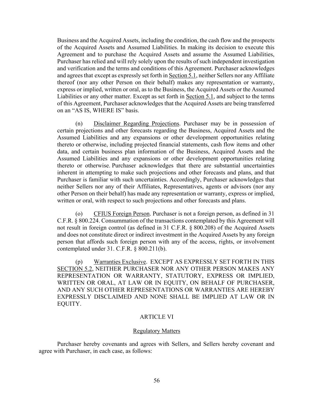 56 Business and the Acquired Assets, including the condition, the cash flow and the prospects of the Acquired Assets and Assumed Liabilities. In making its decision to execute this Agreement and to purchase the Acquired Assets and assume the Assumed Liabilities, Purchaser has relied and will rely solely upon the results of such independent investigation and verification and the terms and conditions of this Agreement. Purchaser acknowledges and agrees that except as expressly set forth in Section 5.1, neither Sellers nor any Affiliate thereof (nor any other Person on their behalf) makes any representation or warranty, express or implied, written or oral, as to the Business, the Acquired Assets or the Assumed Liabilities or any other matter. Except as set forth in Section 5.1, and subject to the terms of this Agreement, Purchaser acknowledges that the Acquired Assets are being transferred on an “AS IS, WHERE IS” basis. (n) Disclaimer Regarding Projections. Purchaser may be in possession of certain projections and other forecasts regarding the Business, Acquired Assets and the Assumed Liabilities and any expansions or other development opportunities relating thereto or otherwise, including projected financial statements, cash flow items and other data, and certain business plan information of the Business, Acquired Assets and the Assumed Liabilities and any expansions or other development opportunities relating thereto or otherwise. Purchaser acknowledges that there are substantial uncertainties inherent in attempting to make such projections and other forecasts and plans, and that Purchaser is familiar with such uncertainties. Accordingly, Purchaser acknowledges that neither Sellers nor any of their Affiliates, Representatives, agents or advisors (nor any other Person on their behalf) has made any representation or warranty, express or implied, written or oral, with respect to such projections and other forecasts and plans. (o) CFIUS Foreign Person. Purchaser is not a foreign person, as defined in 31 C.F.R. § 800.224. Consummation of the transactions contemplated by this Agreement will not result in foreign control (as defined in 31 C.F.R. § 800.208) of the Acquired Assets and does not constitute direct or indirect investment in the Acquired Assets by any foreign person that affords such foreign person with any of the access, rights, or involvement contemplated under 31. C.F.R. § 800.211(b). (p) Warranties Exclusive. EXCEPT AS EXPRESSLY SET FORTH IN THIS SECTION 5.2, NEITHER PURCHASER NOR ANY OTHER PERSON MAKES ANY REPRESENTATION OR WARRANTY, STATUTORY, EXPRESS OR IMPLIED, WRITTEN OR ORAL, AT LAW OR IN EQUITY, ON BEHALF OF PURCHASER, AND ANY SUCH OTHER REPRESENTATIONS OR WARRANTIES ARE HEREBY EXPRESSLY DISCLAIMED AND NONE SHALL BE IMPLIED AT LAW OR IN EQUITY. ARTICLE VI Regulatory Matters Purchaser hereby covenants and agrees with Sellers, and Sellers hereby covenant and agree with Purchaser, in each case, as follows:
