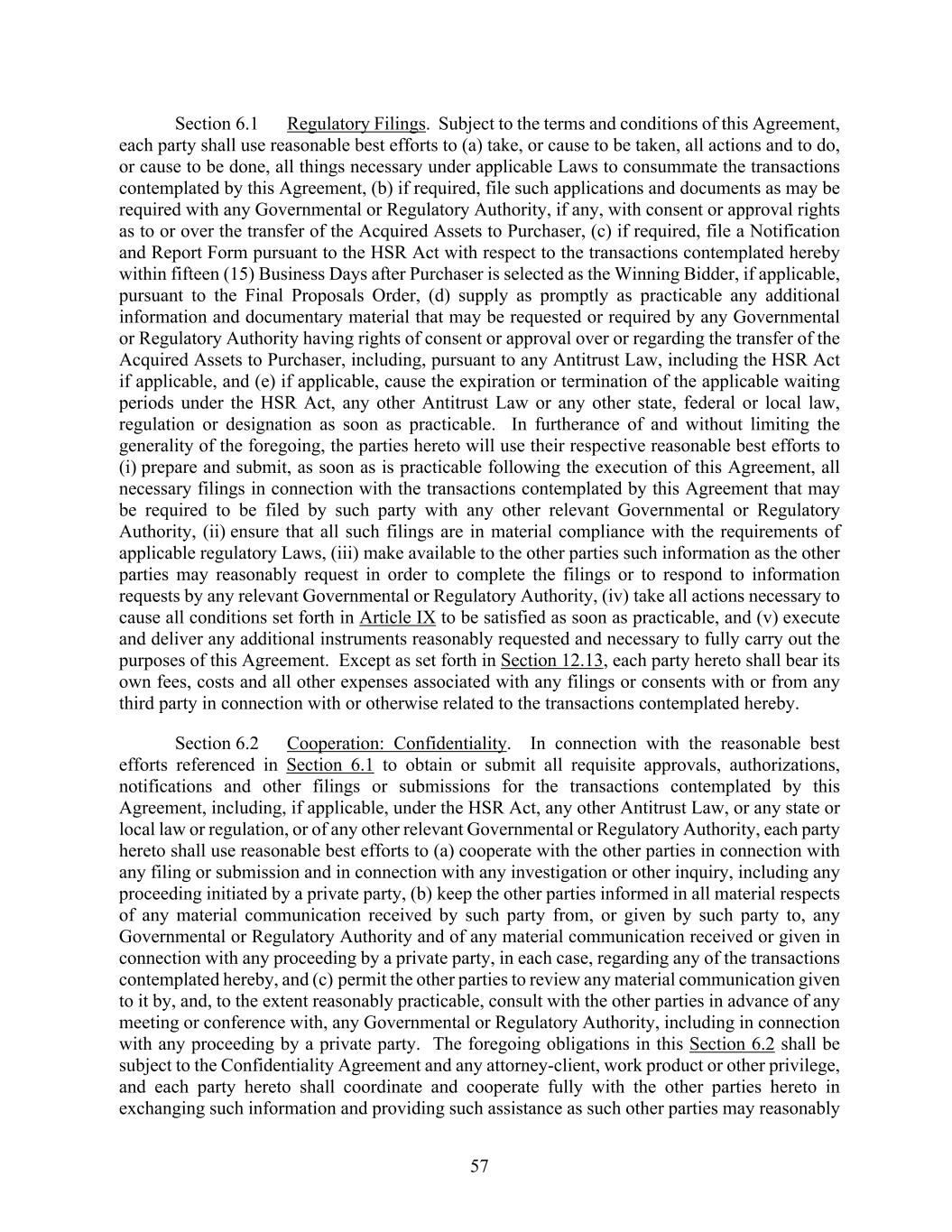 57 Section 6.1 Regulatory Filings. Subject to the terms and conditions of this Agreement, each party shall use reasonable best efforts to (a) take, or cause to be taken, all actions and to do, or cause to be done, all things necessary under applicable Laws to consummate the transactions contemplated by this Agreement, (b) if required, file such applications and documents as may be required with any Governmental or Regulatory Authority, if any, with consent or approval rights as to or over the transfer of the Acquired Assets to Purchaser, (c) if required, file a Notification and Report Form pursuant to the HSR Act with respect to the transactions contemplated hereby within fifteen (15) Business Days after Purchaser is selected as the Winning Bidder, if applicable, pursuant to the Final Proposals Order, (d) supply as promptly as practicable any additional information and documentary material that may be requested or required by any Governmental or Regulatory Authority having rights of consent or approval over or regarding the transfer of the Acquired Assets to Purchaser, including, pursuant to any Antitrust Law, including the HSR Act if applicable, and (e) if applicable, cause the expiration or termination of the applicable waiting periods under the HSR Act, any other Antitrust Law or any other state, federal or local law, regulation or designation as soon as practicable. In furtherance of and without limiting the generality of the foregoing, the parties hereto will use their respective reasonable best efforts to (i) prepare and submit, as soon as is practicable following the execution of this Agreement, all necessary filings in connection with the transactions contemplated by this Agreement that may be required to be filed by such party with any other relevant Governmental or Regulatory Authority, (ii) ensure that all such filings are in material compliance with the requirements of applicable regulatory Laws, (iii) make available to the other parties such information as the other parties may reasonably request in order to complete the filings or to respond to information requests by any relevant Governmental or Regulatory Authority, (iv) take all actions necessary to cause all conditions set forth in Article IX to be satisfied as soon as practicable, and (v) execute and deliver any additional instruments reasonably requested and necessary to fully carry out the purposes of this Agreement. Except as set forth in Section 12.13, each party hereto shall bear its own fees, costs and all other expenses associated with any filings or consents with or from any third party in connection with or otherwise related to the transactions contemplated hereby. Section 6.2 Cooperation: Confidentiality. In connection with the reasonable best efforts referenced in Section 6.1 to obtain or submit all requisite approvals, authorizations, notifications and other filings or submissions for the transactions contemplated by this Agreement, including, if applicable, under the HSR Act, any other Antitrust Law, or any state or local law or regulation, or of any other relevant Governmental or Regulatory Authority, each party hereto shall use reasonable best efforts to (a) cooperate with the other parties in connection with any filing or submission and in connection with any investigation or other inquiry, including any proceeding initiated by a private party, (b) keep the other parties informed in all material respects of any material communication received by such party from, or given by such party to, any Governmental or Regulatory Authority and of any material communication received or given in connection with any proceeding by a private party, in each case, regarding any of the transactions contemplated hereby, and (c) permit the other parties to review any material communication given to it by, and, to the extent reasonably practicable, consult with the other parties in advance of any meeting or conference with, any Governmental or Regulatory Authority, including in connection with any proceeding by a private party. The foregoing obligations in this Section 6.2 shall be subject to the Confidentiality Agreement and any attorney-client, work product or other privilege, and each party hereto shall coordinate and cooperate fully with the other parties hereto in exchanging such information and providing such assistance as such other parties may reasonably