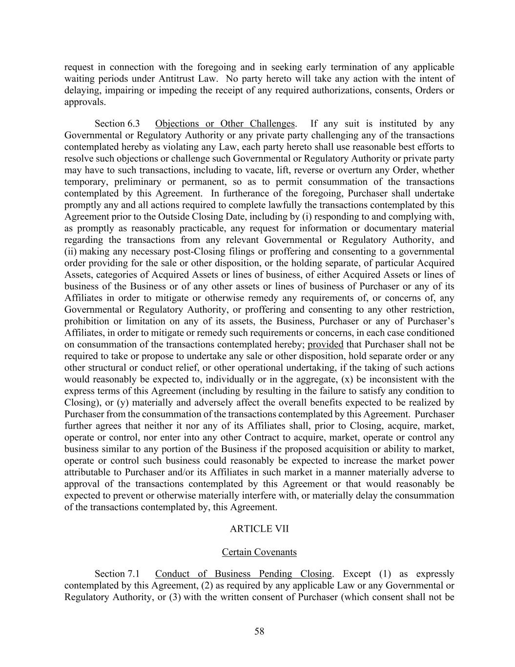 58 request in connection with the foregoing and in seeking early termination of any applicable waiting periods under Antitrust Law. No party hereto will take any action with the intent of delaying, impairing or impeding the receipt of any required authorizations, consents, Orders or approvals. Section 6.3 Objections or Other Challenges. If any suit is instituted by any Governmental or Regulatory Authority or any private party challenging any of the transactions contemplated hereby as violating any Law, each party hereto shall use reasonable best efforts to resolve such objections or challenge such Governmental or Regulatory Authority or private party may have to such transactions, including to vacate, lift, reverse or overturn any Order, whether temporary, preliminary or permanent, so as to permit consummation of the transactions contemplated by this Agreement. In furtherance of the foregoing, Purchaser shall undertake promptly any and all actions required to complete lawfully the transactions contemplated by this Agreement prior to the Outside Closing Date, including by (i) responding to and complying with, as promptly as reasonably practicable, any request for information or documentary material regarding the transactions from any relevant Governmental or Regulatory Authority, and (ii) making any necessary post-Closing filings or proffering and consenting to a governmental order providing for the sale or other disposition, or the holding separate, of particular Acquired Assets, categories of Acquired Assets or lines of business, of either Acquired Assets or lines of business of the Business or of any other assets or lines of business of Purchaser or any of its Affiliates in order to mitigate or otherwise remedy any requirements of, or concerns of, any Governmental or Regulatory Authority, or proffering and consenting to any other restriction, prohibition or limitation on any of its assets, the Business, Purchaser or any of Purchaser’s Affiliates, in order to mitigate or remedy such requirements or concerns, in each case conditioned on consummation of the transactions contemplated hereby; provided that Purchaser shall not be required to take or propose to undertake any sale or other disposition, hold separate order or any other structural or conduct relief, or other operational undertaking, if the taking of such actions would reasonably be expected to, individually or in the aggregate, (x) be inconsistent with the express terms of this Agreement (including by resulting in the failure to satisfy any condition to Closing), or (y) materially and adversely affect the overall benefits expected to be realized by Purchaser from the consummation of the transactions contemplated by this Agreement. Purchaser further agrees that neither it nor any of its Affiliates shall, prior to Closing, acquire, market, operate or control, nor enter into any other Contract to acquire, market, operate or control any business similar to any portion of the Business if the proposed acquisition or ability to market, operate or control such business could reasonably be expected to increase the market power attributable to Purchaser and/or its Affiliates in such market in a manner materially adverse to approval of the transactions contemplated by this Agreement or that would reasonably be expected to prevent or otherwise materially interfere with, or materially delay the consummation of the transactions contemplated by, this Agreement. ARTICLE VII Certain Covenants Section 7.1 Conduct of Business Pending Closing. Except (1) as expressly contemplated by this Agreement, (2) as required by any applicable Law or any Governmental or Regulatory Authority, or (3) with the written consent of Purchaser (which consent shall not be