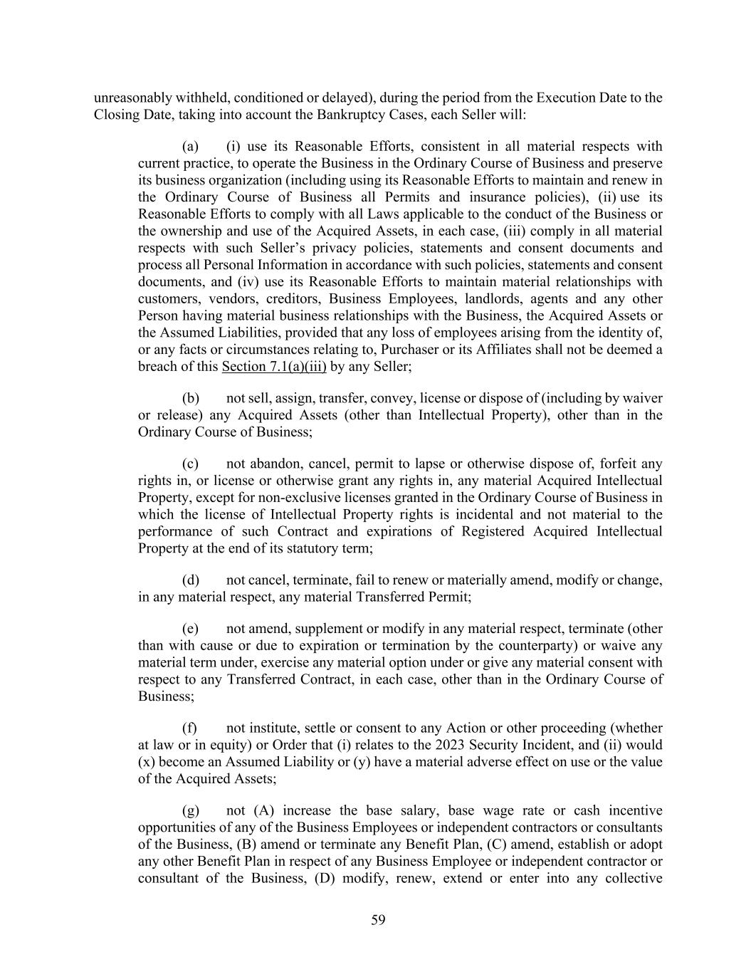 59 unreasonably withheld, conditioned or delayed), during the period from the Execution Date to the Closing Date, taking into account the Bankruptcy Cases, each Seller will: (a) (i) use its Reasonable Efforts, consistent in all material respects with current practice, to operate the Business in the Ordinary Course of Business and preserve its business organization (including using its Reasonable Efforts to maintain and renew in the Ordinary Course of Business all Permits and insurance policies), (ii) use its Reasonable Efforts to comply with all Laws applicable to the conduct of the Business or the ownership and use of the Acquired Assets, in each case, (iii) comply in all material respects with such Seller’s privacy policies, statements and consent documents and process all Personal Information in accordance with such policies, statements and consent documents, and (iv) use its Reasonable Efforts to maintain material relationships with customers, vendors, creditors, Business Employees, landlords, agents and any other Person having material business relationships with the Business, the Acquired Assets or the Assumed Liabilities, provided that any loss of employees arising from the identity of, or any facts or circumstances relating to, Purchaser or its Affiliates shall not be deemed a breach of this Section 7.1(a)(iii) by any Seller; (b) not sell, assign, transfer, convey, license or dispose of (including by waiver or release) any Acquired Assets (other than Intellectual Property), other than in the Ordinary Course of Business; (c) not abandon, cancel, permit to lapse or otherwise dispose of, forfeit any rights in, or license or otherwise grant any rights in, any material Acquired Intellectual Property, except for non-exclusive licenses granted in the Ordinary Course of Business in which the license of Intellectual Property rights is incidental and not material to the performance of such Contract and expirations of Registered Acquired Intellectual Property at the end of its statutory term; (d) not cancel, terminate, fail to renew or materially amend, modify or change, in any material respect, any material Transferred Permit; (e) not amend, supplement or modify in any material respect, terminate (other than with cause or due to expiration or termination by the counterparty) or waive any material term under, exercise any material option under or give any material consent with respect to any Transferred Contract, in each case, other than in the Ordinary Course of Business; (f) not institute, settle or consent to any Action or other proceeding (whether at law or in equity) or Order that (i) relates to the 2023 Security Incident, and (ii) would (x) become an Assumed Liability or (y) have a material adverse effect on use or the value of the Acquired Assets; (g) not (A) increase the base salary, base wage rate or cash incentive opportunities of any of the Business Employees or independent contractors or consultants of the Business, (B) amend or terminate any Benefit Plan, (C) amend, establish or adopt any other Benefit Plan in respect of any Business Employee or independent contractor or consultant of the Business, (D) modify, renew, extend or enter into any collective