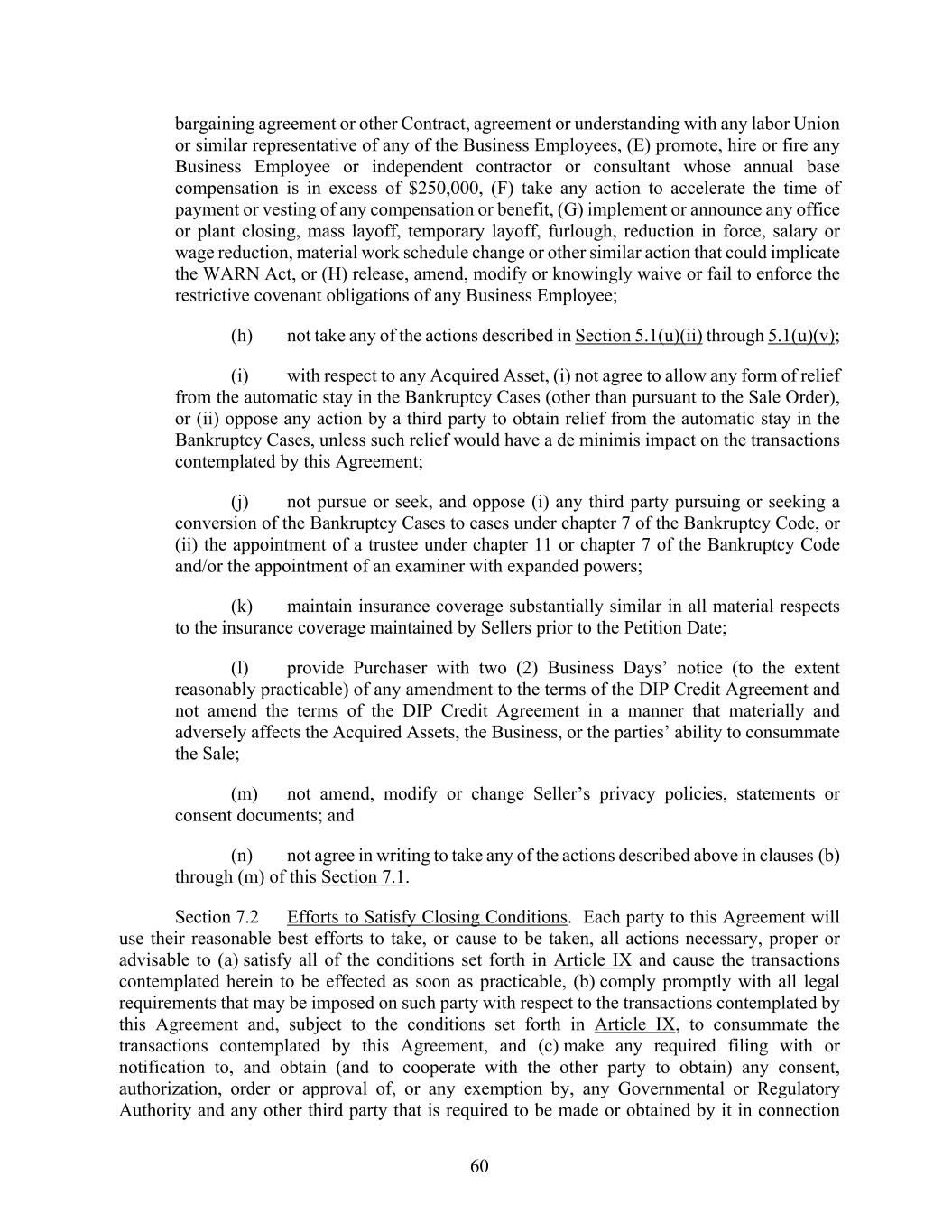 60 bargaining agreement or other Contract, agreement or understanding with any labor Union or similar representative of any of the Business Employees, (E) promote, hire or fire any Business Employee or independent contractor or consultant whose annual base compensation is in excess of $250,000, (F) take any action to accelerate the time of payment or vesting of any compensation or benefit, (G) implement or announce any office or plant closing, mass layoff, temporary layoff, furlough, reduction in force, salary or wage reduction, material work schedule change or other similar action that could implicate the WARN Act, or (H) release, amend, modify or knowingly waive or fail to enforce the restrictive covenant obligations of any Business Employee; (h) not take any of the actions described in Section 5.1(u)(ii) through 5.1(u)(v); (i) with respect to any Acquired Asset, (i) not agree to allow any form of relief from the automatic stay in the Bankruptcy Cases (other than pursuant to the Sale Order), or (ii) oppose any action by a third party to obtain relief from the automatic stay in the Bankruptcy Cases, unless such relief would have a de minimis impact on the transactions contemplated by this Agreement; (j) not pursue or seek, and oppose (i) any third party pursuing or seeking a conversion of the Bankruptcy Cases to cases under chapter 7 of the Bankruptcy Code, or (ii) the appointment of a trustee under chapter 11 or chapter 7 of the Bankruptcy Code and/or the appointment of an examiner with expanded powers; (k) maintain insurance coverage substantially similar in all material respects to the insurance coverage maintained by Sellers prior to the Petition Date; (l) provide Purchaser with two (2) Business Days’ notice (to the extent reasonably practicable) of any amendment to the terms of the DIP Credit Agreement and not amend the terms of the DIP Credit Agreement in a manner that materially and adversely affects the Acquired Assets, the Business, or the parties’ ability to consummate the Sale; (m) not amend, modify or change Seller’s privacy policies, statements or consent documents; and (n) not agree in writing to take any of the actions described above in clauses (b) through (m) of this Section 7.1. Section 7.2 Efforts to Satisfy Closing Conditions. Each party to this Agreement will use their reasonable best efforts to take, or cause to be taken, all actions necessary, proper or advisable to (a) satisfy all of the conditions set forth in Article IX and cause the transactions contemplated herein to be effected as soon as practicable, (b) comply promptly with all legal requirements that may be imposed on such party with respect to the transactions contemplated by this Agreement and, subject to the conditions set forth in Article IX, to consummate the transactions contemplated by this Agreement, and (c) make any required filing with or notification to, and obtain (and to cooperate with the other party to obtain) any consent, authorization, order or approval of, or any exemption by, any Governmental or Regulatory Authority and any other third party that is required to be made or obtained by it in connection