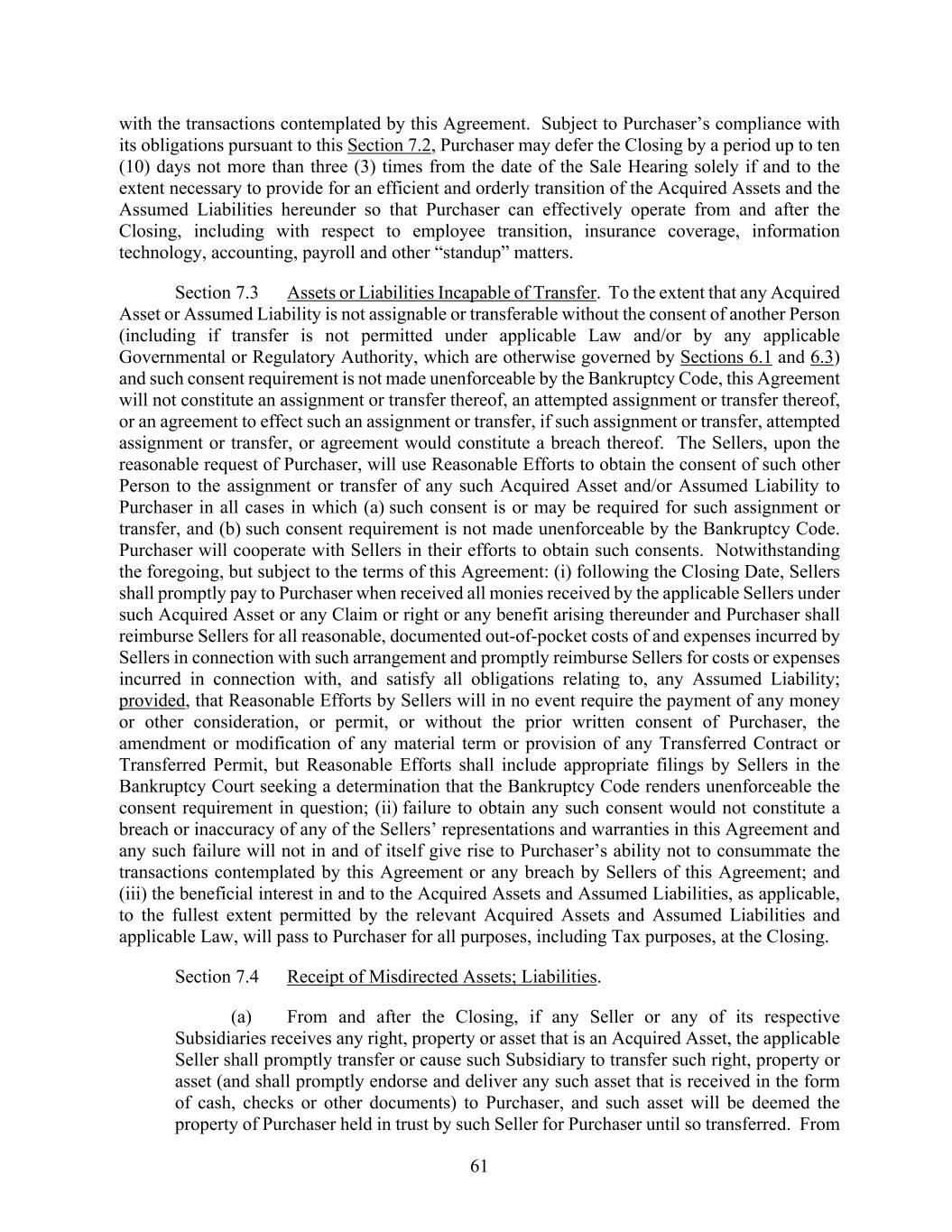 61 with the transactions contemplated by this Agreement. Subject to Purchaser’s compliance with its obligations pursuant to this Section 7.2, Purchaser may defer the Closing by a period up to ten (10) days not more than three (3) times from the date of the Sale Hearing solely if and to the extent necessary to provide for an efficient and orderly transition of the Acquired Assets and the Assumed Liabilities hereunder so that Purchaser can effectively operate from and after the Closing, including with respect to employee transition, insurance coverage, information technology, accounting, payroll and other “standup” matters. Section 7.3 Assets or Liabilities Incapable of Transfer. To the extent that any Acquired Asset or Assumed Liability is not assignable or transferable without the consent of another Person (including if transfer is not permitted under applicable Law and/or by any applicable Governmental or Regulatory Authority, which are otherwise governed by Sections 6.1 and 6.3) and such consent requirement is not made unenforceable by the Bankruptcy Code, this Agreement will not constitute an assignment or transfer thereof, an attempted assignment or transfer thereof, or an agreement to effect such an assignment or transfer, if such assignment or transfer, attempted assignment or transfer, or agreement would constitute a breach thereof. The Sellers, upon the reasonable request of Purchaser, will use Reasonable Efforts to obtain the consent of such other Person to the assignment or transfer of any such Acquired Asset and/or Assumed Liability to Purchaser in all cases in which (a) such consent is or may be required for such assignment or transfer, and (b) such consent requirement is not made unenforceable by the Bankruptcy Code. Purchaser will cooperate with Sellers in their efforts to obtain such consents. Notwithstanding the foregoing, but subject to the terms of this Agreement: (i) following the Closing Date, Sellers shall promptly pay to Purchaser when received all monies received by the applicable Sellers under such Acquired Asset or any Claim or right or any benefit arising thereunder and Purchaser shall reimburse Sellers for all reasonable, documented out-of-pocket costs of and expenses incurred by Sellers in connection with such arrangement and promptly reimburse Sellers for costs or expenses incurred in connection with, and satisfy all obligations relating to, any Assumed Liability; provided, that Reasonable Efforts by Sellers will in no event require the payment of any money or other consideration, or permit, or without the prior written consent of Purchaser, the amendment or modification of any material term or provision of any Transferred Contract or Transferred Permit, but Reasonable Efforts shall include appropriate filings by Sellers in the Bankruptcy Court seeking a determination that the Bankruptcy Code renders unenforceable the consent requirement in question; (ii) failure to obtain any such consent would not constitute a breach or inaccuracy of any of the Sellers’ representations and warranties in this Agreement and any such failure will not in and of itself give rise to Purchaser’s ability not to consummate the transactions contemplated by this Agreement or any breach by Sellers of this Agreement; and (iii) the beneficial interest in and to the Acquired Assets and Assumed Liabilities, as applicable, to the fullest extent permitted by the relevant Acquired Assets and Assumed Liabilities and applicable Law, will pass to Purchaser for all purposes, including Tax purposes, at the Closing. Section 7.4 Receipt of Misdirected Assets; Liabilities. (a) From and after the Closing, if any Seller or any of its respective Subsidiaries receives any right, property or asset that is an Acquired Asset, the applicable Seller shall promptly transfer or cause such Subsidiary to transfer such right, property or asset (and shall promptly endorse and deliver any such asset that is received in the form of cash, checks or other documents) to Purchaser, and such asset will be deemed the property of Purchaser held in trust by such Seller for Purchaser until so transferred. From