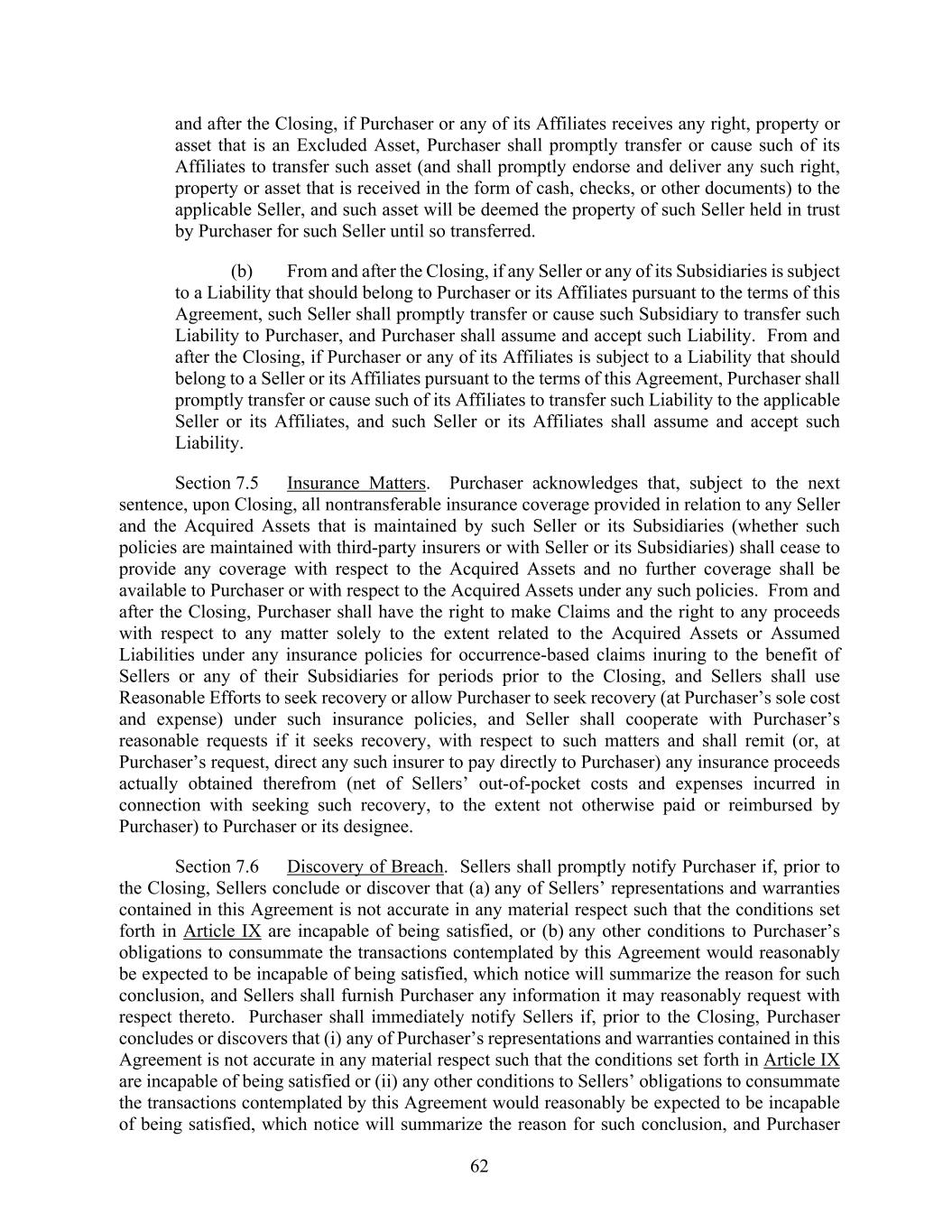 62 and after the Closing, if Purchaser or any of its Affiliates receives any right, property or asset that is an Excluded Asset, Purchaser shall promptly transfer or cause such of its Affiliates to transfer such asset (and shall promptly endorse and deliver any such right, property or asset that is received in the form of cash, checks, or other documents) to the applicable Seller, and such asset will be deemed the property of such Seller held in trust by Purchaser for such Seller until so transferred. (b) From and after the Closing, if any Seller or any of its Subsidiaries is subject to a Liability that should belong to Purchaser or its Affiliates pursuant to the terms of this Agreement, such Seller shall promptly transfer or cause such Subsidiary to transfer such Liability to Purchaser, and Purchaser shall assume and accept such Liability. From and after the Closing, if Purchaser or any of its Affiliates is subject to a Liability that should belong to a Seller or its Affiliates pursuant to the terms of this Agreement, Purchaser shall promptly transfer or cause such of its Affiliates to transfer such Liability to the applicable Seller or its Affiliates, and such Seller or its Affiliates shall assume and accept such Liability. Section 7.5 Insurance Matters. Purchaser acknowledges that, subject to the next sentence, upon Closing, all nontransferable insurance coverage provided in relation to any Seller and the Acquired Assets that is maintained by such Seller or its Subsidiaries (whether such policies are maintained with third-party insurers or with Seller or its Subsidiaries) shall cease to provide any coverage with respect to the Acquired Assets and no further coverage shall be available to Purchaser or with respect to the Acquired Assets under any such policies. From and after the Closing, Purchaser shall have the right to make Claims and the right to any proceeds with respect to any matter solely to the extent related to the Acquired Assets or Assumed Liabilities under any insurance policies for occurrence-based claims inuring to the benefit of Sellers or any of their Subsidiaries for periods prior to the Closing, and Sellers shall use Reasonable Efforts to seek recovery or allow Purchaser to seek recovery (at Purchaser’s sole cost and expense) under such insurance policies, and Seller shall cooperate with Purchaser’s reasonable requests if it seeks recovery, with respect to such matters and shall remit (or, at Purchaser’s request, direct any such insurer to pay directly to Purchaser) any insurance proceeds actually obtained therefrom (net of Sellers’ out-of-pocket costs and expenses incurred in connection with seeking such recovery, to the extent not otherwise paid or reimbursed by Purchaser) to Purchaser or its designee. Section 7.6 Discovery of Breach. Sellers shall promptly notify Purchaser if, prior to the Closing, Sellers conclude or discover that (a) any of Sellers’ representations and warranties contained in this Agreement is not accurate in any material respect such that the conditions set forth in Article IX are incapable of being satisfied, or (b) any other conditions to Purchaser’s obligations to consummate the transactions contemplated by this Agreement would reasonably be expected to be incapable of being satisfied, which notice will summarize the reason for such conclusion, and Sellers shall furnish Purchaser any information it may reasonably request with respect thereto. Purchaser shall immediately notify Sellers if, prior to the Closing, Purchaser concludes or discovers that (i) any of Purchaser’s representations and warranties contained in this Agreement is not accurate in any material respect such that the conditions set forth in Article IX are incapable of being satisfied or (ii) any other conditions to Sellers’ obligations to consummate the transactions contemplated by this Agreement would reasonably be expected to be incapable of being satisfied, which notice will summarize the reason for such conclusion, and Purchaser