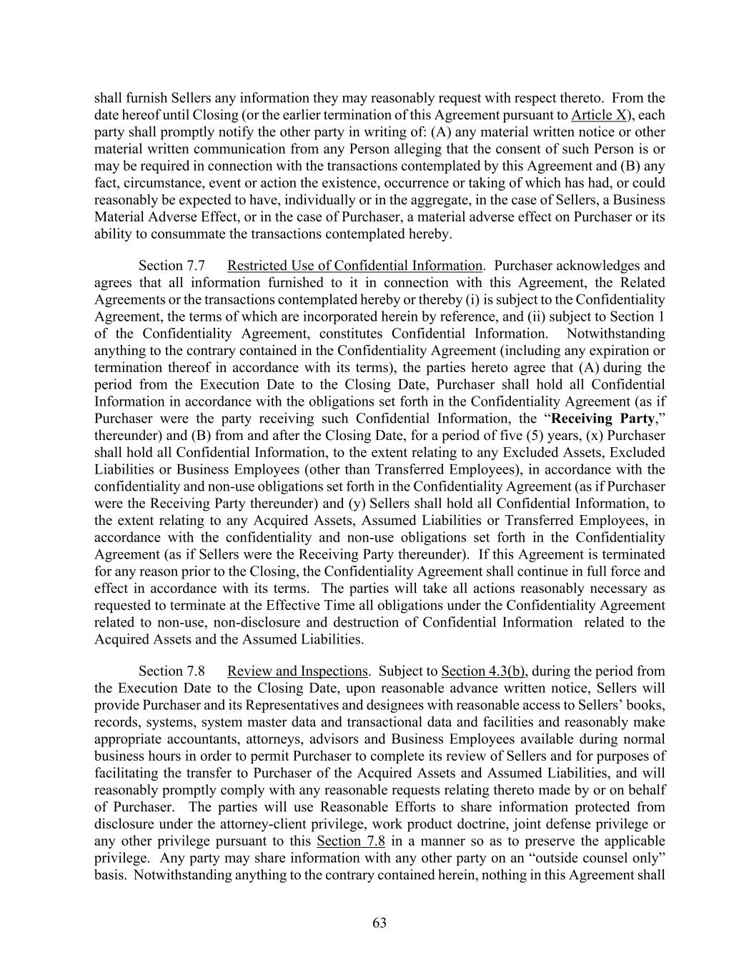 63 shall furnish Sellers any information they may reasonably request with respect thereto. From the date hereof until Closing (or the earlier termination of this Agreement pursuant to Article X), each party shall promptly notify the other party in writing of: (A) any material written notice or other material written communication from any Person alleging that the consent of such Person is or may be required in connection with the transactions contemplated by this Agreement and (B) any fact, circumstance, event or action the existence, occurrence or taking of which has had, or could reasonably be expected to have, individually or in the aggregate, in the case of Sellers, a Business Material Adverse Effect, or in the case of Purchaser, a material adverse effect on Purchaser or its ability to consummate the transactions contemplated hereby. Section 7.7 Restricted Use of Confidential Information. Purchaser acknowledges and agrees that all information furnished to it in connection with this Agreement, the Related Agreements or the transactions contemplated hereby or thereby (i) is subject to the Confidentiality Agreement, the terms of which are incorporated herein by reference, and (ii) subject to Section 1 of the Confidentiality Agreement, constitutes Confidential Information. Notwithstanding anything to the contrary contained in the Confidentiality Agreement (including any expiration or termination thereof in accordance with its terms), the parties hereto agree that (A) during the period from the Execution Date to the Closing Date, Purchaser shall hold all Confidential Information in accordance with the obligations set forth in the Confidentiality Agreement (as if Purchaser were the party receiving such Confidential Information, the “Receiving Party,” thereunder) and (B) from and after the Closing Date, for a period of five (5) years, (x) Purchaser shall hold all Confidential Information, to the extent relating to any Excluded Assets, Excluded Liabilities or Business Employees (other than Transferred Employees), in accordance with the confidentiality and non-use obligations set forth in the Confidentiality Agreement (as if Purchaser were the Receiving Party thereunder) and (y) Sellers shall hold all Confidential Information, to the extent relating to any Acquired Assets, Assumed Liabilities or Transferred Employees, in accordance with the confidentiality and non-use obligations set forth in the Confidentiality Agreement (as if Sellers were the Receiving Party thereunder). If this Agreement is terminated for any reason prior to the Closing, the Confidentiality Agreement shall continue in full force and effect in accordance with its terms. The parties will take all actions reasonably necessary as requested to terminate at the Effective Time all obligations under the Confidentiality Agreement related to non-use, non-disclosure and destruction of Confidential Information related to the Acquired Assets and the Assumed Liabilities. Section 7.8 Review and Inspections. Subject to Section 4.3(b), during the period from the Execution Date to the Closing Date, upon reasonable advance written notice, Sellers will provide Purchaser and its Representatives and designees with reasonable access to Sellers’ books, records, systems, system master data and transactional data and facilities and reasonably make appropriate accountants, attorneys, advisors and Business Employees available during normal business hours in order to permit Purchaser to complete its review of Sellers and for purposes of facilitating the transfer to Purchaser of the Acquired Assets and Assumed Liabilities, and will reasonably promptly comply with any reasonable requests relating thereto made by or on behalf of Purchaser. The parties will use Reasonable Efforts to share information protected from disclosure under the attorney-client privilege, work product doctrine, joint defense privilege or any other privilege pursuant to this Section 7.8 in a manner so as to preserve the applicable privilege. Any party may share information with any other party on an “outside counsel only” basis. Notwithstanding anything to the contrary contained herein, nothing in this Agreement shall