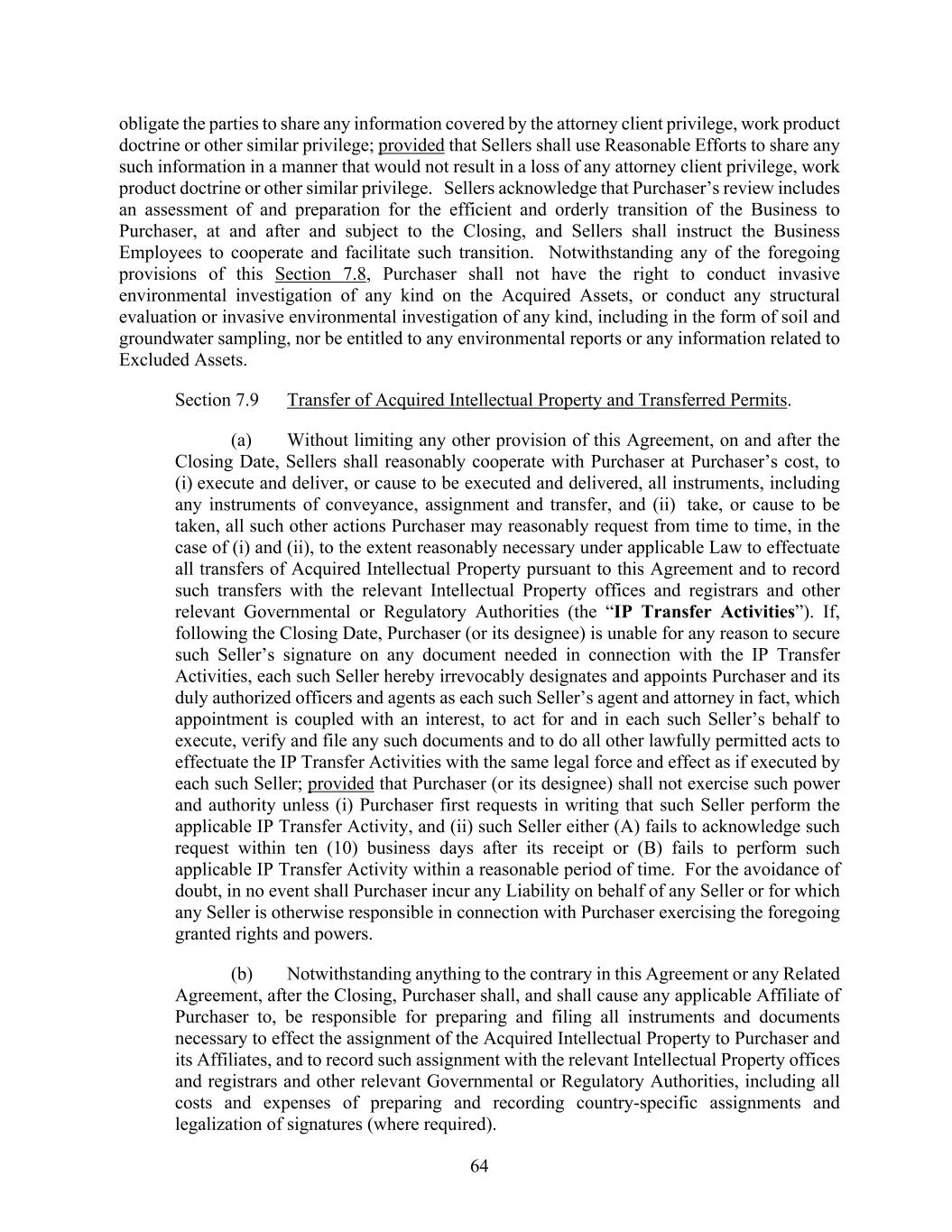 64 obligate the parties to share any information covered by the attorney client privilege, work product doctrine or other similar privilege; provided that Sellers shall use Reasonable Efforts to share any such information in a manner that would not result in a loss of any attorney client privilege, work product doctrine or other similar privilege. Sellers acknowledge that Purchaser’s review includes an assessment of and preparation for the efficient and orderly transition of the Business to Purchaser, at and after and subject to the Closing, and Sellers shall instruct the Business Employees to cooperate and facilitate such transition. Notwithstanding any of the foregoing provisions of this Section 7.8, Purchaser shall not have the right to conduct invasive environmental investigation of any kind on the Acquired Assets, or conduct any structural evaluation or invasive environmental investigation of any kind, including in the form of soil and groundwater sampling, nor be entitled to any environmental reports or any information related to Excluded Assets. Section 7.9 Transfer of Acquired Intellectual Property and Transferred Permits. (a) Without limiting any other provision of this Agreement, on and after the Closing Date, Sellers shall reasonably cooperate with Purchaser at Purchaser’s cost, to (i) execute and deliver, or cause to be executed and delivered, all instruments, including any instruments of conveyance, assignment and transfer, and (ii) take, or cause to be taken, all such other actions Purchaser may reasonably request from time to time, in the case of (i) and (ii), to the extent reasonably necessary under applicable Law to effectuate all transfers of Acquired Intellectual Property pursuant to this Agreement and to record such transfers with the relevant Intellectual Property offices and registrars and other relevant Governmental or Regulatory Authorities (the “IP Transfer Activities”). If, following the Closing Date, Purchaser (or its designee) is unable for any reason to secure such Seller’s signature on any document needed in connection with the IP Transfer Activities, each such Seller hereby irrevocably designates and appoints Purchaser and its duly authorized officers and agents as each such Seller’s agent and attorney in fact, which appointment is coupled with an interest, to act for and in each such Seller’s behalf to execute, verify and file any such documents and to do all other lawfully permitted acts to effectuate the IP Transfer Activities with the same legal force and effect as if executed by each such Seller; provided that Purchaser (or its designee) shall not exercise such power and authority unless (i) Purchaser first requests in writing that such Seller perform the applicable IP Transfer Activity, and (ii) such Seller either (A) fails to acknowledge such request within ten (10) business days after its receipt or (B) fails to perform such applicable IP Transfer Activity within a reasonable period of time. For the avoidance of doubt, in no event shall Purchaser incur any Liability on behalf of any Seller or for which any Seller is otherwise responsible in connection with Purchaser exercising the foregoing granted rights and powers. (b) Notwithstanding anything to the contrary in this Agreement or any Related Agreement, after the Closing, Purchaser shall, and shall cause any applicable Affiliate of Purchaser to, be responsible for preparing and filing all instruments and documents necessary to effect the assignment of the Acquired Intellectual Property to Purchaser and its Affiliates, and to record such assignment with the relevant Intellectual Property offices and registrars and other relevant Governmental or Regulatory Authorities, including all costs and expenses of preparing and recording country-specific assignments and legalization of signatures (where required).
