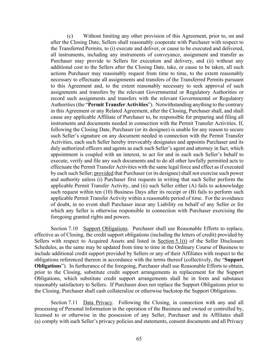 65 (c) Without limiting any other provision of this Agreement, prior to, on and after the Closing Date, Sellers shall reasonably cooperate with Purchaser with respect to the Transferred Permits, to (i) execute and deliver, or cause to be executed and delivered, all instruments, including any instruments of conveyance, assignment and transfer as Purchaser may provide to Sellers for execution and delivery, and (ii) without any additional cost to the Sellers after the Closing Date, take, or cause to be taken, all such actions Purchaser may reasonably request from time to time, to the extent reasonably necessary to effectuate all assignments and transfers of the Transferred Permits pursuant to this Agreement and, to the extent reasonably necessary to seek approval of such assignments and transfers by the relevant Governmental or Regulatory Authorities or record such assignments and transfers with the relevant Governmental or Regulatory Authorities (the “Permit Transfer Activities”). Notwithstanding anything to the contrary in this Agreement or any Related Agreement, after the Closing, Purchaser shall, and shall cause any applicable Affiliate of Purchaser to, be responsible for preparing and filing all instruments and documents needed in connection with the Permit Transfer Activities. If, following the Closing Date, Purchaser (or its designee) is unable for any reason to secure such Seller’s signature on any document needed in connection with the Permit Transfer Activities, each such Seller hereby irrevocably designates and appoints Purchaser and its duly authorized officers and agents as each such Seller’s agent and attorney in fact, which appointment is coupled with an interest, to act for and in each such Seller’s behalf to execute, verify and file any such documents and to do all other lawfully permitted acts to effectuate the Permit Transfer Activities with the same legal force and effect as if executed by each such Seller; provided that Purchaser (or its designee) shall not exercise such power and authority unless (i) Purchaser first requests in writing that such Seller perform the applicable Permit Transfer Activity, and (ii) such Seller either (A) fails to acknowledge such request within ten (10) Business Days after its receipt or (B) fails to perform such applicable Permit Transfer Activity within a reasonable period of time. For the avoidance of doubt, in no event shall Purchaser incur any Liability on behalf of any Seller or for which any Seller is otherwise responsible in connection with Purchaser exercising the foregoing granted rights and powers. Section 7.10 Support Obligations. Purchaser shall use Reasonable Efforts to replace, effective as of Closing, the credit support obligations (including the letters of credit) provided by Sellers with respect to Acquired Assets and listed in Section 5.1(t) of the Seller Disclosure Schedules, as the same may be updated from time to time in the Ordinary Course of Business to include additional credit support provided by Sellers or any of their Affiliates with respect to the obligations referenced thereon in accordance with the terms thereof (collectively, the “Support Obligations”). In furtherance of the foregoing, Purchaser shall use Reasonable Efforts to obtain, prior to the Closing, substitute credit support arrangements in replacement for the Support Obligations, which substitute credit support arrangements shall be in form and substance reasonably satisfactory to Sellers. If Purchaser does not replace the Support Obligations prior to the Closing, Purchaser shall cash collateralize or otherwise backstop the Support Obligations. Section 7.11 Data Privacy. Following the Closing, in connection with any and all processing of Personal Information in the operation of the Business and owned or controlled by, licensed to or otherwise in the possession of any Seller, Purchaser and its Affiliates shall (a) comply with such Seller’s privacy policies and statements, consent documents and all Privacy