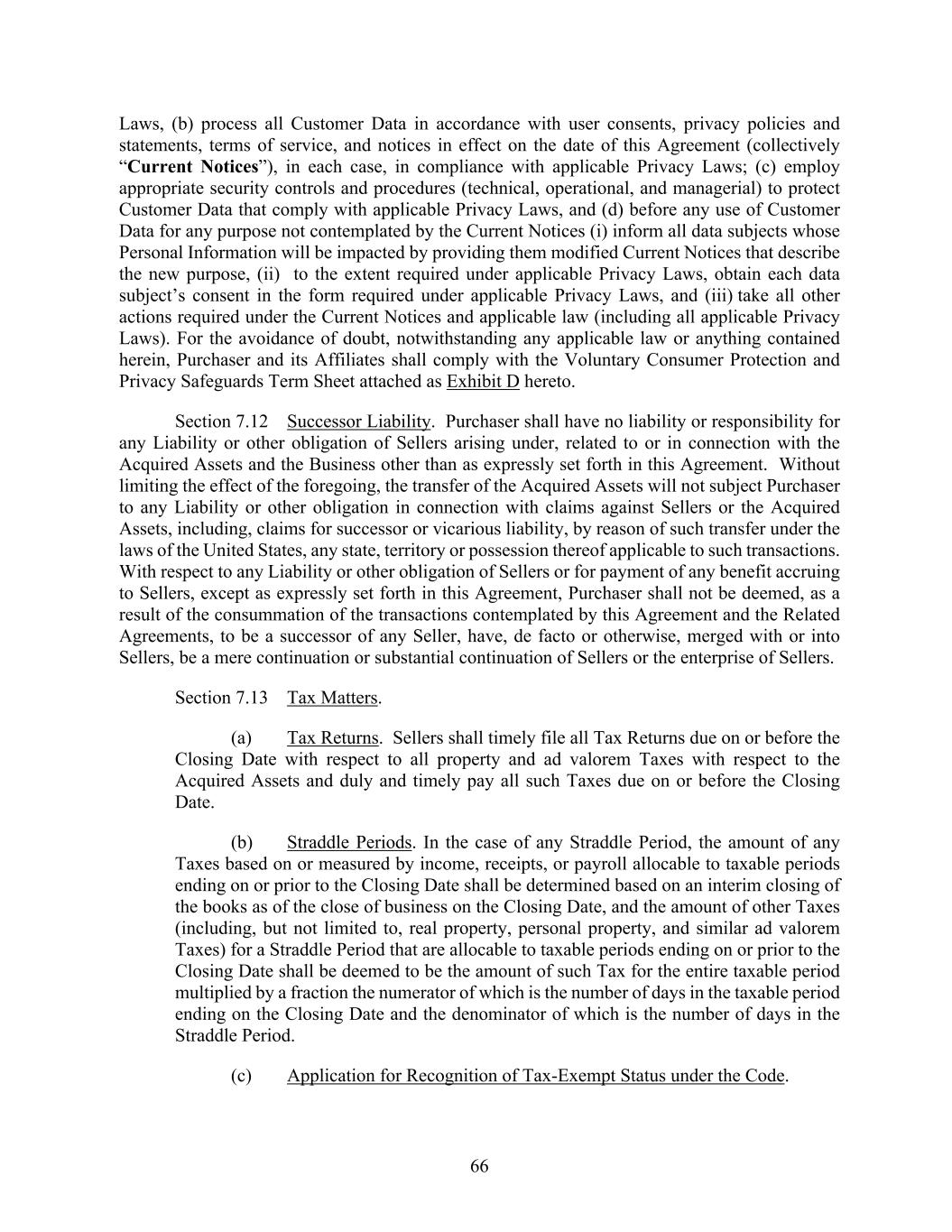 66 Laws, (b) process all Customer Data in accordance with user consents, privacy policies and statements, terms of service, and notices in effect on the date of this Agreement (collectively “Current Notices”), in each case, in compliance with applicable Privacy Laws; (c) employ appropriate security controls and procedures (technical, operational, and managerial) to protect Customer Data that comply with applicable Privacy Laws, and (d) before any use of Customer Data for any purpose not contemplated by the Current Notices (i) inform all data subjects whose Personal Information will be impacted by providing them modified Current Notices that describe the new purpose, (ii) to the extent required under applicable Privacy Laws, obtain each data subject’s consent in the form required under applicable Privacy Laws, and (iii) take all other actions required under the Current Notices and applicable law (including all applicable Privacy Laws). For the avoidance of doubt, notwithstanding any applicable law or anything contained herein, Purchaser and its Affiliates shall comply with the Voluntary Consumer Protection and Privacy Safeguards Term Sheet attached as Exhibit D hereto. Section 7.12 Successor Liability. Purchaser shall have no liability or responsibility for any Liability or other obligation of Sellers arising under, related to or in connection with the Acquired Assets and the Business other than as expressly set forth in this Agreement. Without limiting the effect of the foregoing, the transfer of the Acquired Assets will not subject Purchaser to any Liability or other obligation in connection with claims against Sellers or the Acquired Assets, including, claims for successor or vicarious liability, by reason of such transfer under the laws of the United States, any state, territory or possession thereof applicable to such transactions. With respect to any Liability or other obligation of Sellers or for payment of any benefit accruing to Sellers, except as expressly set forth in this Agreement, Purchaser shall not be deemed, as a result of the consummation of the transactions contemplated by this Agreement and the Related Agreements, to be a successor of any Seller, have, de facto or otherwise, merged with or into Sellers, be a mere continuation or substantial continuation of Sellers or the enterprise of Sellers. Section 7.13 Tax Matters. (a) Tax Returns. Sellers shall timely file all Tax Returns due on or before the Closing Date with respect to all property and ad valorem Taxes with respect to the Acquired Assets and duly and timely pay all such Taxes due on or before the Closing Date. (b) Straddle Periods. In the case of any Straddle Period, the amount of any Taxes based on or measured by income, receipts, or payroll allocable to taxable periods ending on or prior to the Closing Date shall be determined based on an interim closing of the books as of the close of business on the Closing Date, and the amount of other Taxes (including, but not limited to, real property, personal property, and similar ad valorem Taxes) for a Straddle Period that are allocable to taxable periods ending on or prior to the Closing Date shall be deemed to be the amount of such Tax for the entire taxable period multiplied by a fraction the numerator of which is the number of days in the taxable period ending on the Closing Date and the denominator of which is the number of days in the Straddle Period. (c) Application for Recognition of Tax-Exempt Status under the Code.