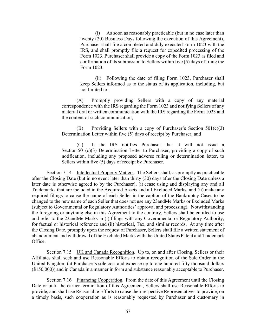 67 (i) As soon as reasonably practicable (but in no case later than twenty (20) Business Days following the execution of this Agreement), Purchaser shall file a completed and duly executed Form 1023 with the IRS, and shall promptly file a request for expedited processing of the Form 1023. Purchaser shall provide a copy of the Form 1023 as filed and confirmation of its submission to Sellers within five (5) days of filing the Form 1023. (ii) Following the date of filing Form 1023, Purchaser shall keep Sellers informed as to the status of its application, including, but not limited to: (A) Promptly providing Sellers with a copy of any material correspondence with the IRS regarding the Form 1023 and notifying Sellers of any material oral or written communication with the IRS regarding the Form 1023 and the content of such communication; (B) Providing Sellers with a copy of Purchaser’s Section 501(c)(3) Determination Letter within five (5) days of receipt by Purchaser; and (C) If the IRS notifies Purchaser that it will not issue a Section 501(c)(3) Determination Letter to Purchaser, providing a copy of such notification, including any proposed adverse ruling or determination letter, to Sellers within five (5) days of receipt by Purchaser. Section 7.14 Intellectual Property Matters. The Sellers shall, as promptly as practicable after the Closing Date (but in no event later than thirty (30) days after the Closing Date unless a later date is otherwise agreed to by the Purchaser), (i) cease using and displaying any and all Trademarks that are included in the Acquired Assets and all Excluded Marks, and (ii) make any required filings to cause the name of each Seller in the caption of the Bankruptcy Cases to be changed to the new name of each Seller that does not use any 23andMe Marks or Excluded Marks (subject to Governmental or Regulatory Authorities’ approval and processing). Notwithstanding the foregoing or anything else in this Agreement to the contrary, Sellers shall be entitled to use and refer to the 23andMe Marks in (i) filings with any Governmental or Regulatory Authority, for factual or historical reference and (ii) historical, Tax, and similar records. At any time after the Closing Date, promptly upon the request of Purchaser, Sellers shall file a written statement of abandonment and withdrawal of the Excluded Marks with the United States Patent and Trademark Office. Section 7.15 UK and Canada Recognition. Up to, on and after Closing, Sellers or their Affiliates shall seek and use Reasonable Efforts to obtain recognition of the Sale Order in the United Kingdom (at Purchaser’s sole cost and expense up to one hundred fifty thousand dollars ($150,000)) and in Canada in a manner in form and substance reasonably acceptable to Purchaser. Section 7.16 Financing Cooperation. From the date of this Agreement until the Closing Date or until the earlier termination of this Agreement, Sellers shall use Reasonable Efforts to provide, and shall use Reasonable Efforts to cause their respective Representatives to provide, on a timely basis, such cooperation as is reasonably requested by Purchaser and customary in