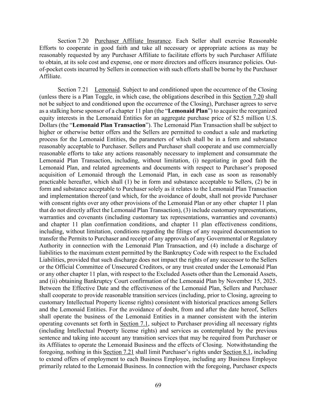69 Section 7.20 Purchaser Affiliate Insurance. Each Seller shall exercise Reasonable Efforts to cooperate in good faith and take all necessary or appropriate actions as may be reasonably requested by any Purchaser Affiliate to facilitate efforts by such Purchaser Affiliate to obtain, at its sole cost and expense, one or more directors and officers insurance policies. Out- of-pocket costs incurred by Sellers in connection with such efforts shall be borne by the Purchaser Affiliate. Section 7.21 Lemonaid. Subject to and conditioned upon the occurrence of the Closing (unless there is a Plan Toggle, in which case, the obligations described in this Section 7.20 shall not be subject to and conditioned upon the occurrence of the Closing), Purchaser agrees to serve as a stalking horse sponsor of a chapter 11 plan (the “Lemonaid Plan”) to acquire the reorganized equity interests in the Lemonaid Entities for an aggregate purchase price of $2.5 million U.S. Dollars (the “Lemonaid Plan Transaction”). The Lemonaid Plan Transaction shall be subject to higher or otherwise better offers and the Sellers are permitted to conduct a sale and marketing process for the Lemonaid Entities, the parameters of which shall be in a form and substance reasonably acceptable to Purchaser. Sellers and Purchaser shall cooperate and use commercially reasonable efforts to take any actions reasonably necessary to implement and consummate the Lemonaid Plan Transaction, including, without limitation, (i) negotiating in good faith the Lemonaid Plan, and related agreements and documents with respect to Purchaser’s proposed acquisition of Lemonaid through the Lemonaid Plan, in each case as soon as reasonably practicable hereafter, which shall (1) be in form and substance acceptable to Sellers, (2) be in form and substance acceptable to Purchaser solely as it relates to the Lemonaid Plan Transaction and implementation thereof (and which, for the avoidance of doubt, shall not provide Purchaser with consent rights over any other provisions of the Lemonaid Plan or any other chapter 11 plan that do not directly affect the Lemonaid Plan Transaction), (3) include customary representations, warranties and covenants (including customary tax representations, warranties and covenants) and chapter 11 plan confirmation conditions, and chapter 11 plan effectiveness conditions, including, without limitation, conditions regarding the filings of any required documentation to transfer the Permits to Purchaser and receipt of any approvals of any Governmental or Regulatory Authority in connection with the Lemonaid Plan Transaction, and (4) include a discharge of liabilities to the maximum extent permitted by the Bankruptcy Code with respect to the Excluded Liabilities, provided that such discharge does not impact the rights of any successor to the Sellers or the Official Committee of Unsecured Creditors, or any trust created under the Lemonaid Plan or any other chapter 11 plan, with respect to the Excluded Assets other than the Lemonaid Assets, and (ii) obtaining Bankruptcy Court confirmation of the Lemonaid Plan by November 15, 2025. Between the Effective Date and the effectiveness of the Lemonaid Plan, Sellers and Purchaser shall cooperate to provide reasonable transition services (including, prior to Closing, agreeing to customary Intellectual Property license rights) consistent with historical practices among Sellers and the Lemonaid Entities. For the avoidance of doubt, from and after the date hereof, Sellers shall operate the business of the Lemonaid Entities in a manner consistent with the interim operating covenants set forth in Section 7.1, subject to Purchaser providing all necessary rights (including Intellectual Property license rights) and services as contemplated by the previous sentence and taking into account any transition services that may be required from Purchaser or its Affiliates to operate the Lemonaid Business and the effects of Closing. Notwithstanding the foregoing, nothing in this Section 7.21 shall limit Purchaser’s rights under Section 8.1, including to extend offers of employment to each Business Employee, including any Business Employee primarily related to the Lemonaid Business. In connection with the foregoing, Purchaser expects