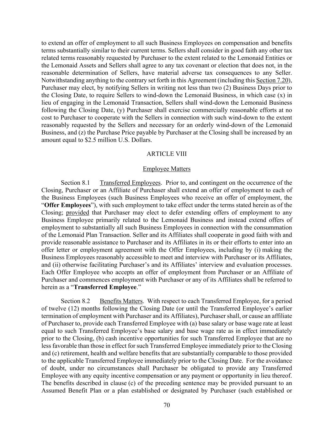 70 to extend an offer of employment to all such Business Employees on compensation and benefits terms substantially similar to their current terms. Sellers shall consider in good faith any other tax related terms reasonably requested by Purchaser to the extent related to the Lemonaid Entities or the Lemonaid Assets and Sellers shall agree to any tax covenant or election that does not, in the reasonable determination of Sellers, have material adverse tax consequences to any Seller. Notwithstanding anything to the contrary set forth in this Agreement (including this Section 7.20), Purchaser may elect, by notifying Sellers in writing not less than two (2) Business Days prior to the Closing Date, to require Sellers to wind-down the Lemonaid Business, in which case (x) in lieu of engaging in the Lemonaid Transaction, Sellers shall wind-down the Lemonaid Business following the Closing Date, (y) Purchaser shall exercise commercially reasonable efforts at no cost to Purchaser to cooperate with the Sellers in connection with such wind-down to the extent reasonably requested by the Sellers and necessary for an orderly wind-down of the Lemonaid Business, and (z) the Purchase Price payable by Purchaser at the Closing shall be increased by an amount equal to $2.5 million U.S. Dollars. ARTICLE VIII Employee Matters Section 8.1 Transferred Employees. Prior to, and contingent on the occurrence of the Closing, Purchaser or an Affiliate of Purchaser shall extend an offer of employment to each of the Business Employees (such Business Employees who receive an offer of employment, the “Offer Employees”), with such employment to take effect under the terms stated herein as of the Closing; provided that Purchaser may elect to defer extending offers of employment to any Business Employee primarily related to the Lemonaid Business and instead extend offers of employment to substantially all such Business Employees in connection with the consummation of the Lemonaid Plan Transaction. Seller and its Affiliates shall cooperate in good faith with and provide reasonable assistance to Purchaser and its Affiliates in its or their efforts to enter into an offer letter or employment agreement with the Offer Employees, including by (i) making the Business Employees reasonably accessible to meet and interview with Purchaser or its Affiliates, and (ii) otherwise facilitating Purchaser’s and its Affiliates’ interview and evaluation processes. Each Offer Employee who accepts an offer of employment from Purchaser or an Affiliate of Purchaser and commences employment with Purchaser or any of its Affiliates shall be referred to herein as a “Transferred Employee.” Section 8.2 Benefits Matters. With respect to each Transferred Employee, for a period of twelve (12) months following the Closing Date (or until the Transferred Employee’s earlier termination of employment with Purchaser and its Affiliates), Purchaser shall, or cause an affiliate of Purchaser to, provide each Transferred Employee with (a) base salary or base wage rate at least equal to such Transferred Employee’s base salary and base wage rate as in effect immediately prior to the Closing, (b) cash incentive opportunities for such Transferred Employee that are no less favorable than those in effect for such Transferred Employee immediately prior to the Closing and (c) retirement, health and welfare benefits that are substantially comparable to those provided to the applicable Transferred Employee immediately prior to the Closing Date. For the avoidance of doubt, under no circumstances shall Purchaser be obligated to provide any Transferred Employee with any equity incentive compensation or any payment or opportunity in lieu thereof. The benefits described in clause (c) of the preceding sentence may be provided pursuant to an Assumed Benefit Plan or a plan established or designated by Purchaser (such established or