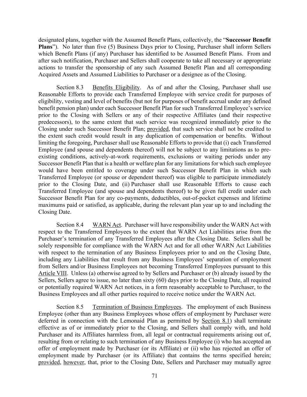 71 designated plans, together with the Assumed Benefit Plans, collectively, the “Successor Benefit Plans”). No later than five (5) Business Days prior to Closing, Purchaser shall inform Sellers which Benefit Plans (if any) Purchaser has identified to be Assumed Benefit Plans. From and after such notification, Purchaser and Sellers shall cooperate to take all necessary or appropriate actions to transfer the sponsorship of any such Assumed Benefit Plan and all corresponding Acquired Assets and Assumed Liabilities to Purchaser or a designee as of the Closing. Section 8.3 Benefits Eligibility. As of and after the Closing, Purchaser shall use Reasonable Efforts to provide each Transferred Employee with service credit for purposes of eligibility, vesting and level of benefits (but not for purposes of benefit accrual under any defined benefit pension plan) under each Successor Benefit Plan for such Transferred Employee’s service prior to the Closing with Sellers or any of their respective Affiliates (and their respective predecessors), to the same extent that such service was recognized immediately prior to the Closing under such Successor Benefit Plan; provided, that such service shall not be credited to the extent such credit would result in any duplication of compensation or benefits. Without limiting the foregoing, Purchaser shall use Reasonable Efforts to provide that (i) each Transferred Employee (and spouse and dependents thereof) will not be subject to any limitations as to pre- existing conditions, actively-at-work requirements, exclusions or waiting periods under any Successor Benefit Plan that is a health or welfare plan for any limitations for which such employee would have been entitled to coverage under such Successor Benefit Plan in which such Transferred Employee (or spouse or dependent thereof) was eligible to participate immediately prior to the Closing Date, and (ii) Purchaser shall use Reasonable Efforts to cause each Transferred Employee (and spouse and dependents thereof) to be given full credit under each Successor Benefit Plan for any co-payments, deductibles, out-of-pocket expenses and lifetime maximums paid or satisfied, as applicable, during the relevant plan year up to and including the Closing Date. Section 8.4 WARN Act. Purchaser will have responsibility under the WARN Act with respect to the Transferred Employees to the extent that WARN Act Liabilities arise from the Purchaser’s termination of any Transferred Employees after the Closing Date. Sellers shall be solely responsible for compliance with the WARN Act and for all other WARN Act Liabilities with respect to the termination of any Business Employees prior to and on the Closing Date, including any Liabilities that result from any Business Employees’ separation of employment from Sellers and/or Business Employees not becoming Transferred Employees pursuant to this Article VIII. Unless (a) otherwise agreed to by Sellers and Purchaser or (b) already issued by the Sellers, Sellers agree to issue, no later than sixty (60) days prior to the Closing Date, all required or potentially required WARN Act notices, in a form reasonably acceptable to Purchaser, to the Business Employees and all other parties required to receive notice under the WARN Act. Section 8.5 Termination of Business Employees. The employment of each Business Employee (other than any Business Employees whose offers of employment by Purchaser were deferred in connection with the Lemonaid Plan as permitted by Section 8.1) shall terminate effective as of or immediately prior to the Closing, and Sellers shall comply with, and hold Purchaser and its Affiliates harmless from, all legal or contractual requirements arising out of, resulting from or relating to such termination of any Business Employee (i) who has accepted an offer of employment made by Purchaser (or its Affiliate) or (ii) who has rejected an offer of employment made by Purchaser (or its Affiliate) that contains the terms specified herein; provided, however, that, prior to the Closing Date, Sellers and Purchaser may mutually agree