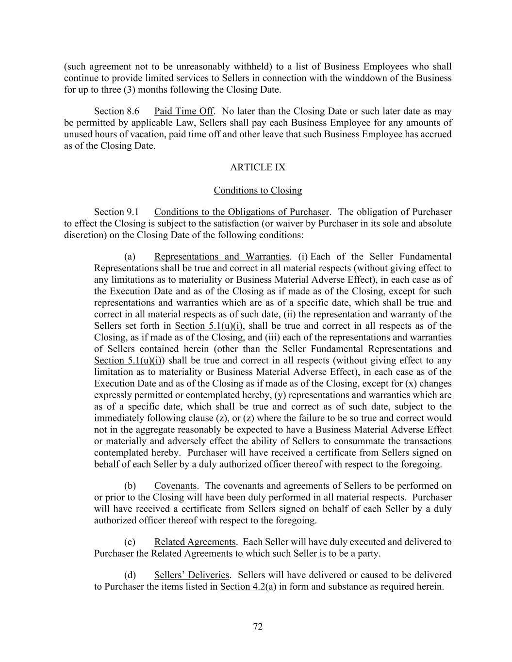 72 (such agreement not to be unreasonably withheld) to a list of Business Employees who shall continue to provide limited services to Sellers in connection with the winddown of the Business for up to three (3) months following the Closing Date. Section 8.6 Paid Time Off. No later than the Closing Date or such later date as may be permitted by applicable Law, Sellers shall pay each Business Employee for any amounts of unused hours of vacation, paid time off and other leave that such Business Employee has accrued as of the Closing Date. ARTICLE IX Conditions to Closing Section 9.1 Conditions to the Obligations of Purchaser. The obligation of Purchaser to effect the Closing is subject to the satisfaction (or waiver by Purchaser in its sole and absolute discretion) on the Closing Date of the following conditions: (a) Representations and Warranties. (i) Each of the Seller Fundamental Representations shall be true and correct in all material respects (without giving effect to any limitations as to materiality or Business Material Adverse Effect), in each case as of the Execution Date and as of the Closing as if made as of the Closing, except for such representations and warranties which are as of a specific date, which shall be true and correct in all material respects as of such date, (ii) the representation and warranty of the Sellers set forth in Section 5.1(u)(i), shall be true and correct in all respects as of the Closing, as if made as of the Closing, and (iii) each of the representations and warranties of Sellers contained herein (other than the Seller Fundamental Representations and Section 5.1(u)(i)) shall be true and correct in all respects (without giving effect to any limitation as to materiality or Business Material Adverse Effect), in each case as of the Execution Date and as of the Closing as if made as of the Closing, except for (x) changes expressly permitted or contemplated hereby, (y) representations and warranties which are as of a specific date, which shall be true and correct as of such date, subject to the immediately following clause (z), or (z) where the failure to be so true and correct would not in the aggregate reasonably be expected to have a Business Material Adverse Effect or materially and adversely effect the ability of Sellers to consummate the transactions contemplated hereby. Purchaser will have received a certificate from Sellers signed on behalf of each Seller by a duly authorized officer thereof with respect to the foregoing. (b) Covenants. The covenants and agreements of Sellers to be performed on or prior to the Closing will have been duly performed in all material respects. Purchaser will have received a certificate from Sellers signed on behalf of each Seller by a duly authorized officer thereof with respect to the foregoing. (c) Related Agreements. Each Seller will have duly executed and delivered to Purchaser the Related Agreements to which such Seller is to be a party. (d) Sellers’ Deliveries. Sellers will have delivered or caused to be delivered to Purchaser the items listed in Section 4.2(a) in form and substance as required herein.