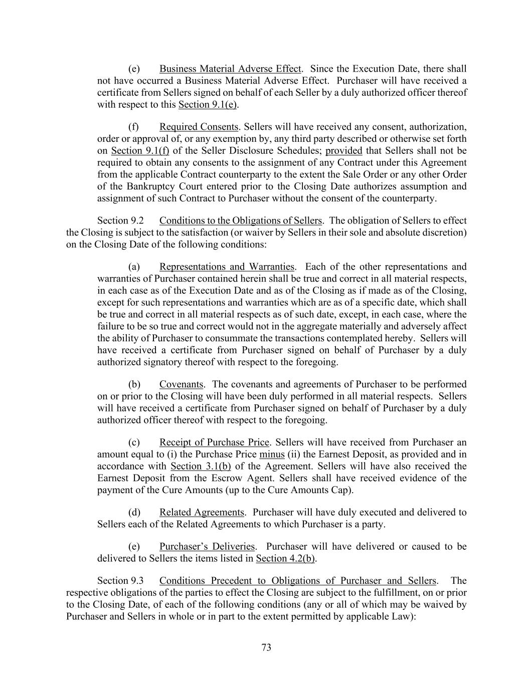 73 (e) Business Material Adverse Effect. Since the Execution Date, there shall not have occurred a Business Material Adverse Effect. Purchaser will have received a certificate from Sellers signed on behalf of each Seller by a duly authorized officer thereof with respect to this Section 9.1(e). (f) Required Consents. Sellers will have received any consent, authorization, order or approval of, or any exemption by, any third party described or otherwise set forth on Section 9.1(f) of the Seller Disclosure Schedules; provided that Sellers shall not be required to obtain any consents to the assignment of any Contract under this Agreement from the applicable Contract counterparty to the extent the Sale Order or any other Order of the Bankruptcy Court entered prior to the Closing Date authorizes assumption and assignment of such Contract to Purchaser without the consent of the counterparty. Section 9.2 Conditions to the Obligations of Sellers. The obligation of Sellers to effect the Closing is subject to the satisfaction (or waiver by Sellers in their sole and absolute discretion) on the Closing Date of the following conditions: (a) Representations and Warranties. Each of the other representations and warranties of Purchaser contained herein shall be true and correct in all material respects, in each case as of the Execution Date and as of the Closing as if made as of the Closing, except for such representations and warranties which are as of a specific date, which shall be true and correct in all material respects as of such date, except, in each case, where the failure to be so true and correct would not in the aggregate materially and adversely affect the ability of Purchaser to consummate the transactions contemplated hereby. Sellers will have received a certificate from Purchaser signed on behalf of Purchaser by a duly authorized signatory thereof with respect to the foregoing. (b) Covenants. The covenants and agreements of Purchaser to be performed on or prior to the Closing will have been duly performed in all material respects. Sellers will have received a certificate from Purchaser signed on behalf of Purchaser by a duly authorized officer thereof with respect to the foregoing. (c) Receipt of Purchase Price. Sellers will have received from Purchaser an amount equal to (i) the Purchase Price minus (ii) the Earnest Deposit, as provided and in accordance with Section 3.1(b) of the Agreement. Sellers will have also received the Earnest Deposit from the Escrow Agent. Sellers shall have received evidence of the payment of the Cure Amounts (up to the Cure Amounts Cap). (d) Related Agreements. Purchaser will have duly executed and delivered to Sellers each of the Related Agreements to which Purchaser is a party. (e) Purchaser’s Deliveries. Purchaser will have delivered or caused to be delivered to Sellers the items listed in Section 4.2(b). Section 9.3 Conditions Precedent to Obligations of Purchaser and Sellers. The respective obligations of the parties to effect the Closing are subject to the fulfillment, on or prior to the Closing Date, of each of the following conditions (any or all of which may be waived by Purchaser and Sellers in whole or in part to the extent permitted by applicable Law):