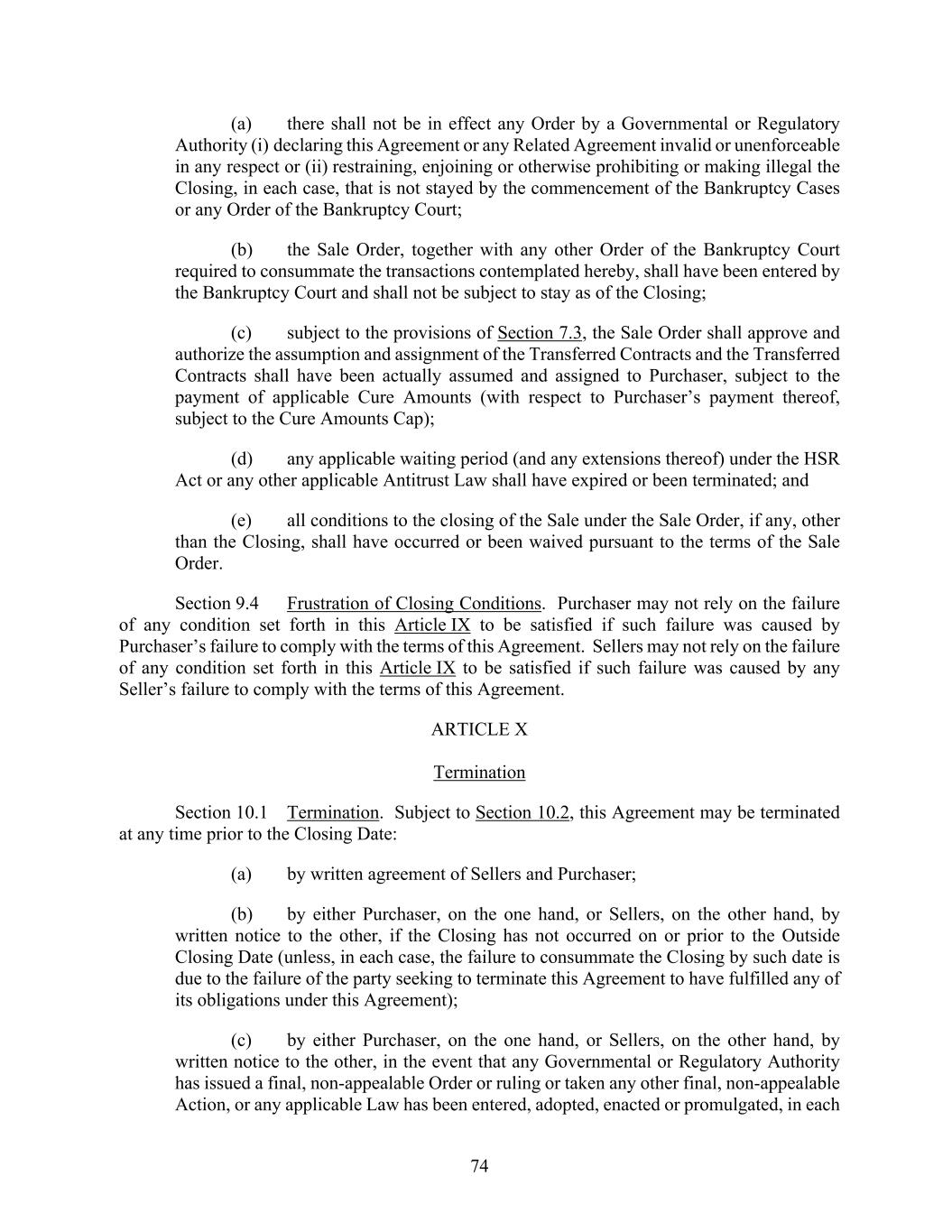 74 (a) there shall not be in effect any Order by a Governmental or Regulatory Authority (i) declaring this Agreement or any Related Agreement invalid or unenforceable in any respect or (ii) restraining, enjoining or otherwise prohibiting or making illegal the Closing, in each case, that is not stayed by the commencement of the Bankruptcy Cases or any Order of the Bankruptcy Court; (b) the Sale Order, together with any other Order of the Bankruptcy Court required to consummate the transactions contemplated hereby, shall have been entered by the Bankruptcy Court and shall not be subject to stay as of the Closing; (c) subject to the provisions of Section 7.3, the Sale Order shall approve and authorize the assumption and assignment of the Transferred Contracts and the Transferred Contracts shall have been actually assumed and assigned to Purchaser, subject to the payment of applicable Cure Amounts (with respect to Purchaser’s payment thereof, subject to the Cure Amounts Cap); (d) any applicable waiting period (and any extensions thereof) under the HSR Act or any other applicable Antitrust Law shall have expired or been terminated; and (e) all conditions to the closing of the Sale under the Sale Order, if any, other than the Closing, shall have occurred or been waived pursuant to the terms of the Sale Order. Section 9.4 Frustration of Closing Conditions. Purchaser may not rely on the failure of any condition set forth in this Article IX to be satisfied if such failure was caused by Purchaser’s failure to comply with the terms of this Agreement. Sellers may not rely on the failure of any condition set forth in this Article IX to be satisfied if such failure was caused by any Seller’s failure to comply with the terms of this Agreement. ARTICLE X Termination Section 10.1 Termination. Subject to Section 10.2, this Agreement may be terminated at any time prior to the Closing Date: (a) by written agreement of Sellers and Purchaser; (b) by either Purchaser, on the one hand, or Sellers, on the other hand, by written notice to the other, if the Closing has not occurred on or prior to the Outside Closing Date (unless, in each case, the failure to consummate the Closing by such date is due to the failure of the party seeking to terminate this Agreement to have fulfilled any of its obligations under this Agreement); (c) by either Purchaser, on the one hand, or Sellers, on the other hand, by written notice to the other, in the event that any Governmental or Regulatory Authority has issued a final, non-appealable Order or ruling or taken any other final, non-appealable Action, or any applicable Law has been entered, adopted, enacted or promulgated, in each