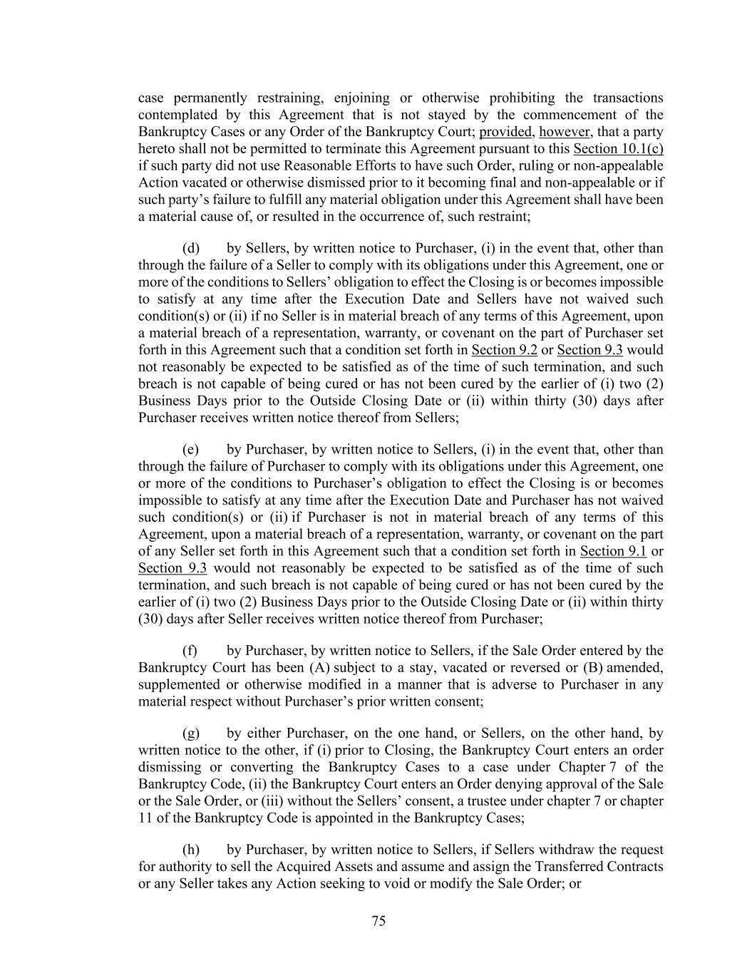 75 case permanently restraining, enjoining or otherwise prohibiting the transactions contemplated by this Agreement that is not stayed by the commencement of the Bankruptcy Cases or any Order of the Bankruptcy Court; provided, however, that a party hereto shall not be permitted to terminate this Agreement pursuant to this Section 10.1(c) if such party did not use Reasonable Efforts to have such Order, ruling or non-appealable Action vacated or otherwise dismissed prior to it becoming final and non-appealable or if such party’s failure to fulfill any material obligation under this Agreement shall have been a material cause of, or resulted in the occurrence of, such restraint; (d) by Sellers, by written notice to Purchaser, (i) in the event that, other than through the failure of a Seller to comply with its obligations under this Agreement, one or more of the conditions to Sellers’ obligation to effect the Closing is or becomes impossible to satisfy at any time after the Execution Date and Sellers have not waived such condition(s) or (ii) if no Seller is in material breach of any terms of this Agreement, upon a material breach of a representation, warranty, or covenant on the part of Purchaser set forth in this Agreement such that a condition set forth in Section 9.2 or Section 9.3 would not reasonably be expected to be satisfied as of the time of such termination, and such breach is not capable of being cured or has not been cured by the earlier of (i) two (2) Business Days prior to the Outside Closing Date or (ii) within thirty (30) days after Purchaser receives written notice thereof from Sellers; (e) by Purchaser, by written notice to Sellers, (i) in the event that, other than through the failure of Purchaser to comply with its obligations under this Agreement, one or more of the conditions to Purchaser’s obligation to effect the Closing is or becomes impossible to satisfy at any time after the Execution Date and Purchaser has not waived such condition(s) or (ii) if Purchaser is not in material breach of any terms of this Agreement, upon a material breach of a representation, warranty, or covenant on the part of any Seller set forth in this Agreement such that a condition set forth in Section 9.1 or Section 9.3 would not reasonably be expected to be satisfied as of the time of such termination, and such breach is not capable of being cured or has not been cured by the earlier of (i) two (2) Business Days prior to the Outside Closing Date or (ii) within thirty (30) days after Seller receives written notice thereof from Purchaser; (f) by Purchaser, by written notice to Sellers, if the Sale Order entered by the Bankruptcy Court has been (A) subject to a stay, vacated or reversed or (B) amended, supplemented or otherwise modified in a manner that is adverse to Purchaser in any material respect without Purchaser’s prior written consent; (g) by either Purchaser, on the one hand, or Sellers, on the other hand, by written notice to the other, if (i) prior to Closing, the Bankruptcy Court enters an order dismissing or converting the Bankruptcy Cases to a case under Chapter 7 of the Bankruptcy Code, (ii) the Bankruptcy Court enters an Order denying approval of the Sale or the Sale Order, or (iii) without the Sellers’ consent, a trustee under chapter 7 or chapter 11 of the Bankruptcy Code is appointed in the Bankruptcy Cases; (h) by Purchaser, by written notice to Sellers, if Sellers withdraw the request for authority to sell the Acquired Assets and assume and assign the Transferred Contracts or any Seller takes any Action seeking to void or modify the Sale Order; or