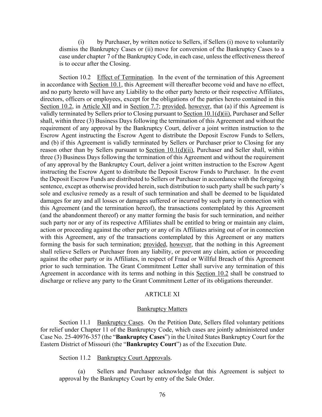 76 (i) by Purchaser, by written notice to Sellers, if Sellers (i) move to voluntarily dismiss the Bankruptcy Cases or (ii) move for conversion of the Bankruptcy Cases to a case under chapter 7 of the Bankruptcy Code, in each case, unless the effectiveness thereof is to occur after the Closing. Section 10.2 Effect of Termination. In the event of the termination of this Agreement in accordance with Section 10.1, this Agreement will thereafter become void and have no effect, and no party hereto will have any Liability to the other party hereto or their respective Affiliates, directors, officers or employees, except for the obligations of the parties hereto contained in this Section 10.2, in Article XII and in Section 7.7; provided, however, that (a) if this Agreement is validly terminated by Sellers prior to Closing pursuant to Section 10.1(d)(ii), Purchaser and Seller shall, within three (3) Business Days following the termination of this Agreement and without the requirement of any approval by the Bankruptcy Court, deliver a joint written instruction to the Escrow Agent instructing the Escrow Agent to distribute the Deposit Escrow Funds to Sellers, and (b) if this Agreement is validly terminated by Sellers or Purchaser prior to Closing for any reason other than by Sellers pursuant to Section 10.1(d)(ii), Purchaser and Seller shall, within three (3) Business Days following the termination of this Agreement and without the requirement of any approval by the Bankruptcy Court, deliver a joint written instruction to the Escrow Agent instructing the Escrow Agent to distribute the Deposit Escrow Funds to Purchaser. In the event the Deposit Escrow Funds are distributed to Sellers or Purchaser in accordance with the foregoing sentence, except as otherwise provided herein, such distribution to such party shall be such party’s sole and exclusive remedy as a result of such termination and shall be deemed to be liquidated damages for any and all losses or damages suffered or incurred by such party in connection with this Agreement (and the termination hereof), the transactions contemplated by this Agreement (and the abandonment thereof) or any matter forming the basis for such termination, and neither such party nor or any of its respective Affiliates shall be entitled to bring or maintain any claim, action or proceeding against the other party or any of its Affiliates arising out of or in connection with this Agreement, any of the transactions contemplated by this Agreement or any matters forming the basis for such termination; provided, however, that the nothing in this Agreement shall relieve Sellers or Purchaser from any liability, or prevent any claim, action or proceeding against the other party or its Affiliates, in respect of Fraud or Willful Breach of this Agreement prior to such termination. The Grant Commitment Letter shall survive any termination of this Agreement in accordance with its terms and nothing in this Section 10.2 shall be construed to discharge or relieve any party to the Grant Commitment Letter of its obligations thereunder. ARTICLE XI Bankruptcy Matters Section 11.1 Bankruptcy Cases. On the Petition Date, Sellers filed voluntary petitions for relief under Chapter 11 of the Bankruptcy Code, which cases are jointly administered under Case No. 25-40976-357 (the “Bankruptcy Cases”) in the United States Bankruptcy Court for the Eastern District of Missouri (the “Bankruptcy Court”) as of the Execution Date. Section 11.2 Bankruptcy Court Approvals. (a) Sellers and Purchaser acknowledge that this Agreement is subject to approval by the Bankruptcy Court by entry of the Sale Order.