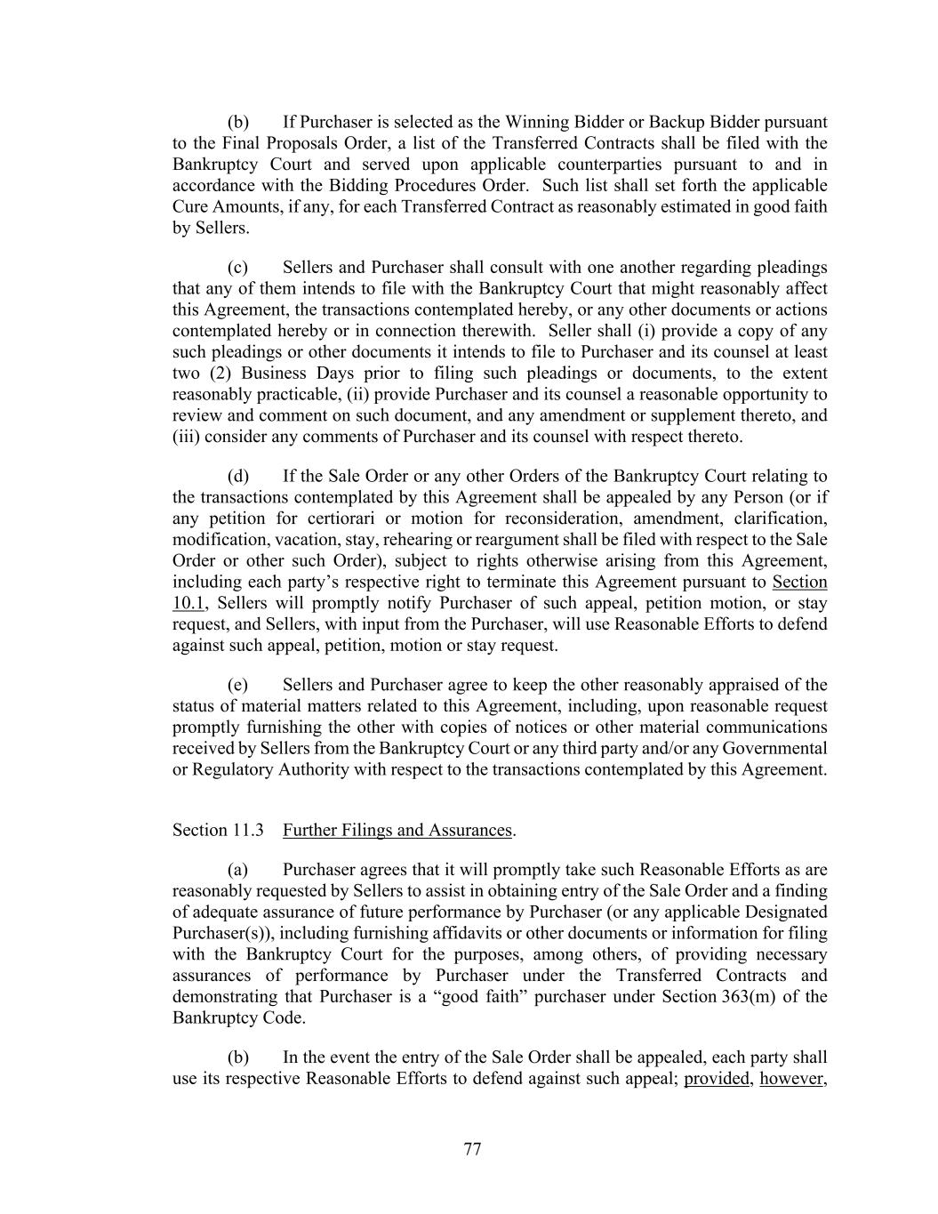 77 (b) If Purchaser is selected as the Winning Bidder or Backup Bidder pursuant to the Final Proposals Order, a list of the Transferred Contracts shall be filed with the Bankruptcy Court and served upon applicable counterparties pursuant to and in accordance with the Bidding Procedures Order. Such list shall set forth the applicable Cure Amounts, if any, for each Transferred Contract as reasonably estimated in good faith by Sellers. (c) Sellers and Purchaser shall consult with one another regarding pleadings that any of them intends to file with the Bankruptcy Court that might reasonably affect this Agreement, the transactions contemplated hereby, or any other documents or actions contemplated hereby or in connection therewith. Seller shall (i) provide a copy of any such pleadings or other documents it intends to file to Purchaser and its counsel at least two (2) Business Days prior to filing such pleadings or documents, to the extent reasonably practicable, (ii) provide Purchaser and its counsel a reasonable opportunity to review and comment on such document, and any amendment or supplement thereto, and (iii) consider any comments of Purchaser and its counsel with respect thereto. (d) If the Sale Order or any other Orders of the Bankruptcy Court relating to the transactions contemplated by this Agreement shall be appealed by any Person (or if any petition for certiorari or motion for reconsideration, amendment, clarification, modification, vacation, stay, rehearing or reargument shall be filed with respect to the Sale Order or other such Order), subject to rights otherwise arising from this Agreement, including each party’s respective right to terminate this Agreement pursuant to Section 10.1, Sellers will promptly notify Purchaser of such appeal, petition motion, or stay request, and Sellers, with input from the Purchaser, will use Reasonable Efforts to defend against such appeal, petition, motion or stay request. (e) Sellers and Purchaser agree to keep the other reasonably appraised of the status of material matters related to this Agreement, including, upon reasonable request promptly furnishing the other with copies of notices or other material communications received by Sellers from the Bankruptcy Court or any third party and/or any Governmental or Regulatory Authority with respect to the transactions contemplated by this Agreement. Section 11.3 Further Filings and Assurances. (a) Purchaser agrees that it will promptly take such Reasonable Efforts as are reasonably requested by Sellers to assist in obtaining entry of the Sale Order and a finding of adequate assurance of future performance by Purchaser (or any applicable Designated Purchaser(s)), including furnishing affidavits or other documents or information for filing with the Bankruptcy Court for the purposes, among others, of providing necessary assurances of performance by Purchaser under the Transferred Contracts and demonstrating that Purchaser is a “good faith” purchaser under Section 363(m) of the Bankruptcy Code. (b) In the event the entry of the Sale Order shall be appealed, each party shall use its respective Reasonable Efforts to defend against such appeal; provided, however,