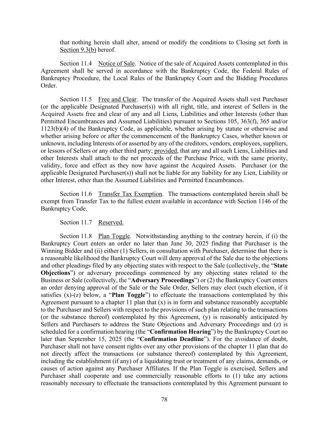 78 that nothing herein shall alter, amend or modify the conditions to Closing set forth in Section 9.3(b) hereof. Section 11.4 Notice of Sale. Notice of the sale of Acquired Assets contemplated in this Agreement shall be served in accordance with the Bankruptcy Code, the Federal Rules of Bankruptcy Procedure, the Local Rules of the Bankruptcy Court and the Bidding Procedures Order. Section 11.5 Free and Clear. The transfer of the Acquired Assets shall vest Purchaser (or the applicable Designated Purchaser(s)) with all right, title, and interest of Sellers in the Acquired Assets free and clear of any and all Liens, Liabilities and other Interests (other than Permitted Encumbrances and Assumed Liabilities) pursuant to Sections 105, 363(f), 365 and/or 1123(b)(4) of the Bankruptcy Code, as applicable, whether arising by statute or otherwise and whether arising before or after the commencement of the Bankruptcy Cases, whether known or unknown, including Interests of or asserted by any of the creditors, vendors, employees, suppliers, or lessors of Sellers or any other third party; provided, that any and all such Liens, Liabilities and other Interests shall attach to the net proceeds of the Purchase Price, with the same priority, validity, force and effect as they now have against the Acquired Assets. Purchaser (or the applicable Designated Purchaser(s)) shall not be liable for any liability for any Lien, Liability or other Interest, other than the Assumed Liabilities and Permitted Encumbrances. Section 11.6 Transfer Tax Exemption. The transactions contemplated herein shall be exempt from Transfer Tax to the fullest extent available in accordance with Section 1146 of the Bankruptcy Code. Section 11.7 Reserved. Section 11.8 Plan Toggle. Notwithstanding anything to the contrary herein, if (i) the Bankruptcy Court enters an order no later than June 30, 2025 finding that Purchaser is the Winning Bidder and (ii) either (1) Sellers, in consultation with Purchaser, determine that there is a reasonable likelihood the Bankruptcy Court will deny approval of the Sale due to the objections and other pleadings filed by any objecting states with respect to the Sale (collectively, the “State Objections”) or adversary proceedings commenced by any objecting states related to the Business or Sale (collectively, the “Adversary Proceedings”) or (2) the Bankruptcy Court enters an order denying approval of the Sale or the Sale Order, Sellers may elect (such election, if it satisfies (x)-(z) below, a “Plan Toggle”) to effectuate the transactions contemplated by this Agreement pursuant to a chapter 11 plan that (x) is in form and substance reasonably acceptable to the Purchaser and Sellers with respect to the provisions of such plan relating to the transactions (or the substance thereof) contemplated by this Agreement, (y) is reasonably anticipated by Sellers and Purchasers to address the State Objections and Adversary Proceedings and (z) is scheduled for a confirmation hearing (the “Confirmation Hearing”) by the Bankruptcy Court no later than September 15, 2025 (the “Confirmation Deadline”). For the avoidance of doubt, Purchaser shall not have consent rights over any other provisions of the chapter 11 plan that do not directly affect the transactions (or substance thereof) contemplated by this Agreement, including the establishment (if any) of a liquidating trust or treatment of any claims, demands, or causes of action against any Purchaser Affiliates. If the Plan Toggle is exercised, Sellers and Purchaser shall cooperate and use commercially reasonable efforts to (1) take any actions reasonably necessary to effectuate the transactions contemplated by this Agreement pursuant to