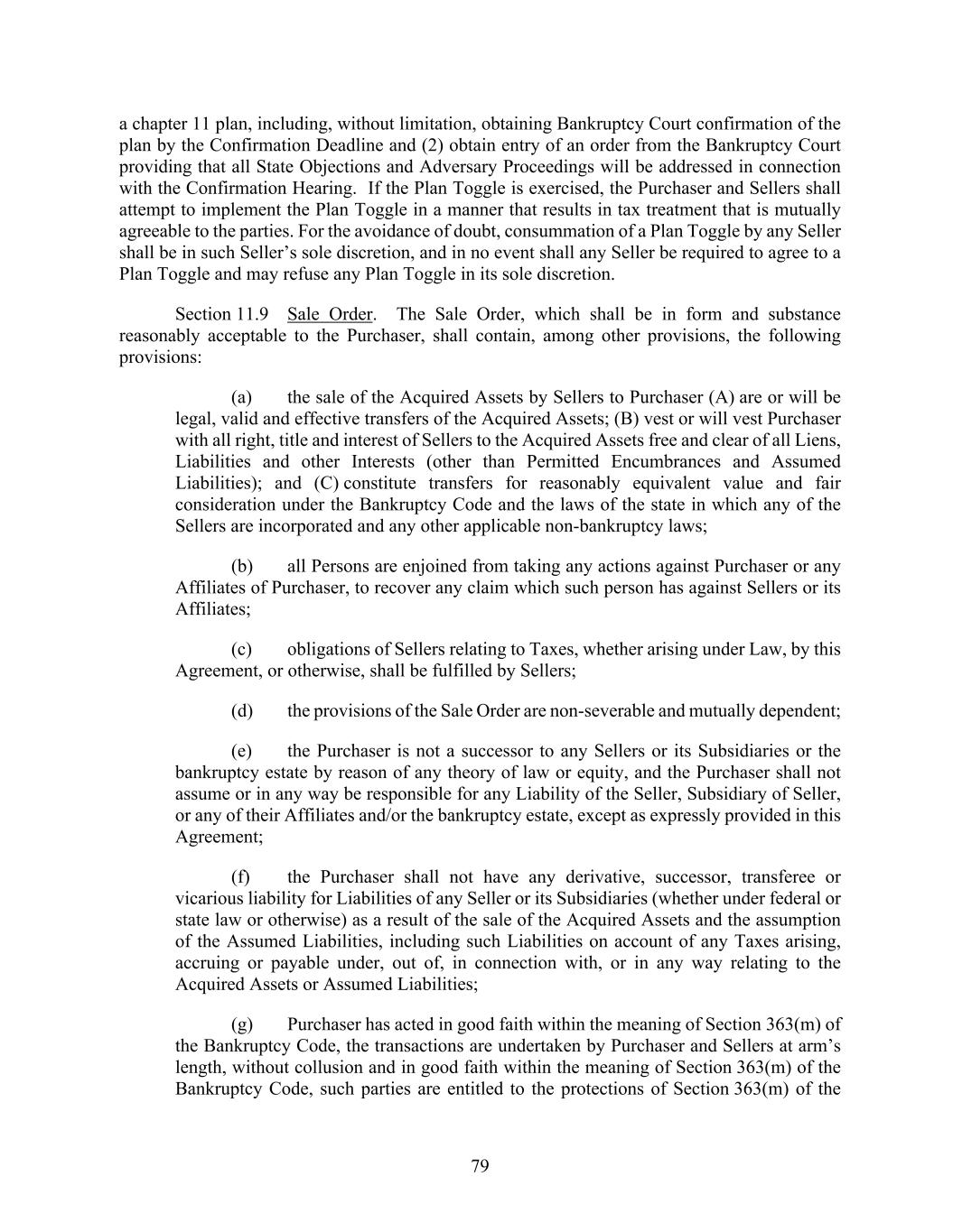 79 a chapter 11 plan, including, without limitation, obtaining Bankruptcy Court confirmation of the plan by the Confirmation Deadline and (2) obtain entry of an order from the Bankruptcy Court providing that all State Objections and Adversary Proceedings will be addressed in connection with the Confirmation Hearing. If the Plan Toggle is exercised, the Purchaser and Sellers shall attempt to implement the Plan Toggle in a manner that results in tax treatment that is mutually agreeable to the parties. For the avoidance of doubt, consummation of a Plan Toggle by any Seller shall be in such Seller’s sole discretion, and in no event shall any Seller be required to agree to a Plan Toggle and may refuse any Plan Toggle in its sole discretion. Section 11.9 Sale Order. The Sale Order, which shall be in form and substance reasonably acceptable to the Purchaser, shall contain, among other provisions, the following provisions: (a) the sale of the Acquired Assets by Sellers to Purchaser (A) are or will be legal, valid and effective transfers of the Acquired Assets; (B) vest or will vest Purchaser with all right, title and interest of Sellers to the Acquired Assets free and clear of all Liens, Liabilities and other Interests (other than Permitted Encumbrances and Assumed Liabilities); and (C) constitute transfers for reasonably equivalent value and fair consideration under the Bankruptcy Code and the laws of the state in which any of the Sellers are incorporated and any other applicable non-bankruptcy laws; (b) all Persons are enjoined from taking any actions against Purchaser or any Affiliates of Purchaser, to recover any claim which such person has against Sellers or its Affiliates; (c) obligations of Sellers relating to Taxes, whether arising under Law, by this Agreement, or otherwise, shall be fulfilled by Sellers; (d) the provisions of the Sale Order are non-severable and mutually dependent; (e) the Purchaser is not a successor to any Sellers or its Subsidiaries or the bankruptcy estate by reason of any theory of law or equity, and the Purchaser shall not assume or in any way be responsible for any Liability of the Seller, Subsidiary of Seller, or any of their Affiliates and/or the bankruptcy estate, except as expressly provided in this Agreement; (f) the Purchaser shall not have any derivative, successor, transferee or vicarious liability for Liabilities of any Seller or its Subsidiaries (whether under federal or state law or otherwise) as a result of the sale of the Acquired Assets and the assumption of the Assumed Liabilities, including such Liabilities on account of any Taxes arising, accruing or payable under, out of, in connection with, or in any way relating to the Acquired Assets or Assumed Liabilities; (g) Purchaser has acted in good faith within the meaning of Section 363(m) of the Bankruptcy Code, the transactions are undertaken by Purchaser and Sellers at arm’s length, without collusion and in good faith within the meaning of Section 363(m) of the Bankruptcy Code, such parties are entitled to the protections of Section 363(m) of the